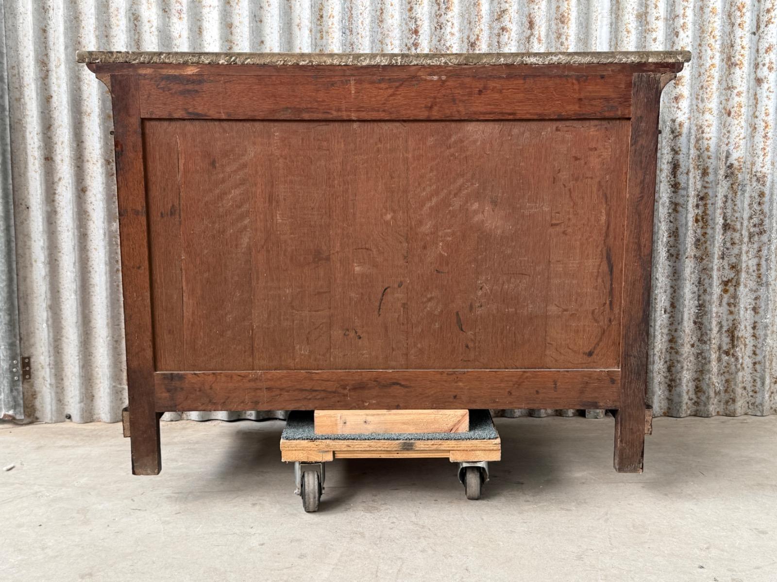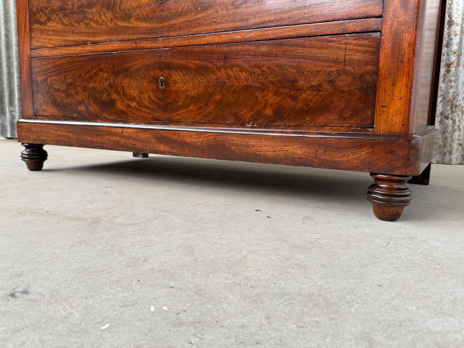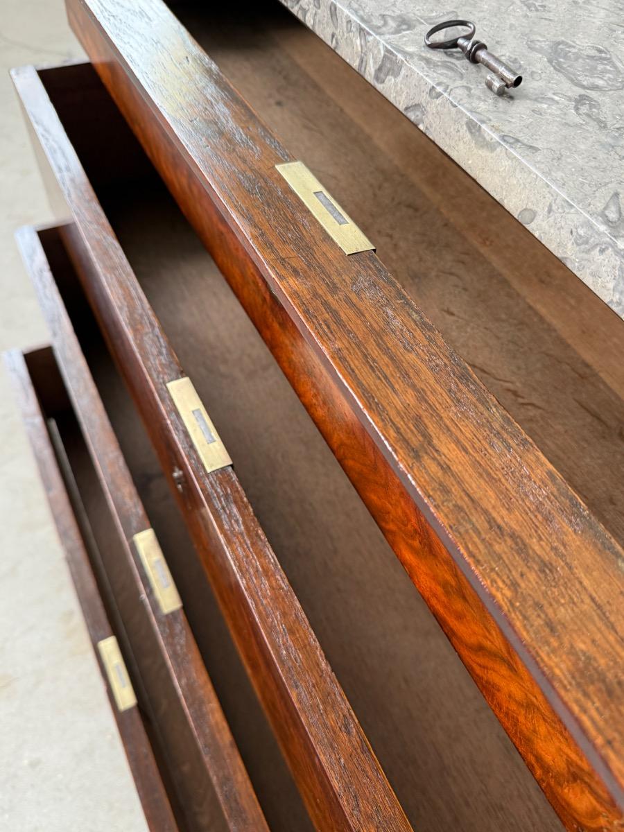 Commode met 4 laden waarvan 1 lade in de kap. Midden 19e eeuw met messing entré beslag, alle (oorspronkelijke) sloten aanwezig en werkend met een sleutel.