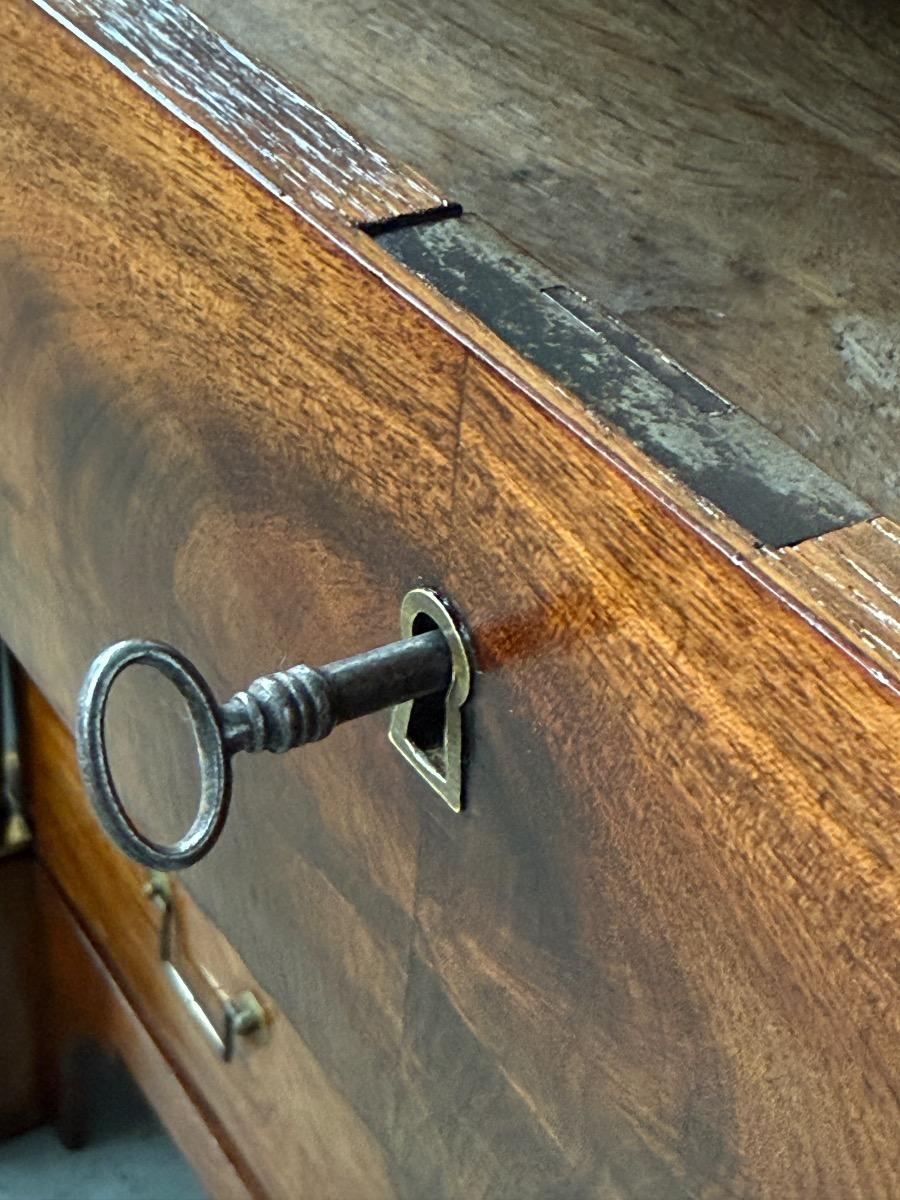 Cuba bloem mahonie gefineerd op eiken. Vol eiken rug en binnenladen. In aardige en direct te gebruiken staat. Maar kan wel een restauratie gebruiken.