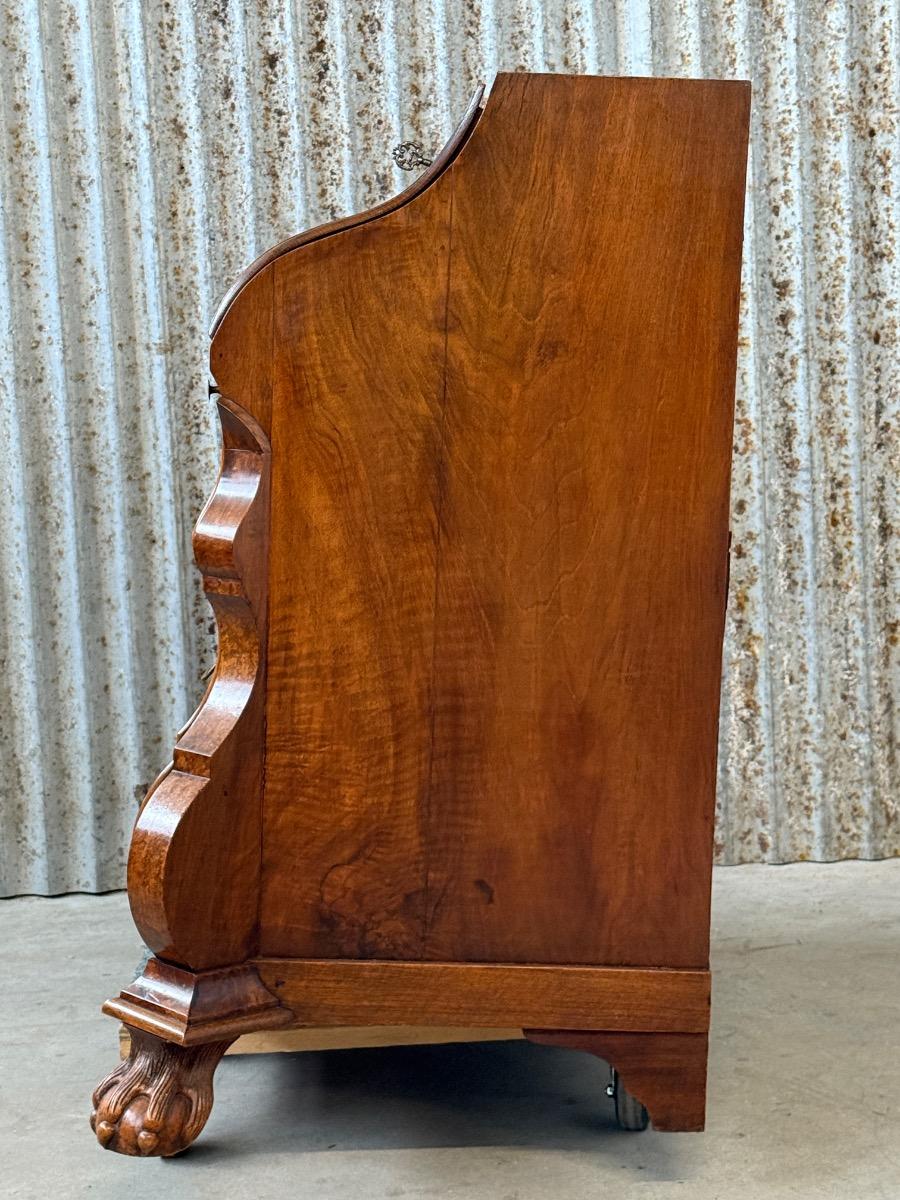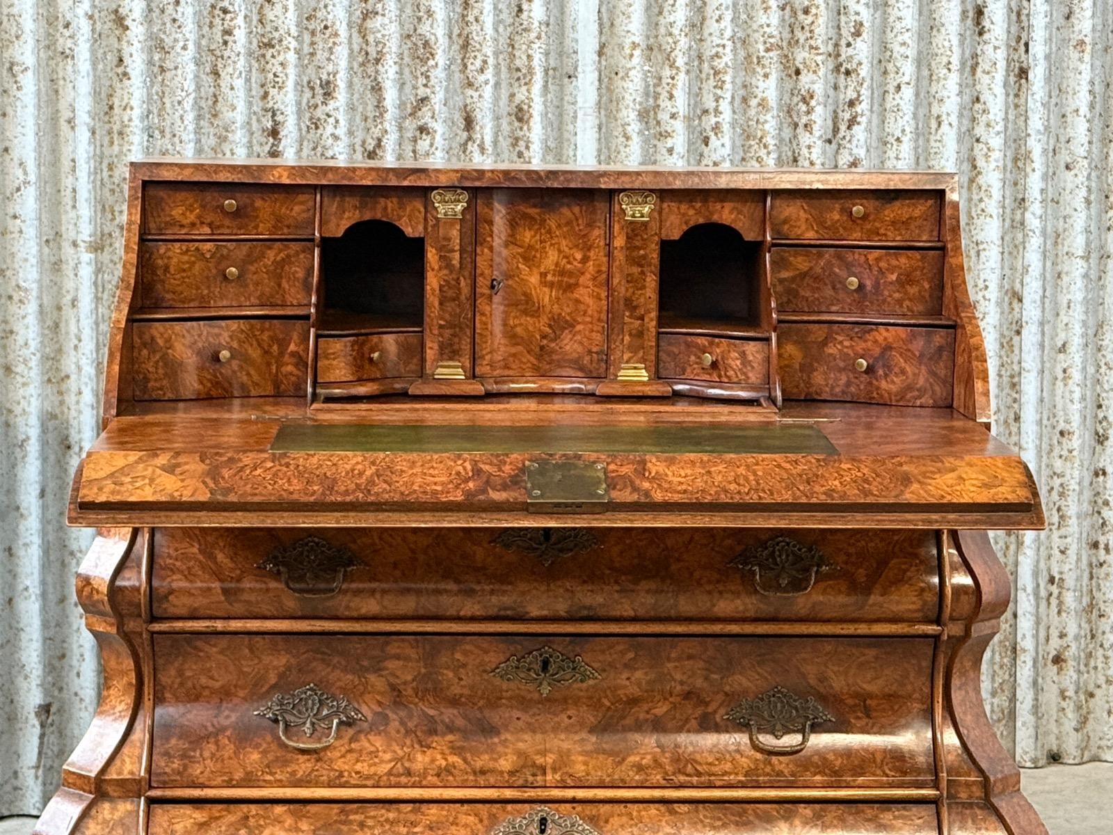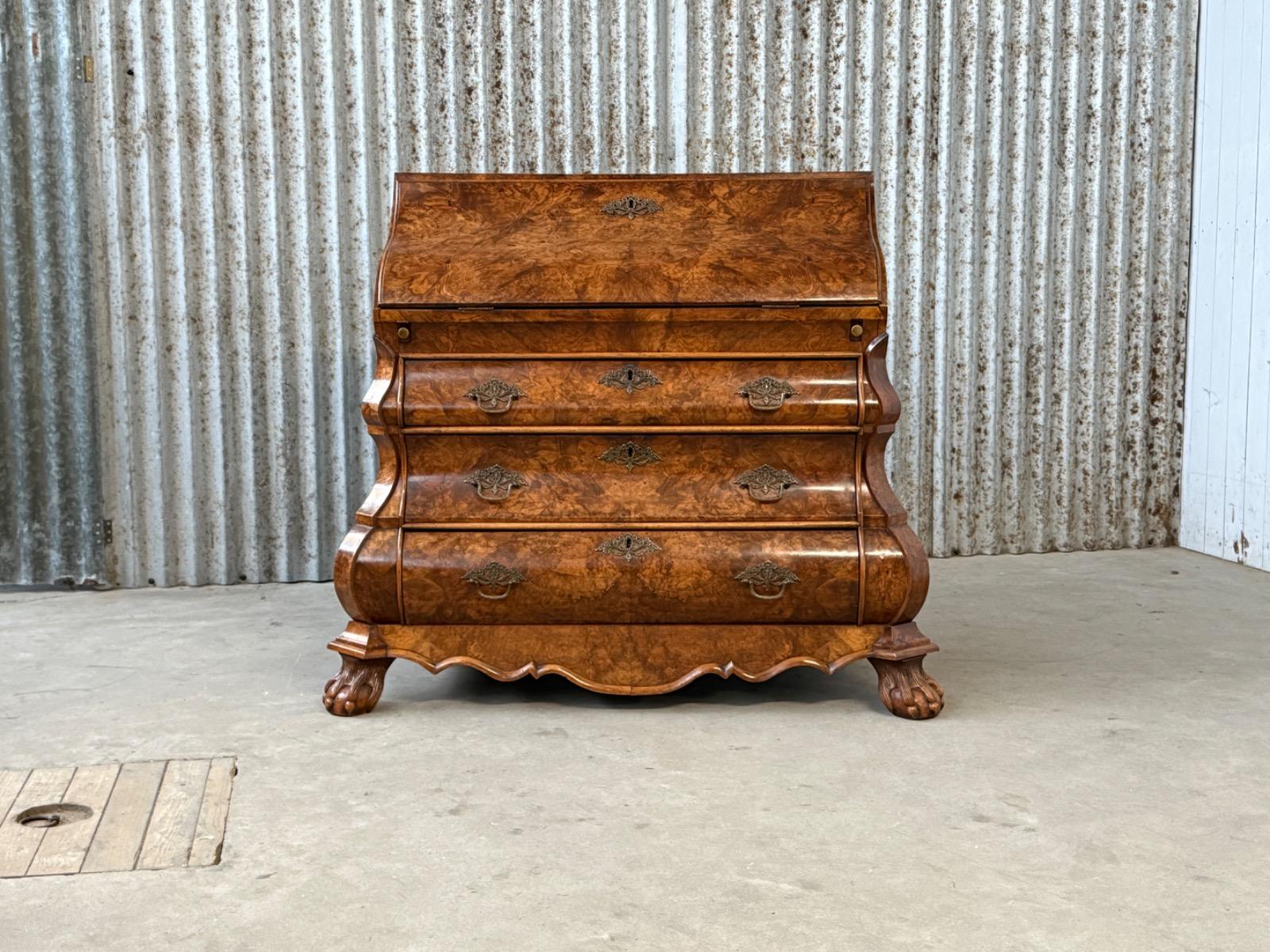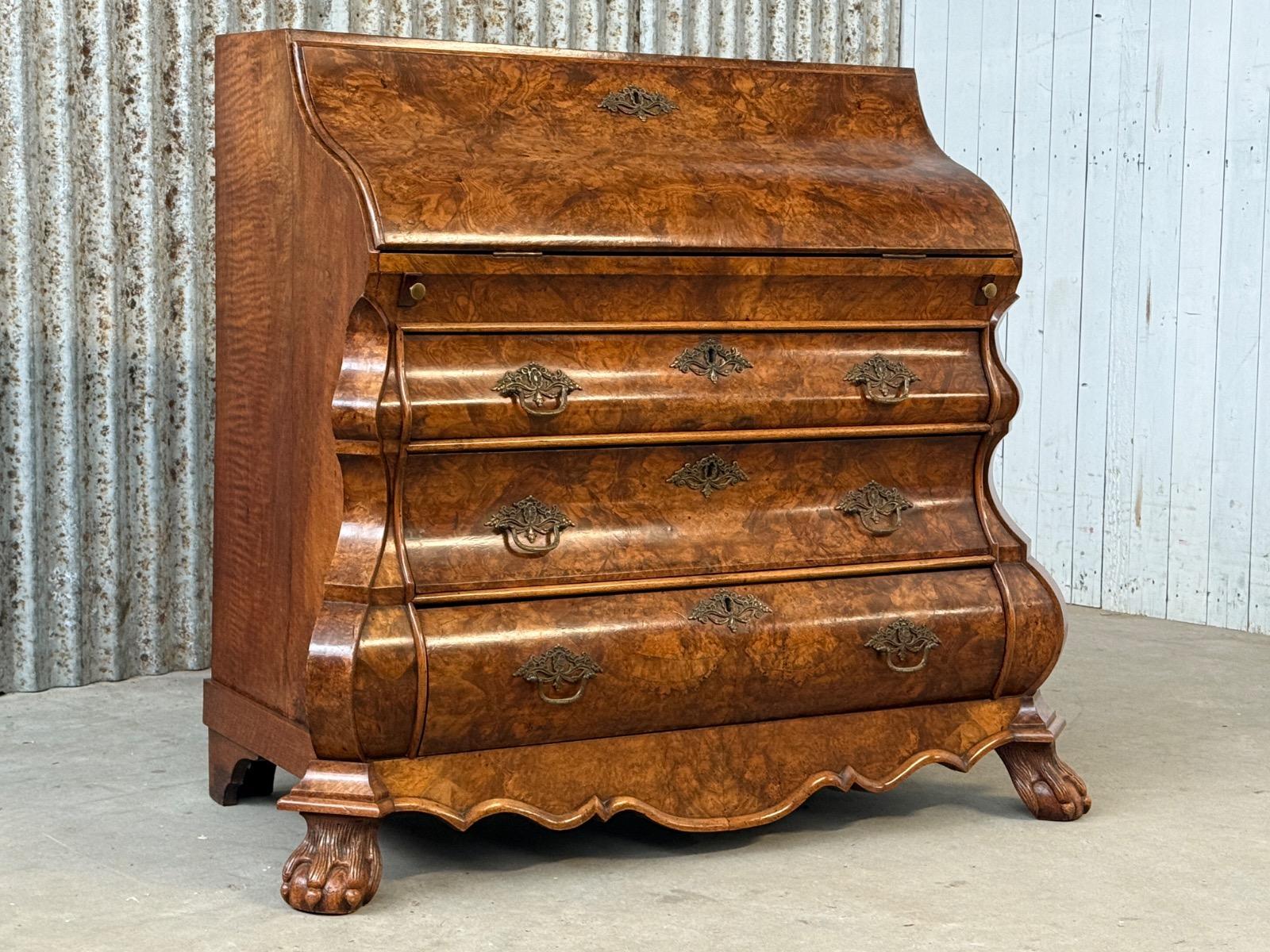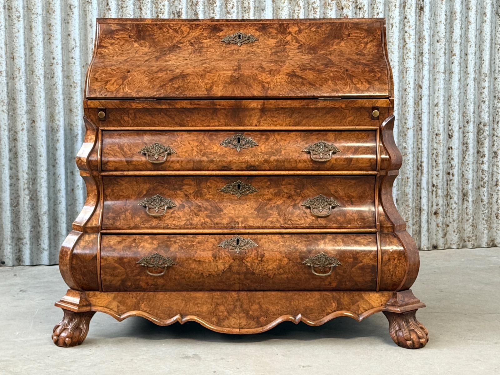 Smal of klein Hollands wortelnoten klepbureau, midden 18e eeuw. Met ‘S’ vorm klep, gegoten messing beslag, knopjes en scharnieren. Op "bol-klauw poten".