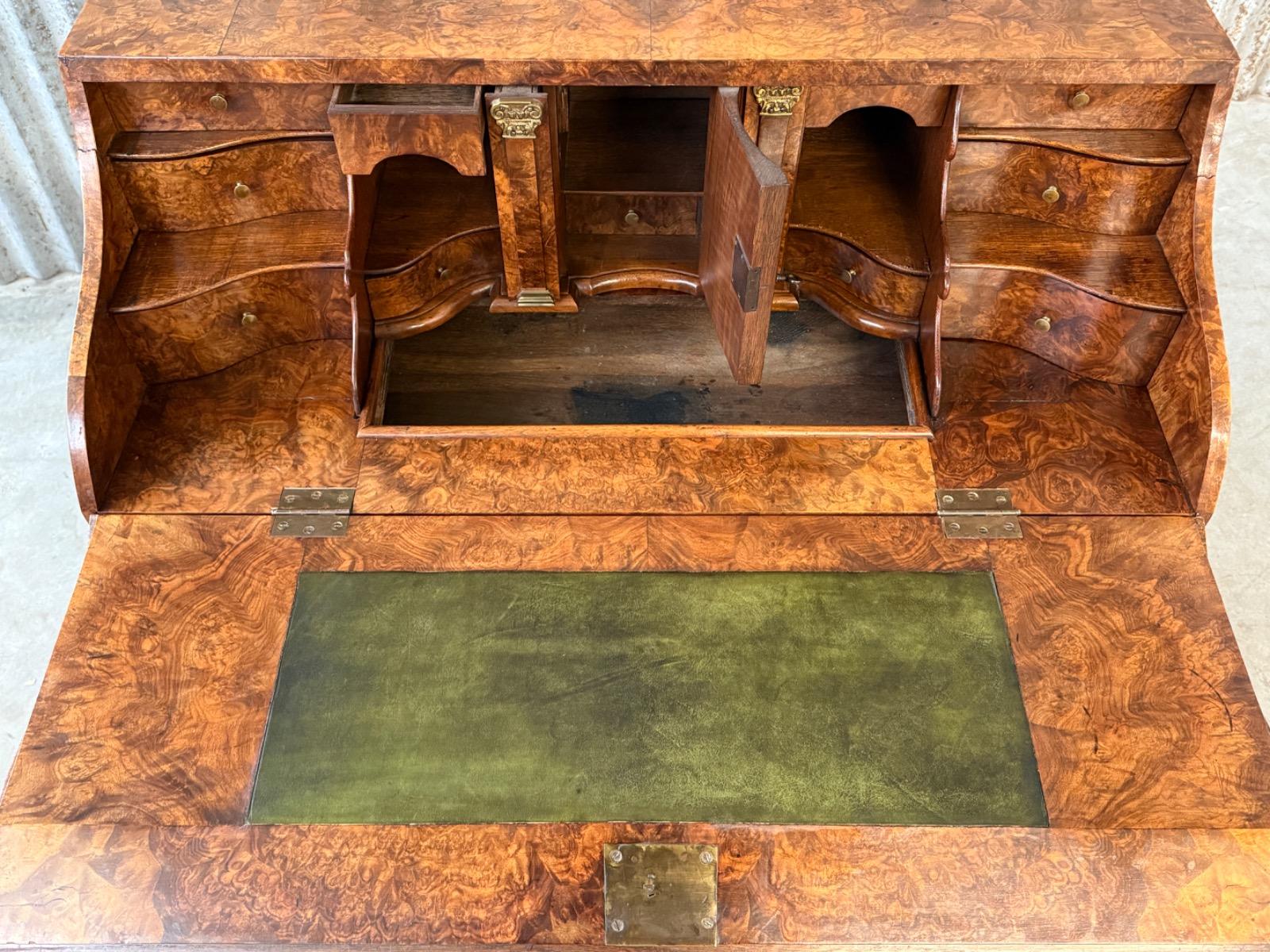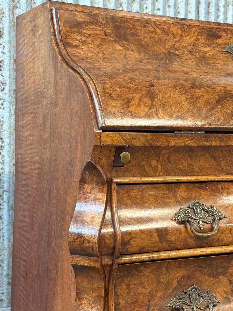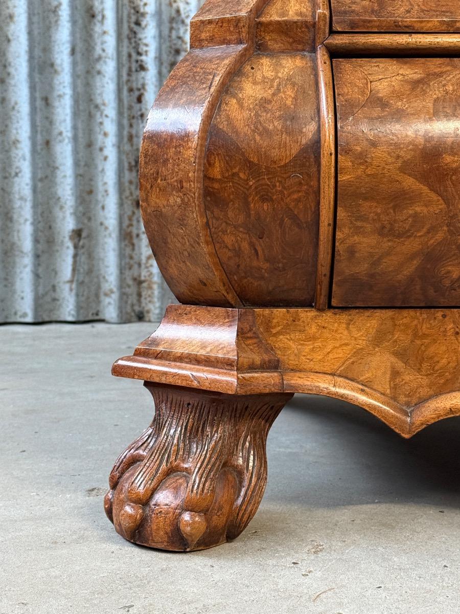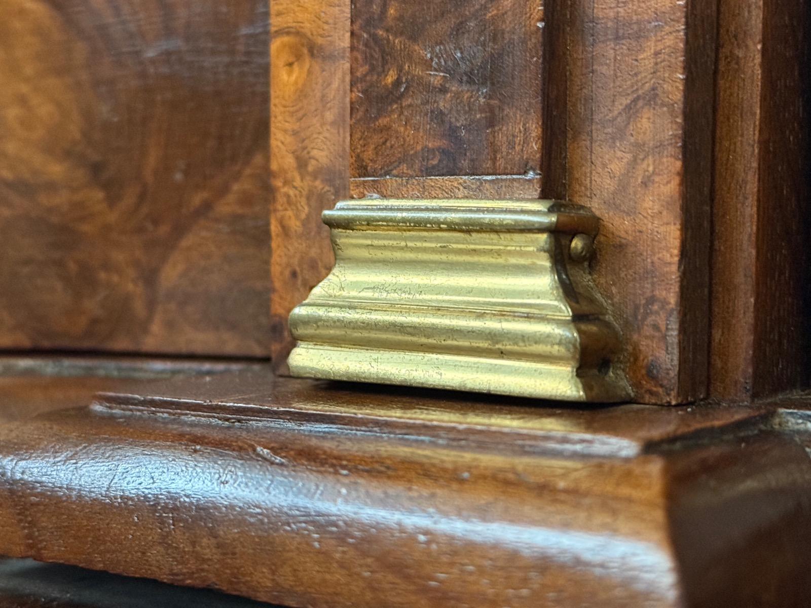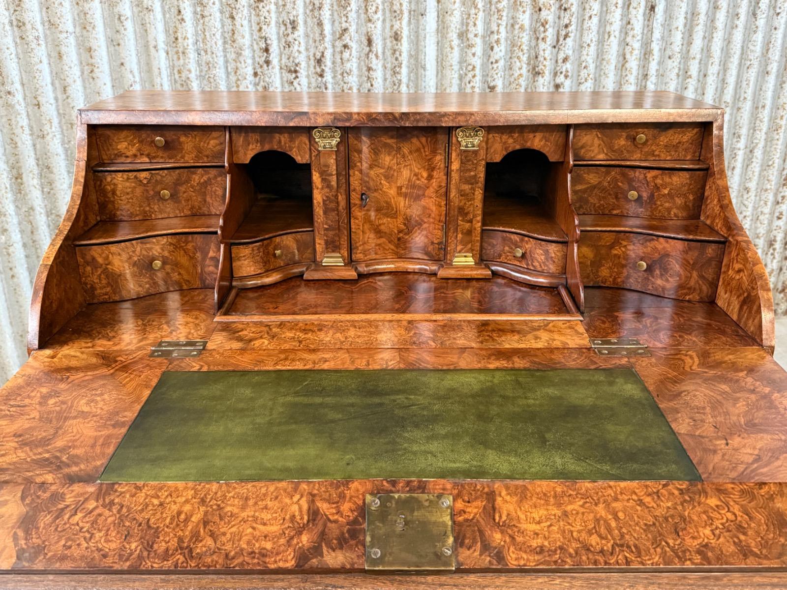 Smal of klein Hollands wortelnoten klepbureau, midden 18e eeuw. Met ‘S’ vorm klep, gegoten messing beslag, knopjes en scharnieren. Op "bol-klauw poten".