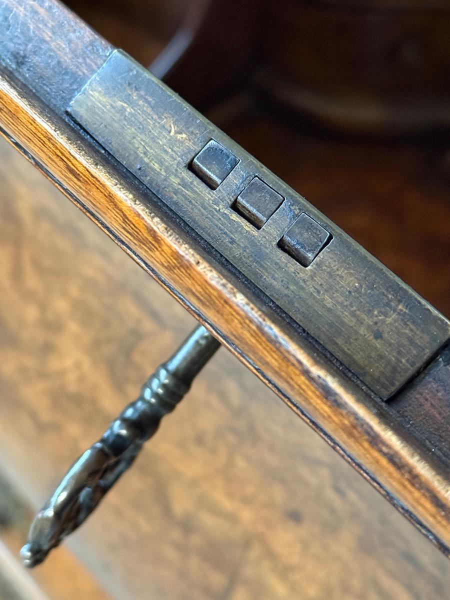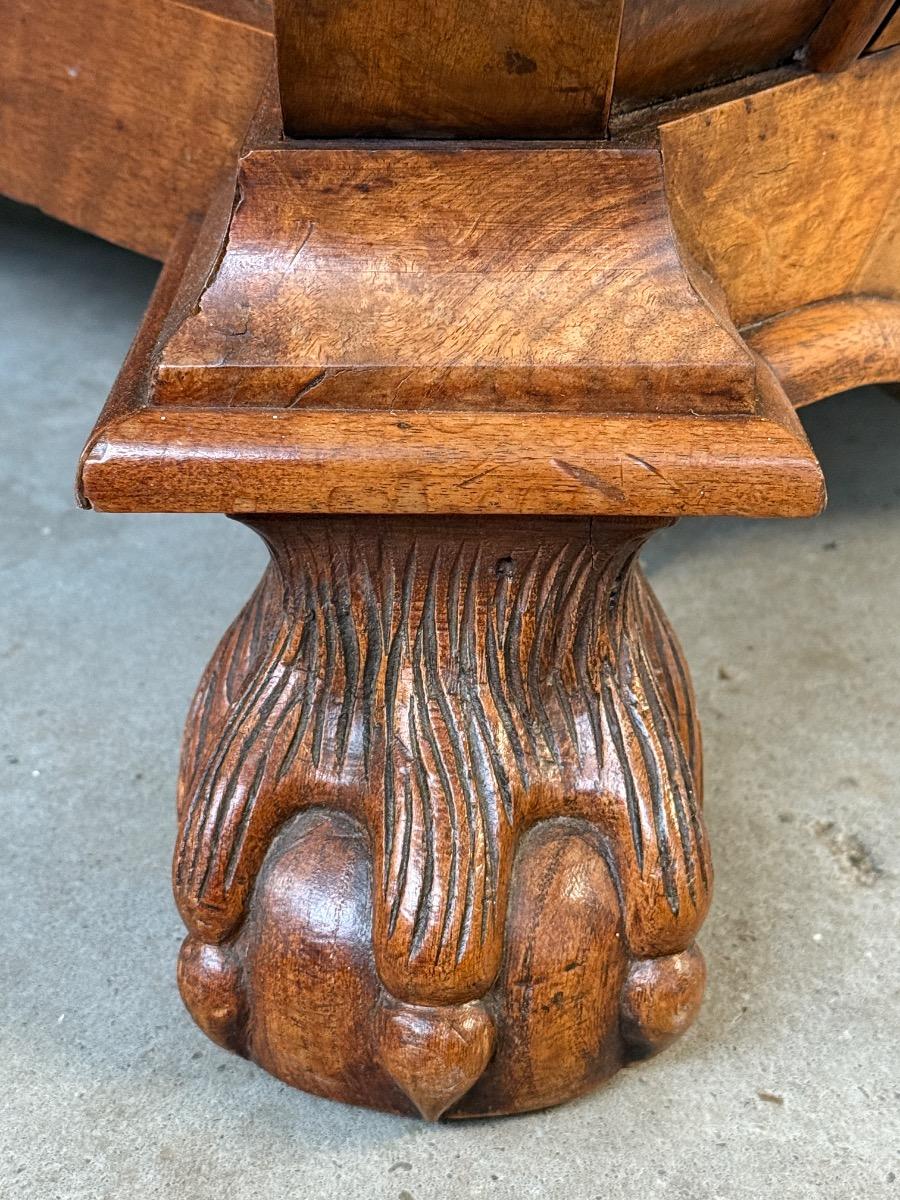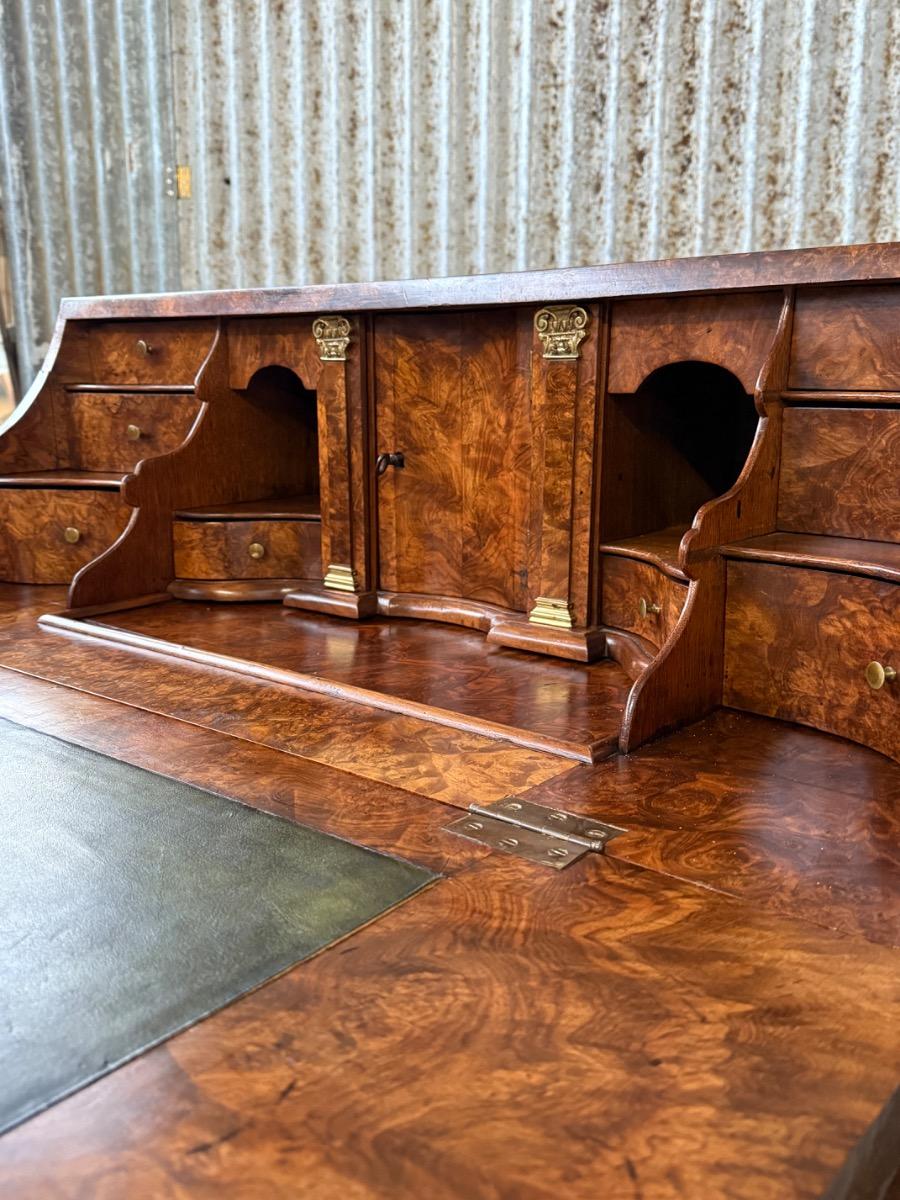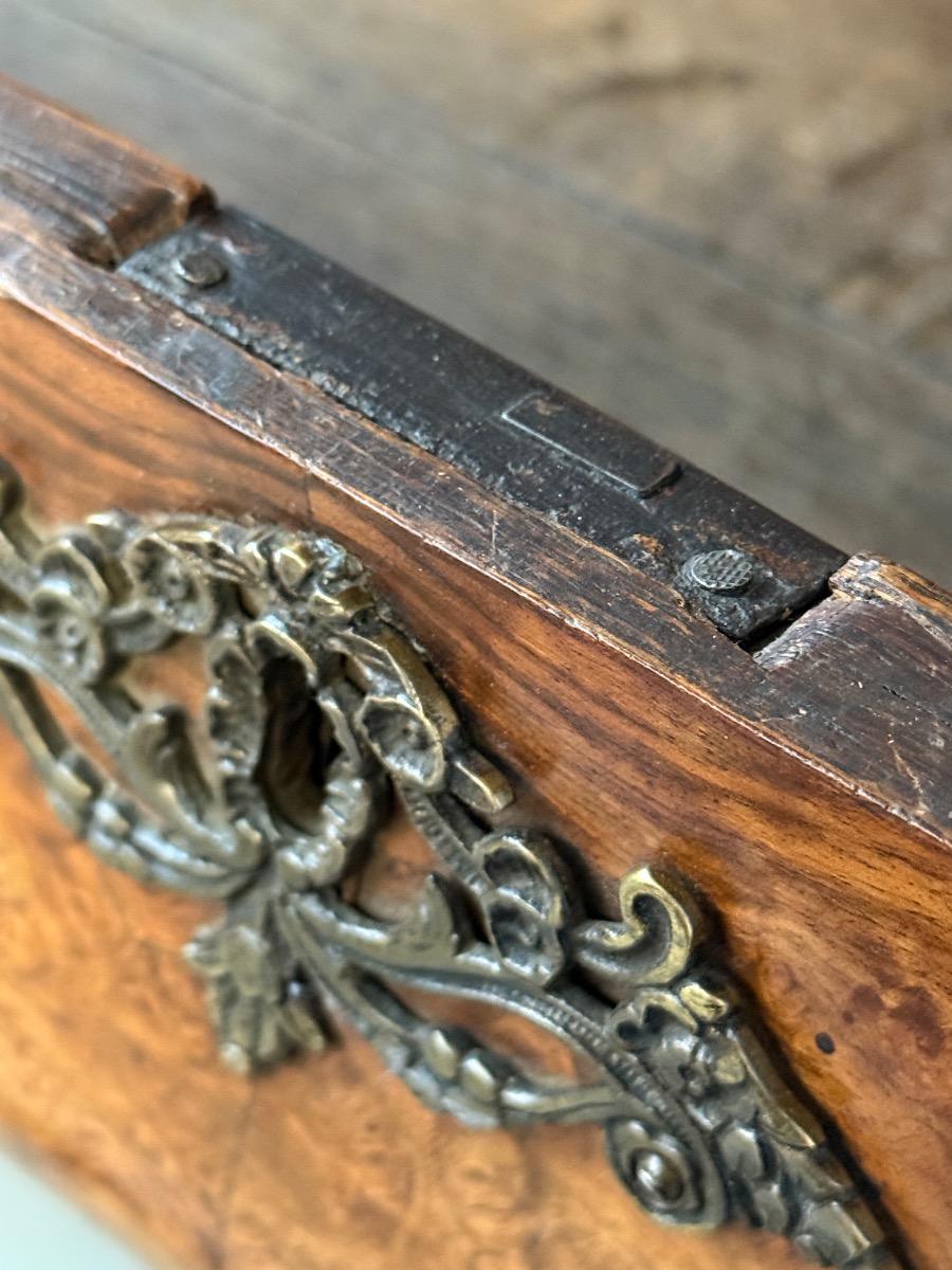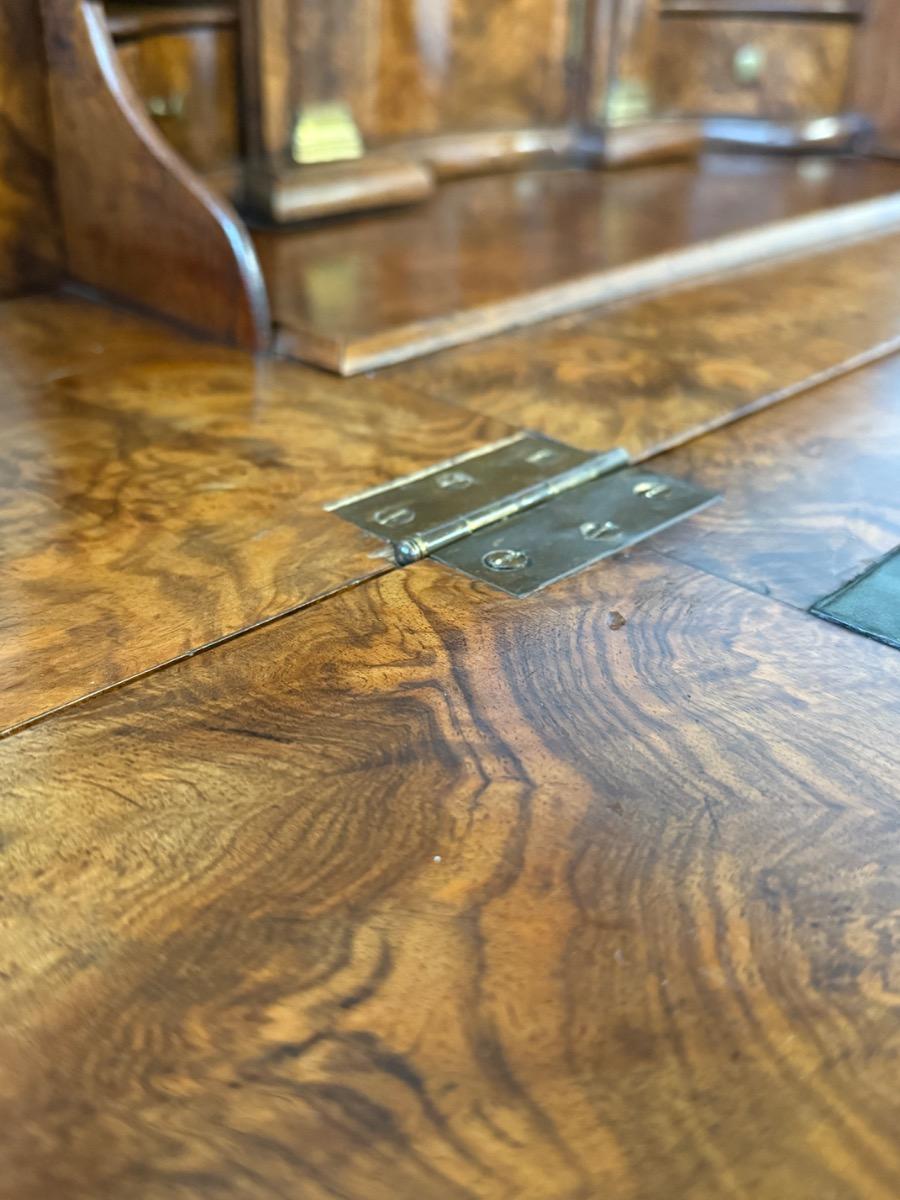 Smal of klein Hollands wortelnoten klepbureau, midden 18e eeuw. Met ‘S’ vorm klep, gegoten messing beslag, knopjes en scharnieren. Op "bol-klauw poten".