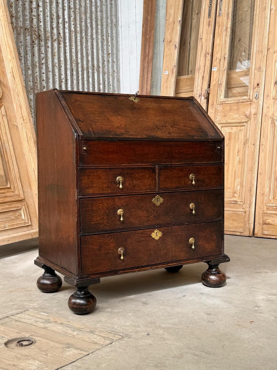 Uitzonderlijk smal eiken houten klep bureau met verguld messing beslag, knopjes en scharnieren van massief koper. Op massive bol poten "compressed bun feet".
