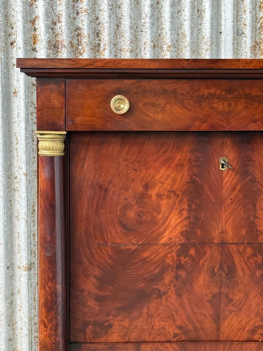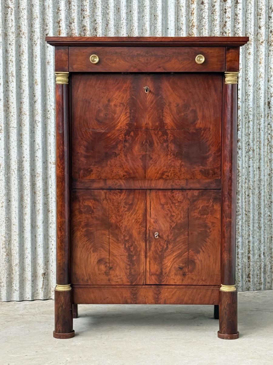 Overstekende kap lade met rond deels verguld beslag. Flinke klep, ingelegd met groen kalfsleder, voorzien van oorspronkelijk slot èn werkende sleutel