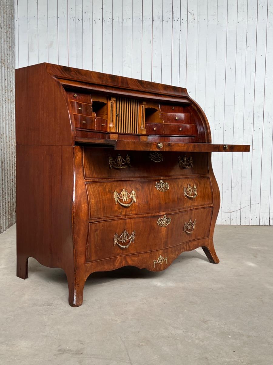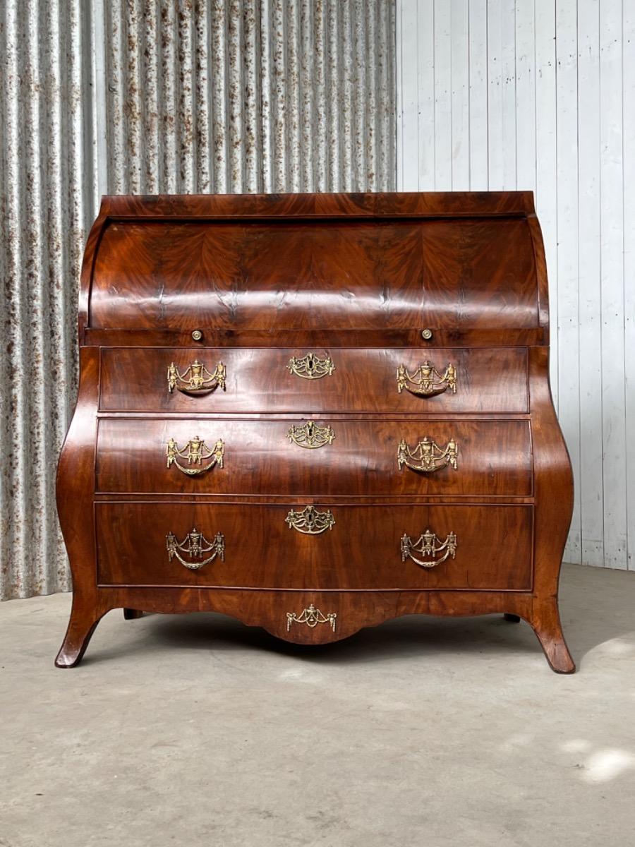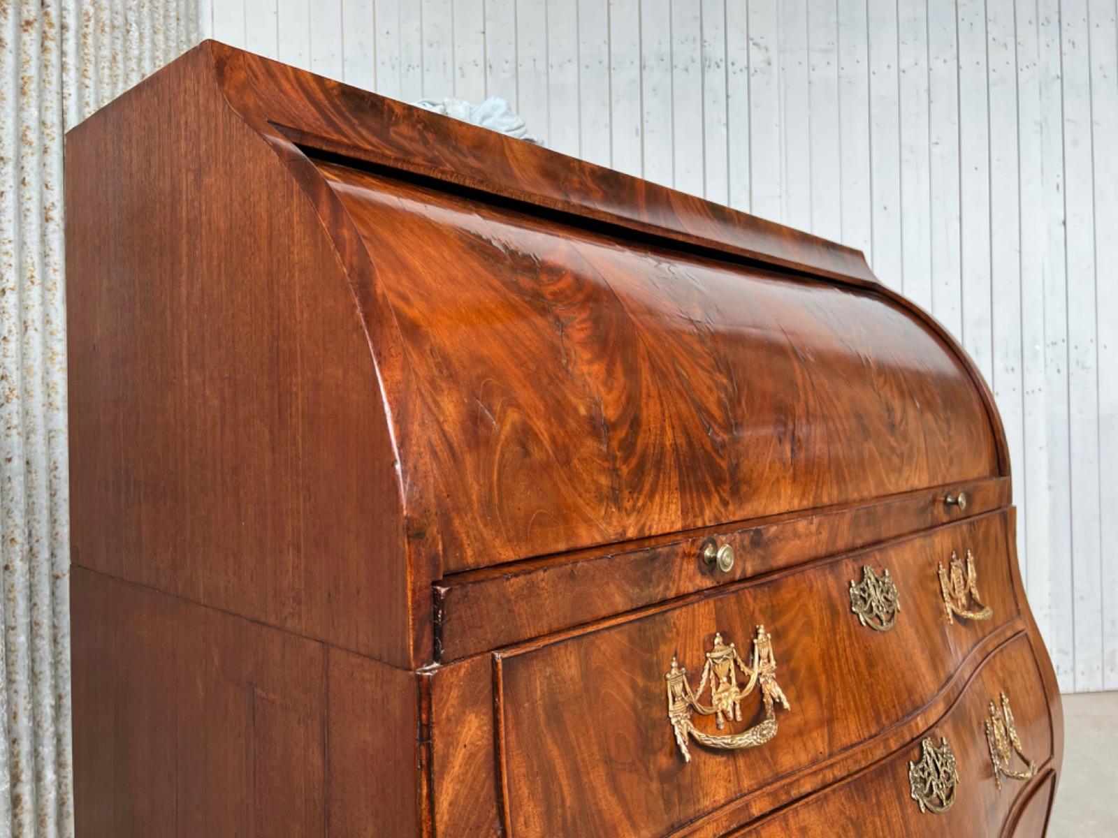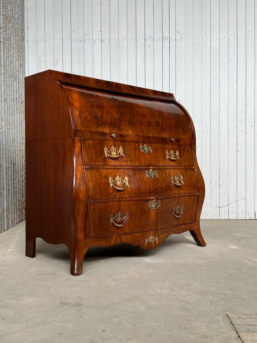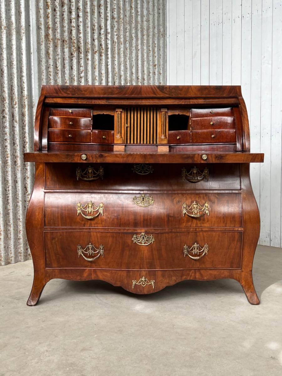 Transition gebombeerd cilinder bureau, fraai boek bloemmahonie gefineerd. Het interieur vol met laden, Jalousie deurtje met verborgen laden. Vuurverguld gegoten brons trek beslag. Uittrek blad loopt zeer goed is tevens ingelegd met olijf groen zeildoek. Holland Ca. 1775. Afm: H= 117 cm. B= 113-122 cm. D= 30-60 cm. (84 cm. met uitgetrokken blad) Onlangs grondig nagelopen op losse delen van constructie en fineer. Houtworm controle : Geen levende houtworm aangetroffen op 30/3/2022 Cil-2389~