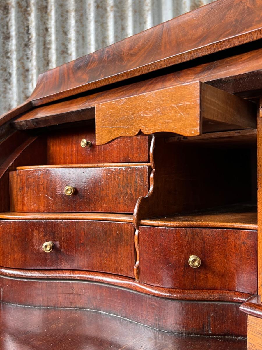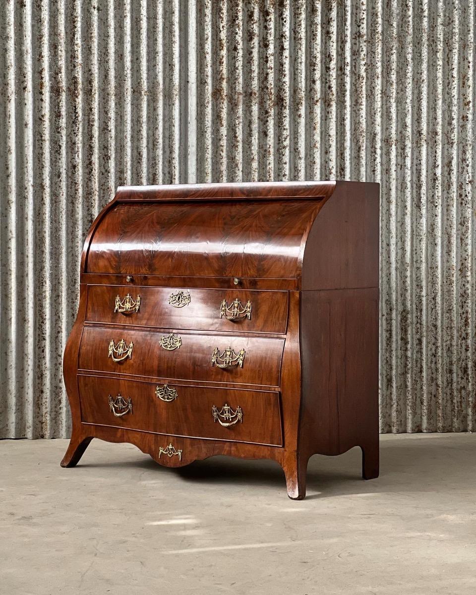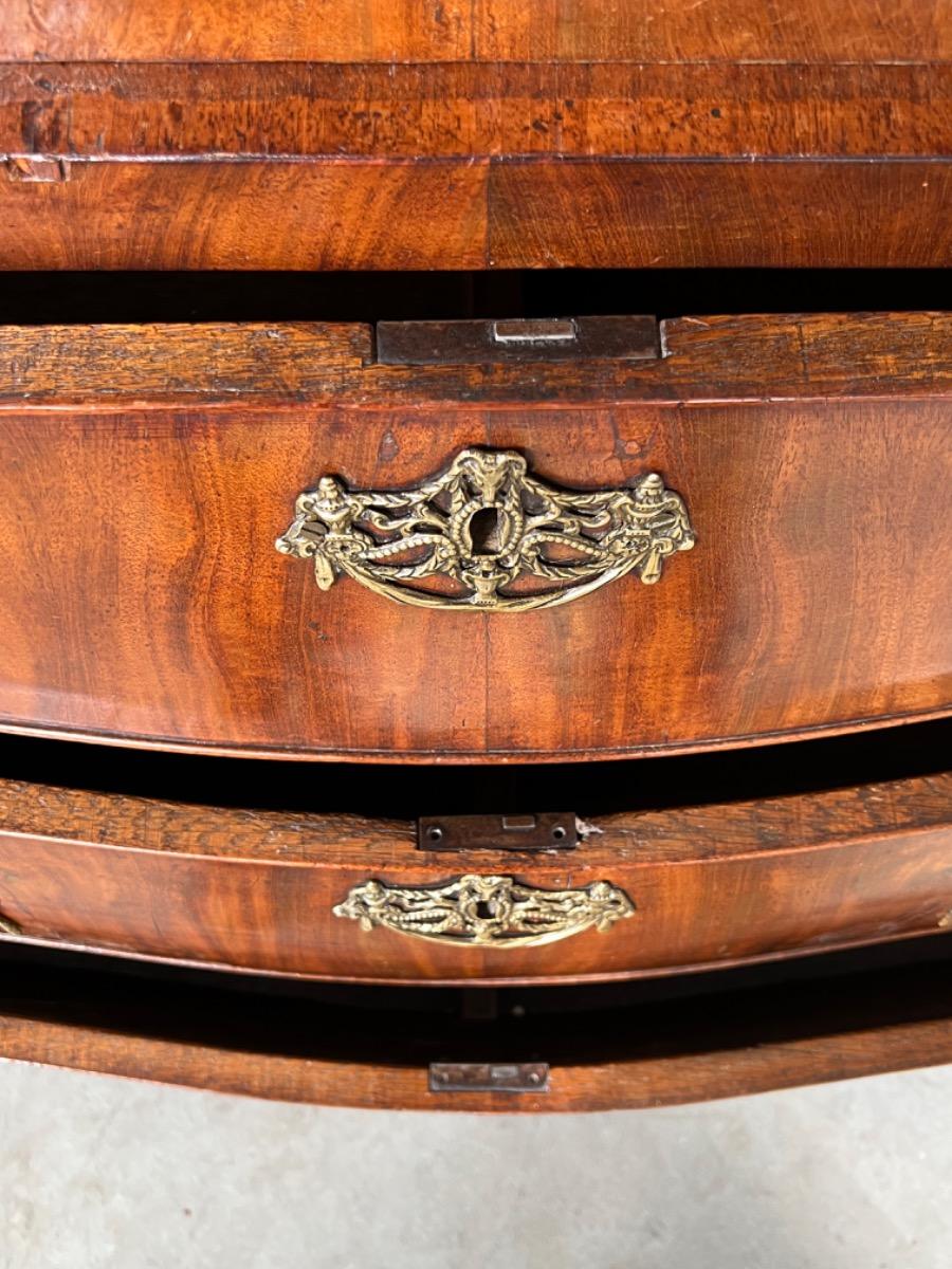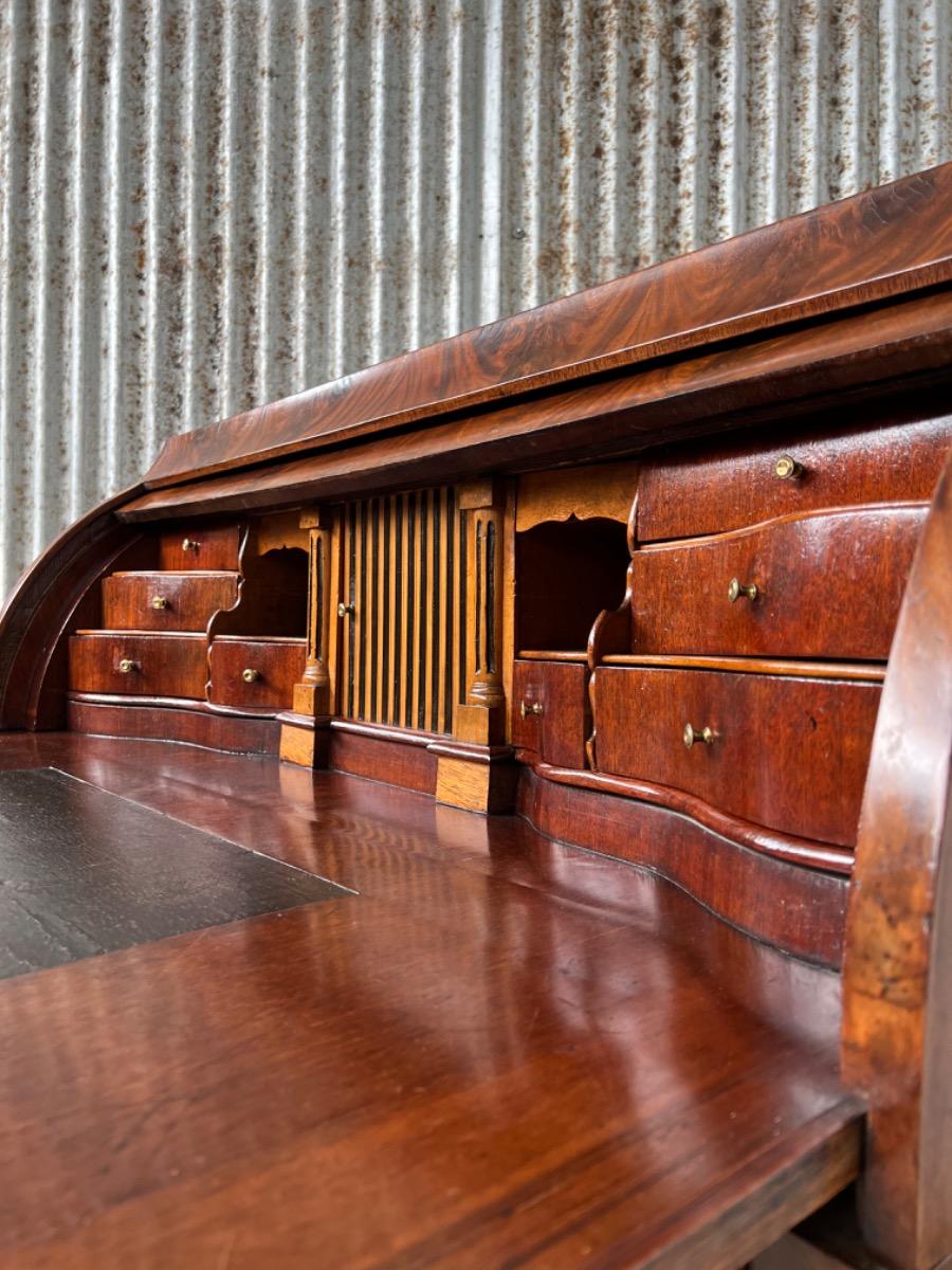 Transition gebombeerd cilinder bureau, fraai boek bloemmahonie gefineerd. Het interieur vol met laden, Jalousie deurtje met verborgen laden. Vuurverguld gegoten brons trek beslag. Uittrek blad loopt zeer goed is tevens ingelegd met olijf groen zeildoek. Holland Ca. 1775. Afm: H= 117 cm. B= 113-122 cm. D= 30-60 cm. (84 cm. met uitgetrokken blad) Onlangs grondig nagelopen op losse delen van constructie en fineer. Houtworm controle : Geen levende houtworm aangetroffen op 30/3/2022 Cil-2389~