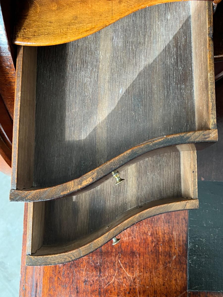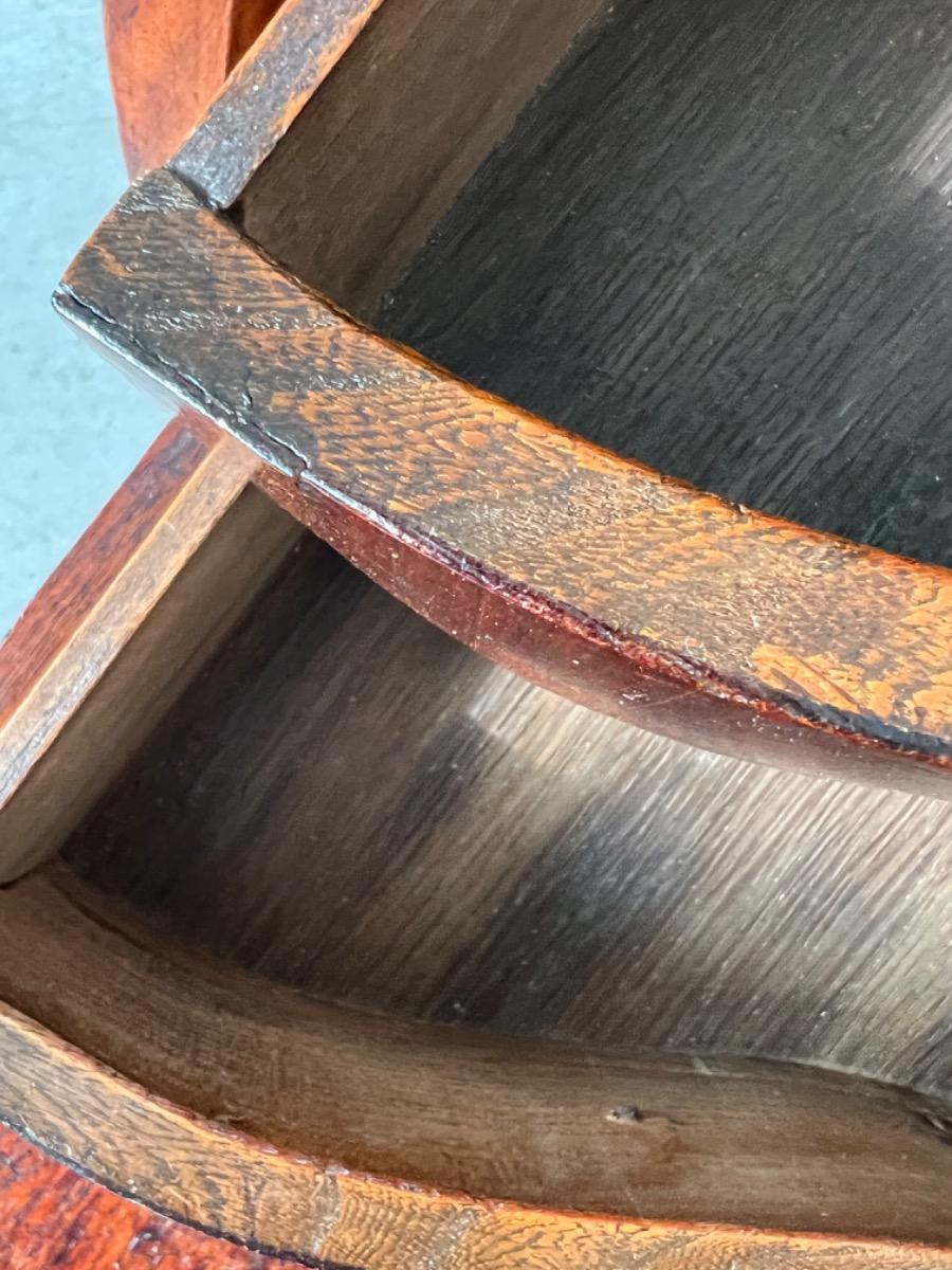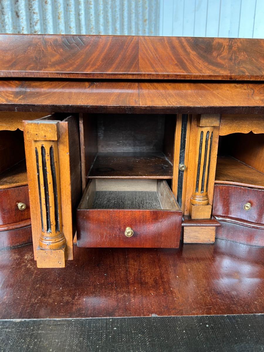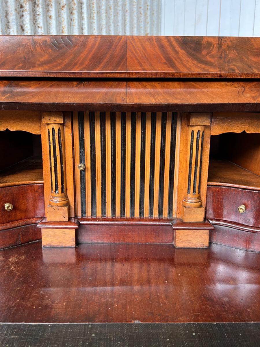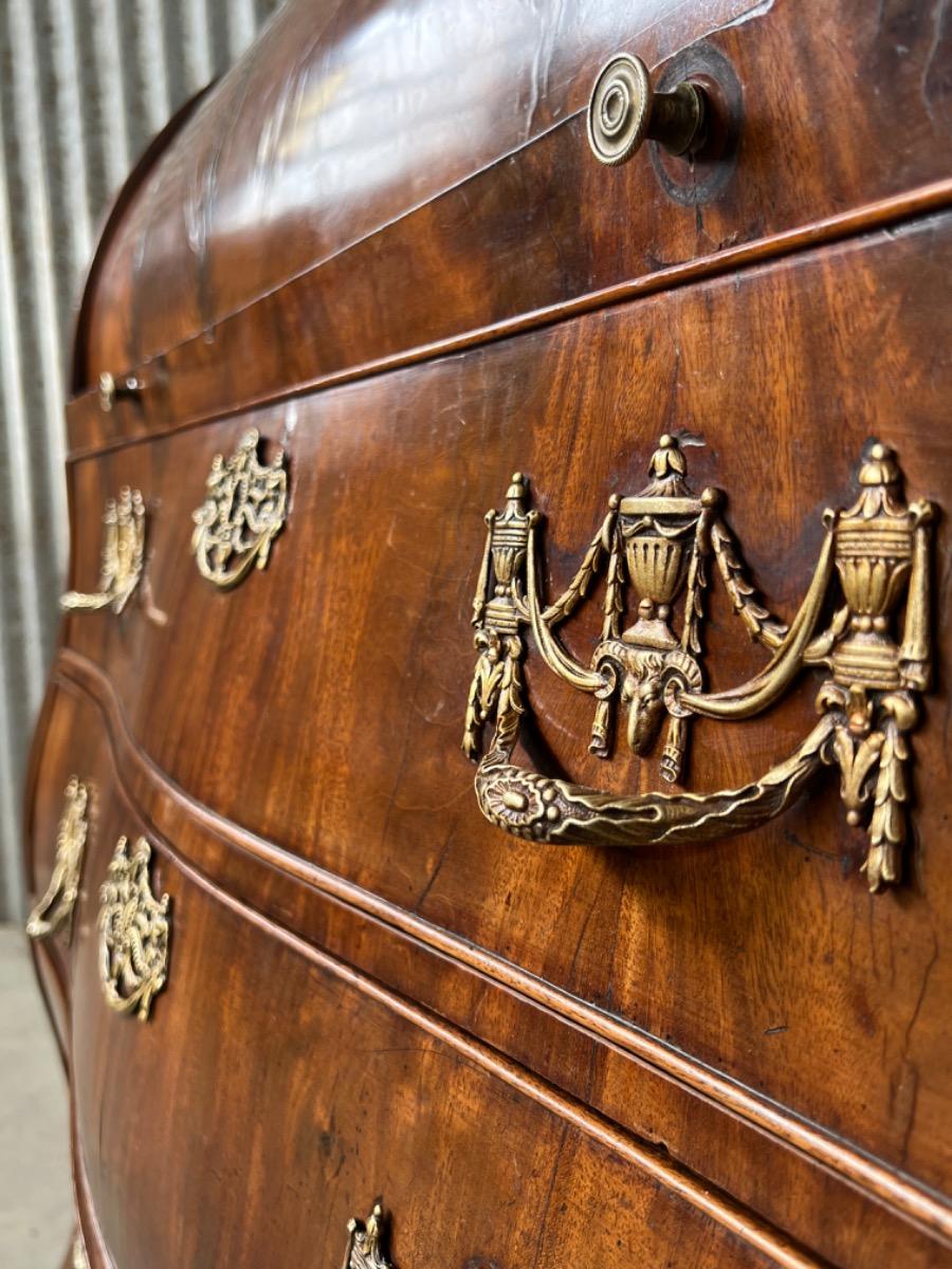 Transition gebombeerd cilinder bureau, fraai boek bloemmahonie gefineerd. Het interieur vol met laden, Jalousie deurtje met verborgen laden. Vuurverguld gegoten brons trek beslag. Uittrek blad loopt zeer goed is tevens ingelegd met olijf groen zeildoek. Holland Ca. 1775. Afm: H= 117 cm. B= 113-122 cm. D= 30-60 cm. (84 cm. met uitgetrokken blad) Onlangs grondig nagelopen op losse delen van constructie en fineer. Houtworm controle : Geen levende houtworm aangetroffen op 30/3/2022 Cil-2389~