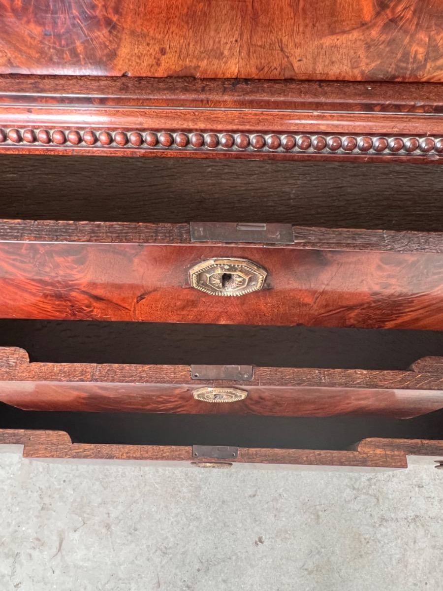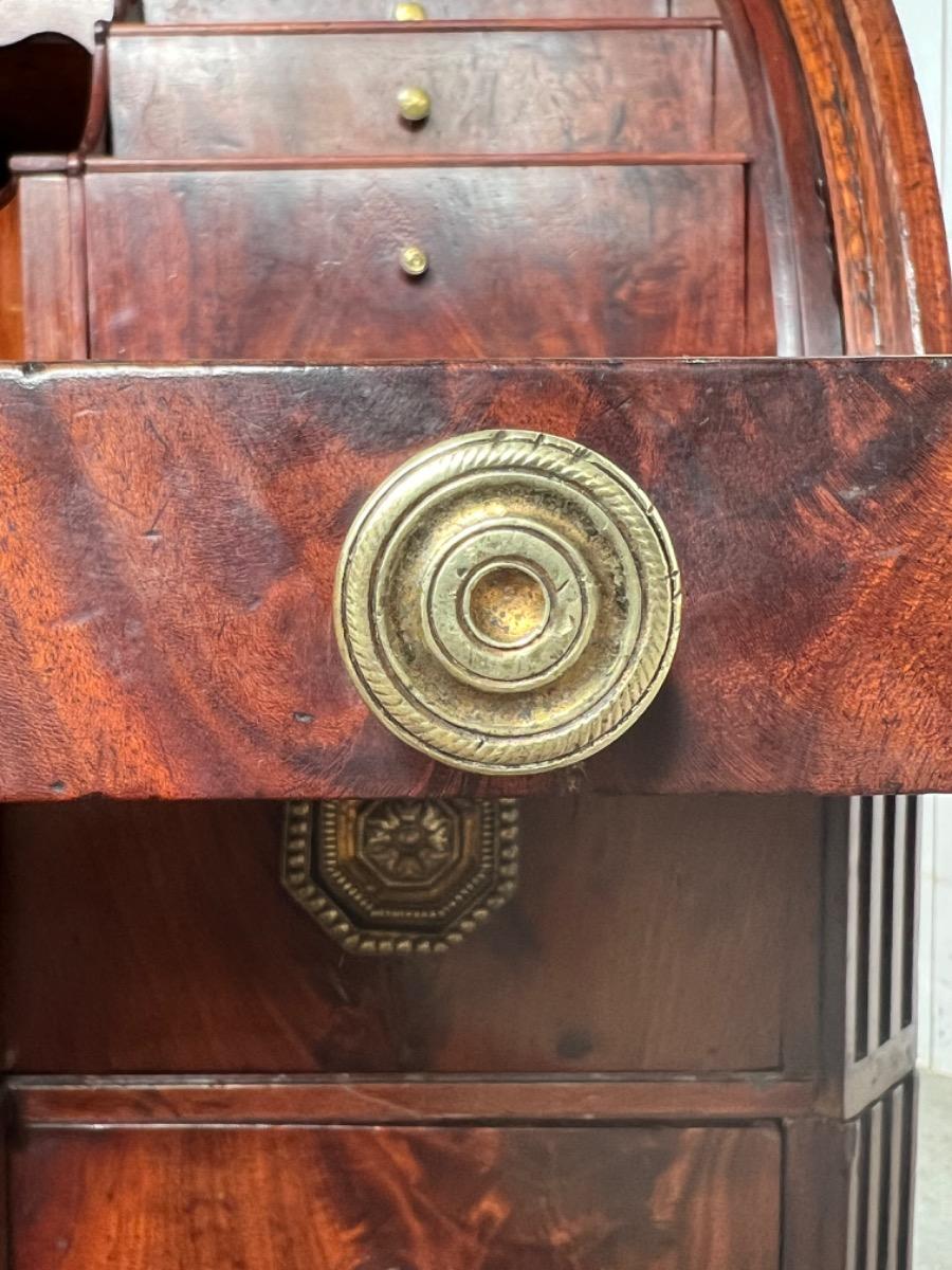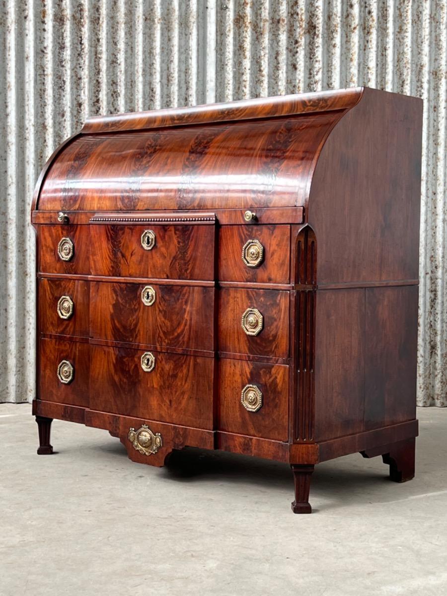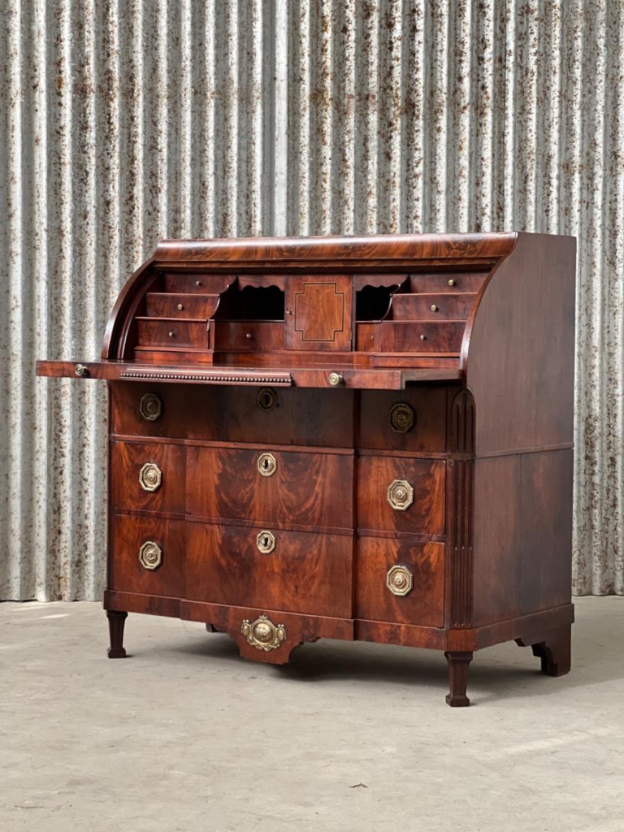 Achter de cilinder diverse kleine laden, deurtje met slot ook Cuba mahonie gefineerd en ingelegd met een ebbenhouten bies.