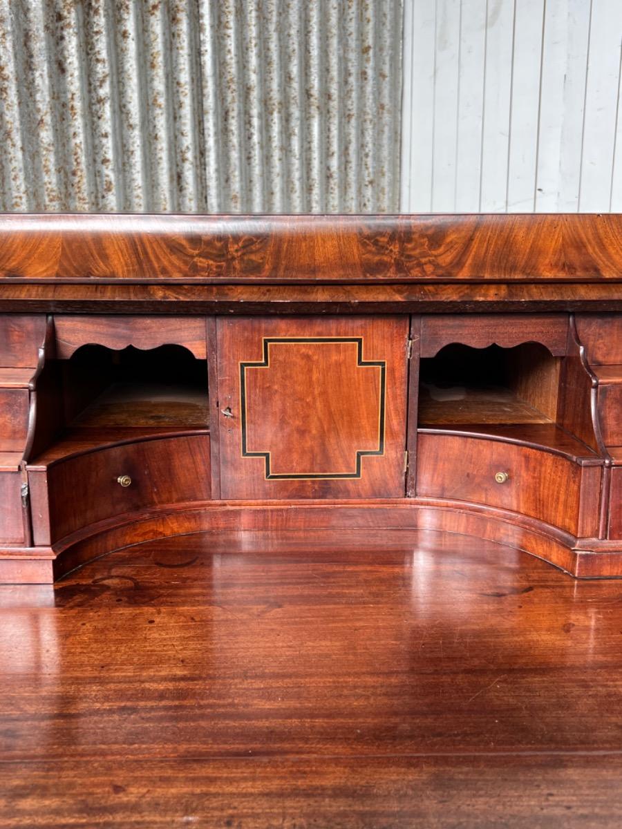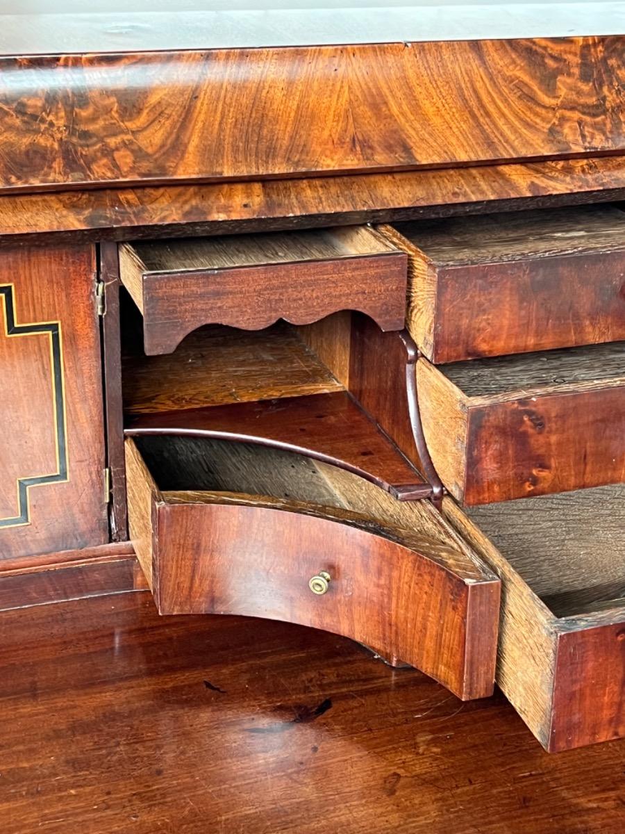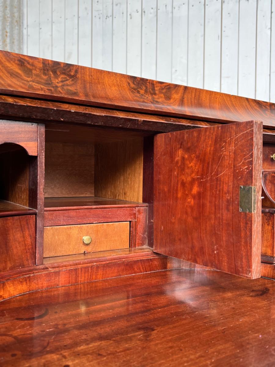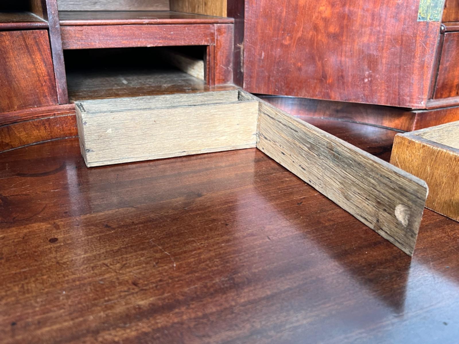 Achter de cilinder diverse kleine laden, deurtje met slot ook Cuba mahonie gefineerd en ingelegd met een ebbenhouten bies.