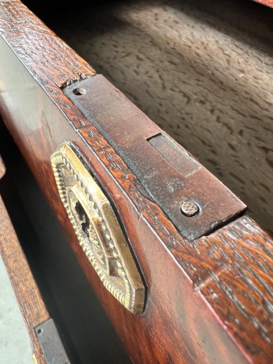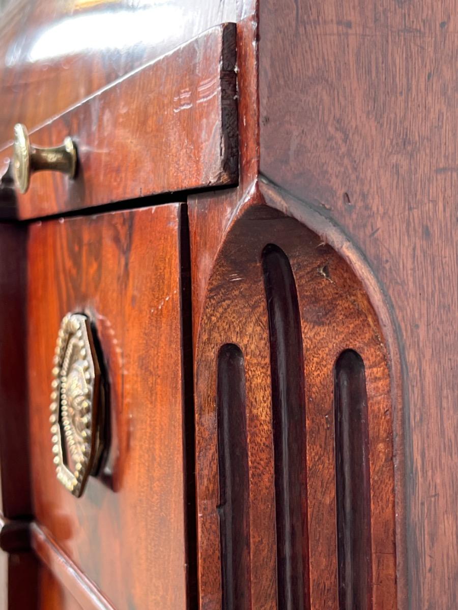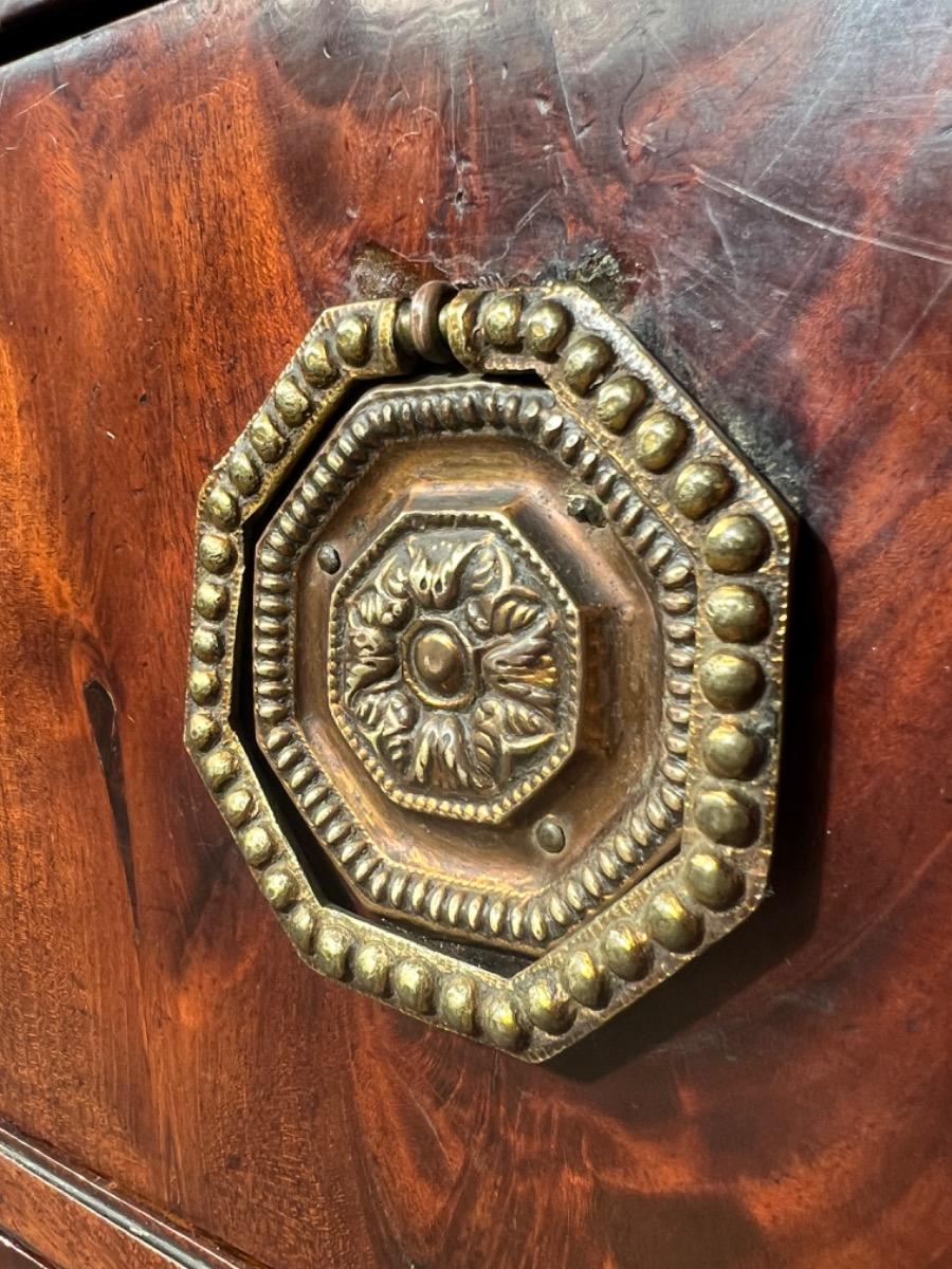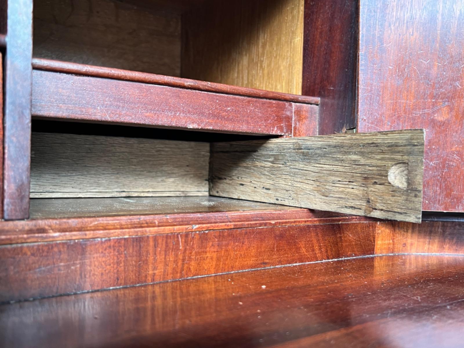 Achter de cilinder diverse kleine laden, deurtje met slot ook Cuba mahonie gefineerd en ingelegd met een ebbenhouten bies.