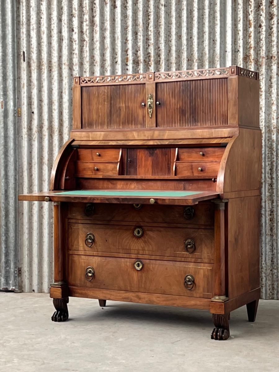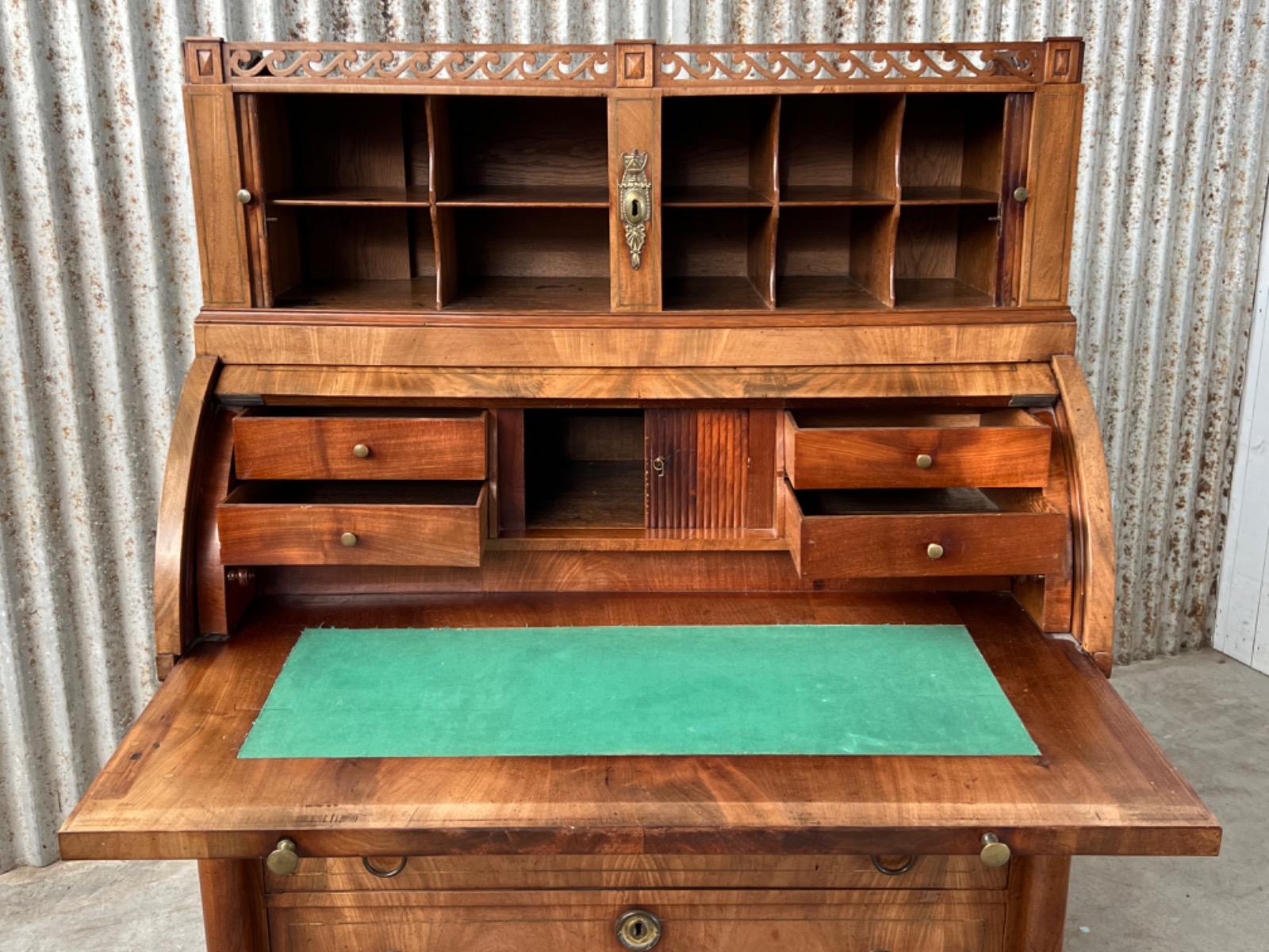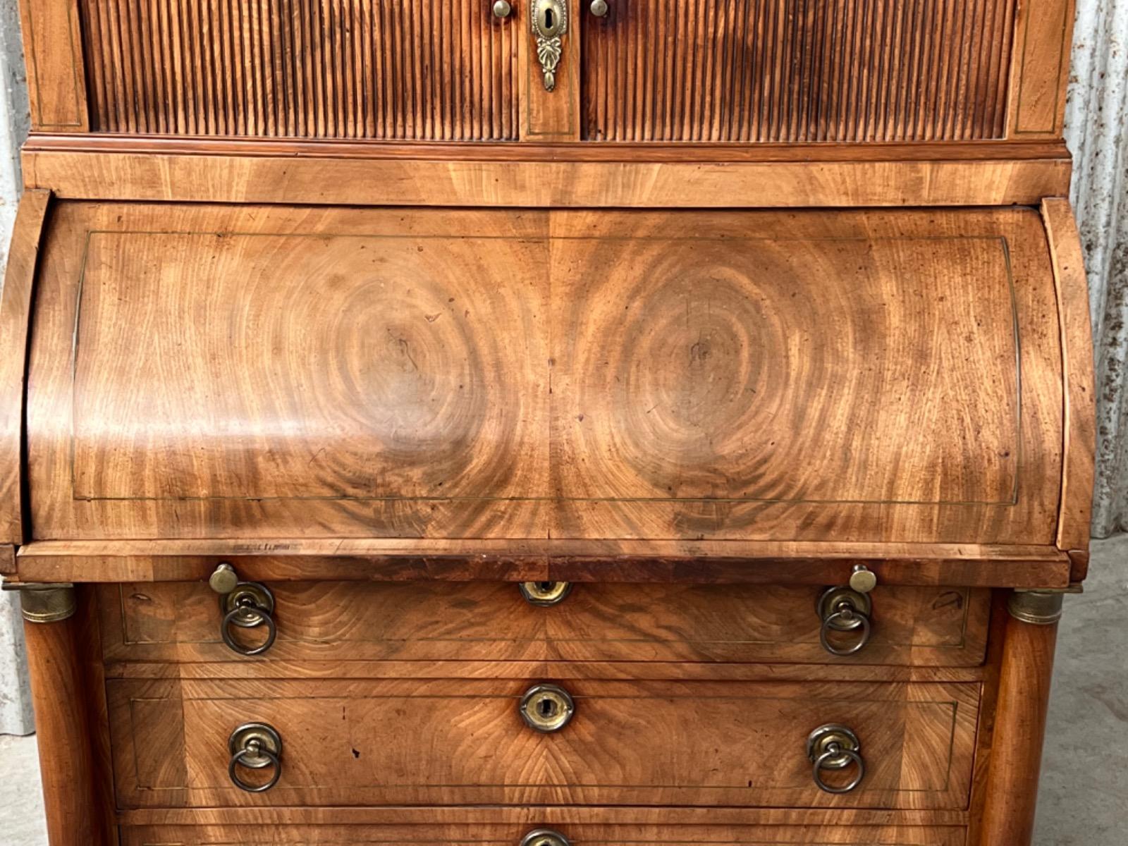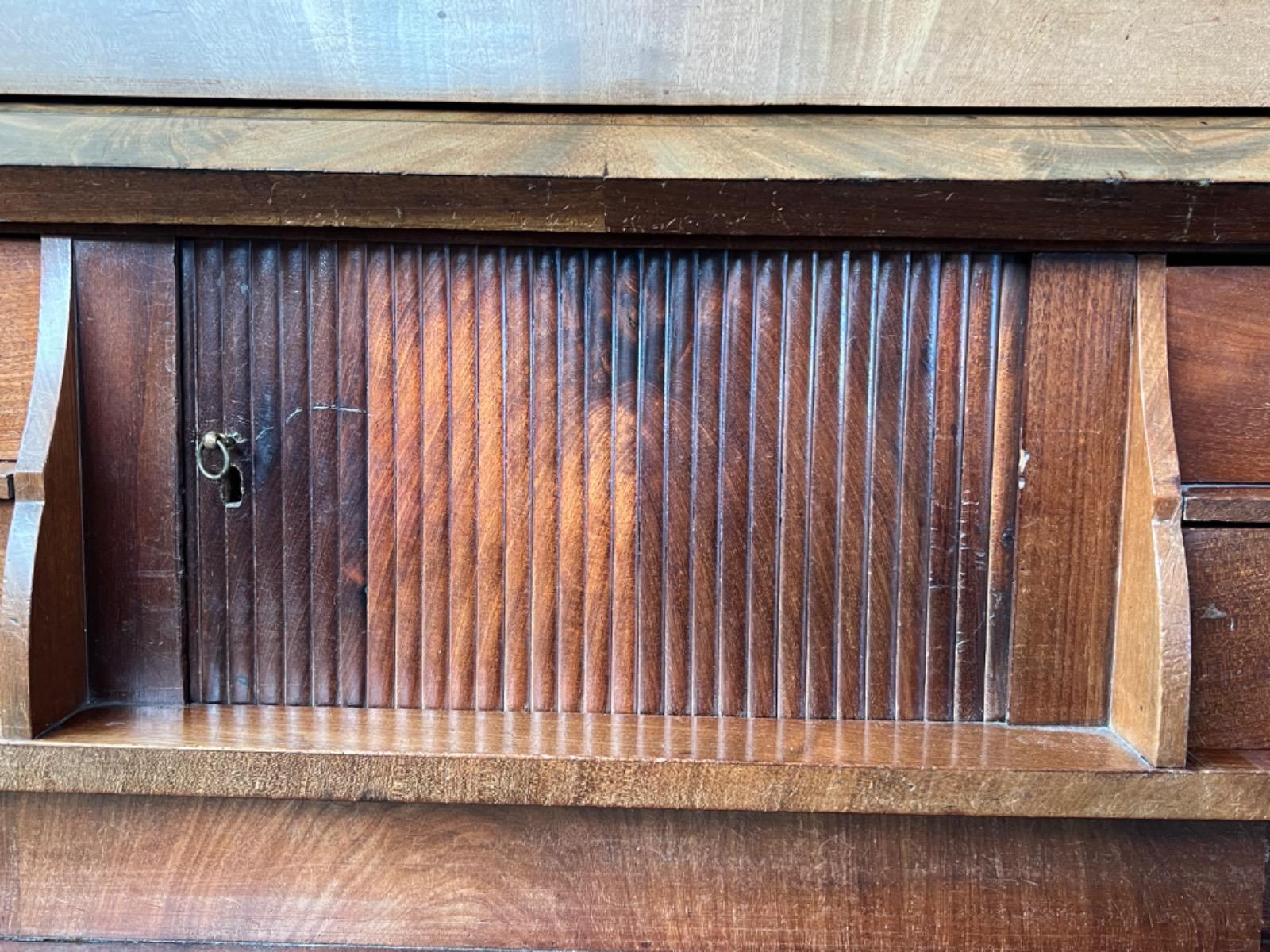 Achter de cilinder diverse kleine laden, jalousie deurtje ook mahonie (massief)