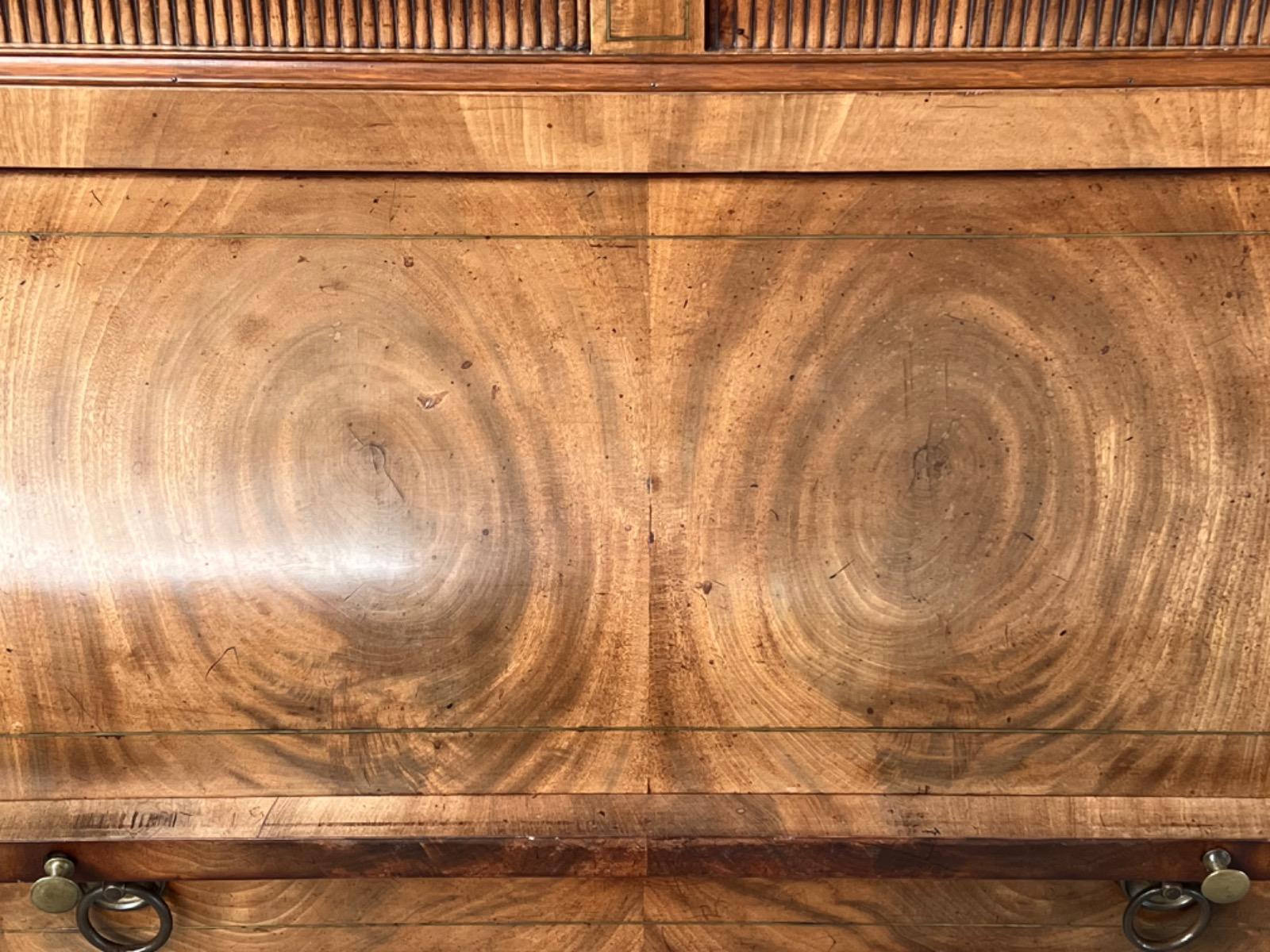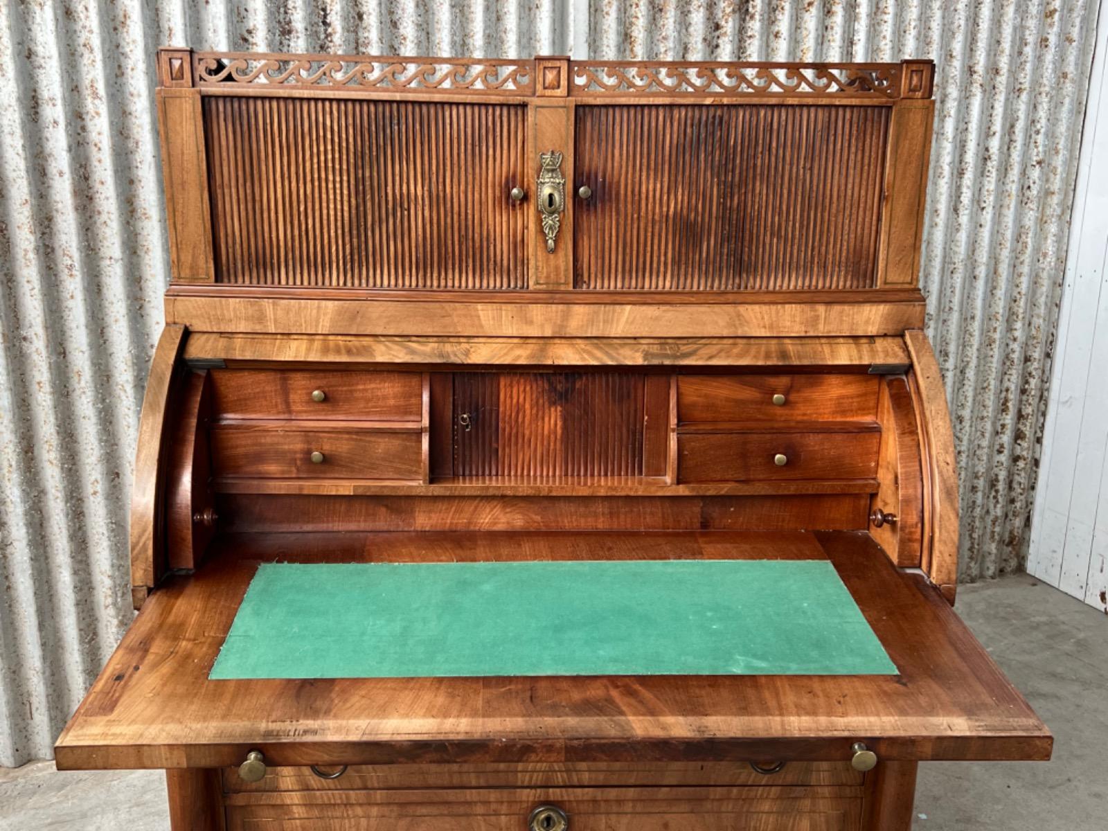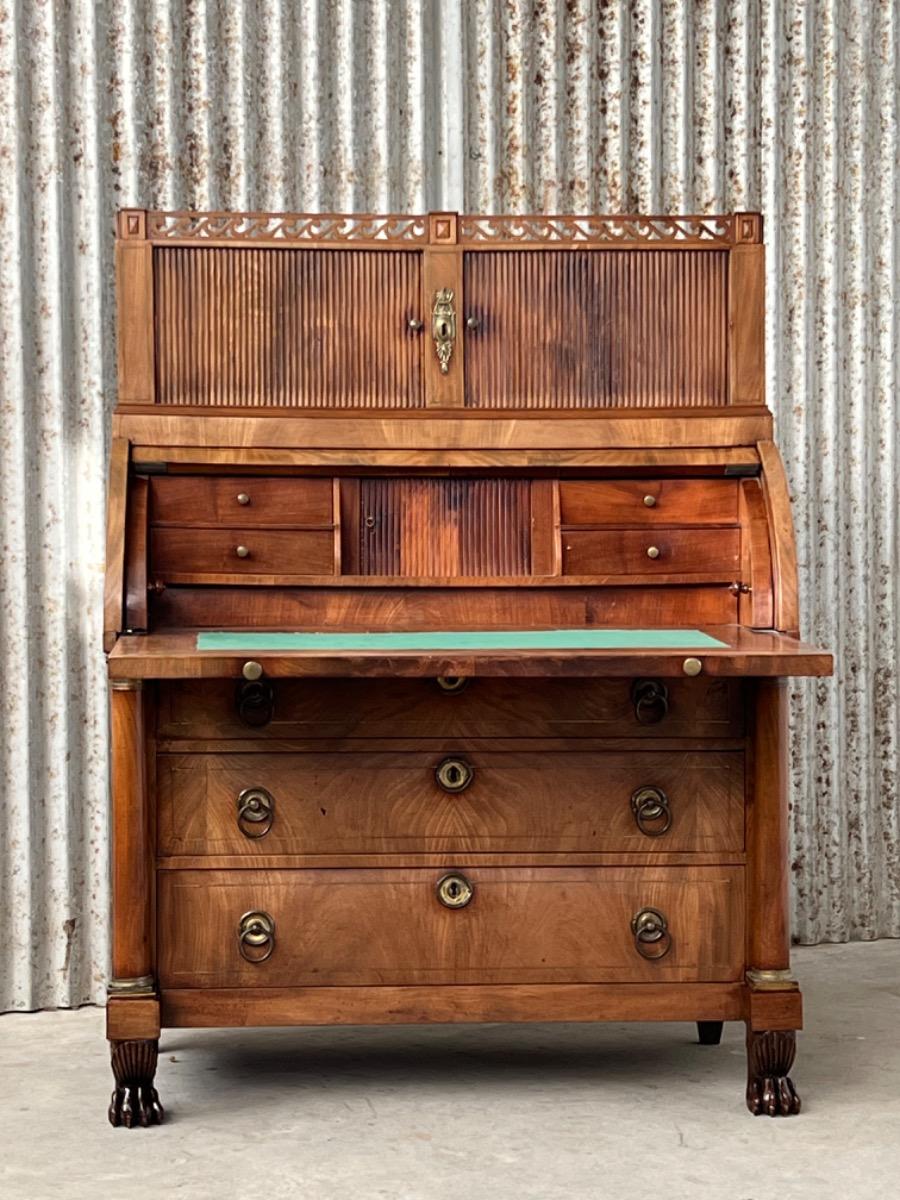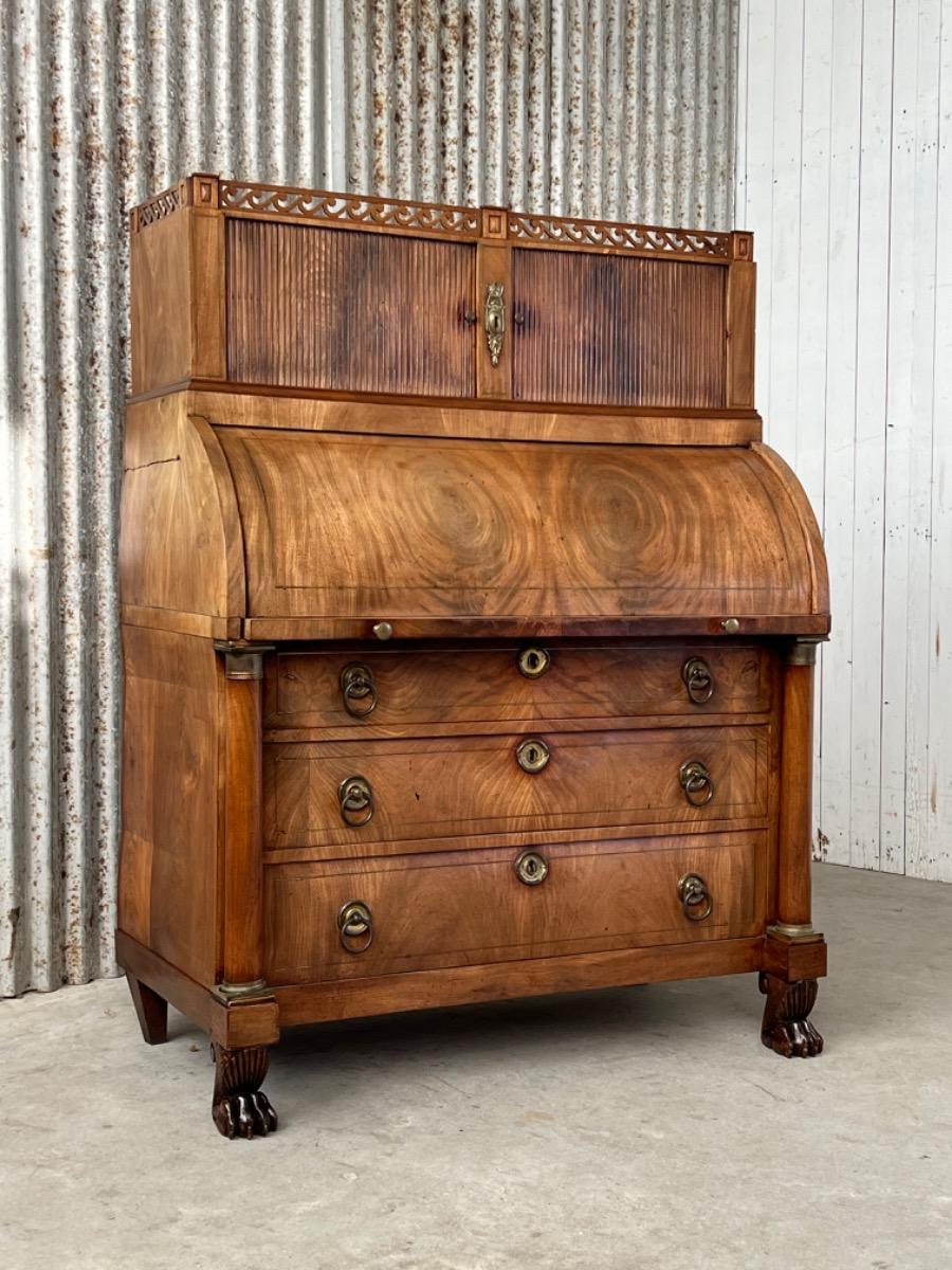 Achter de cilinder diverse kleine laden, jalousie deurtje ook mahonie (massief)