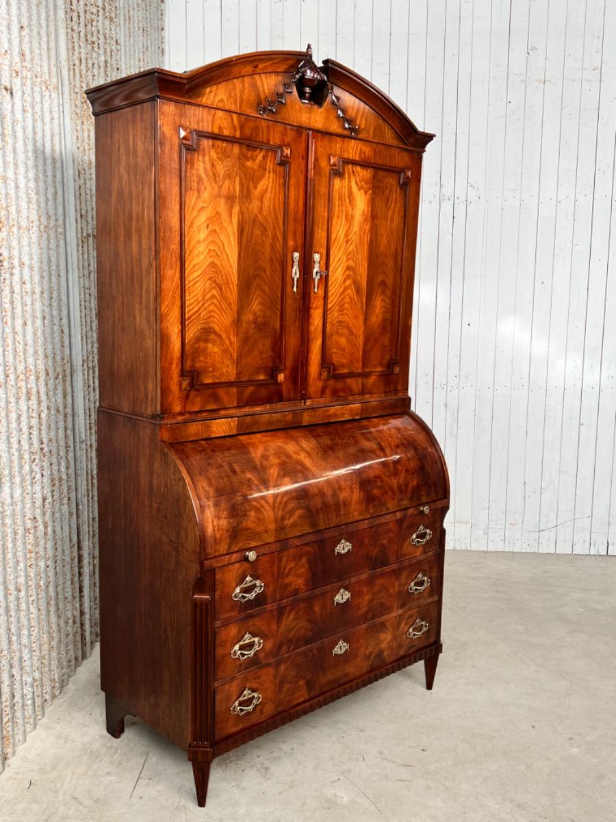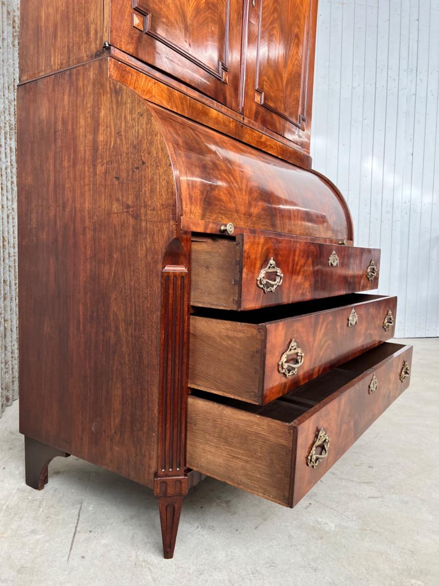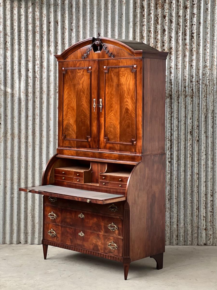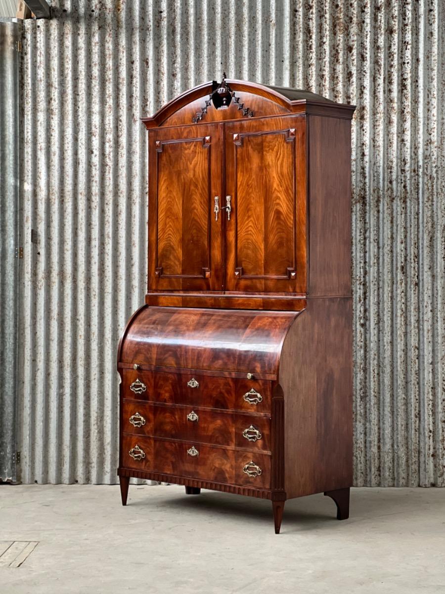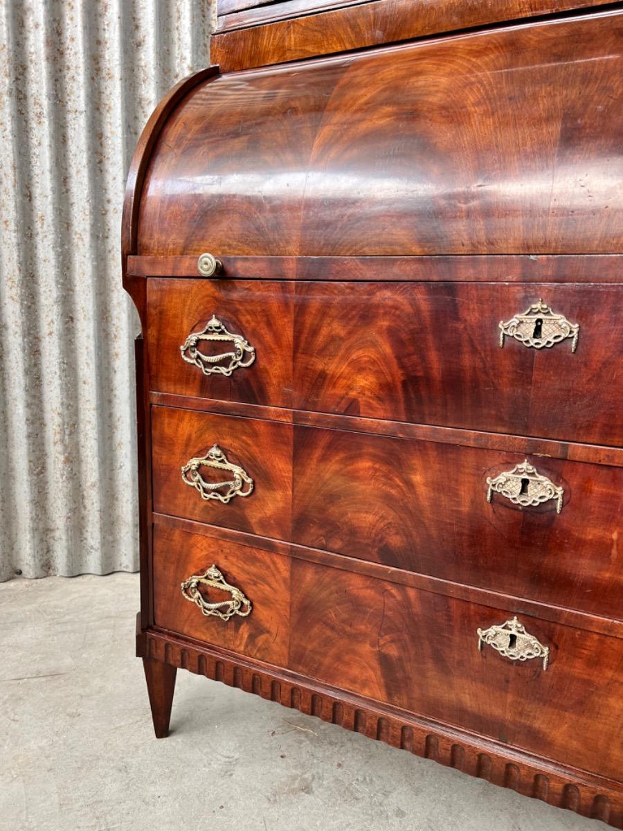 Achter de cilinder diverse kleine laden, deurtje met slot ook Cuba mahonie gefineerd.