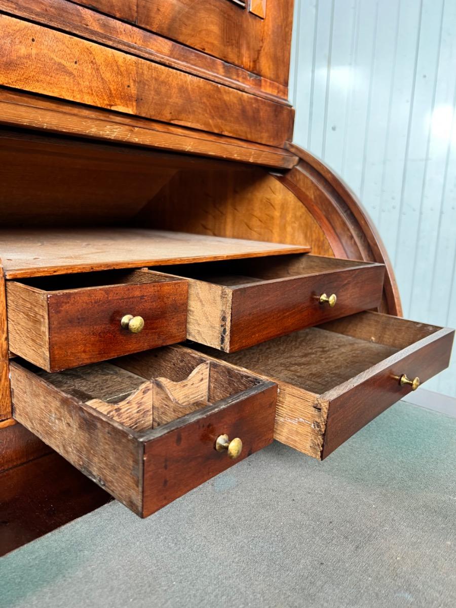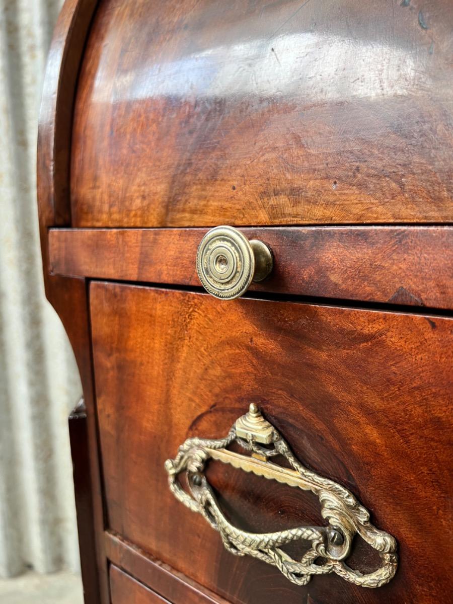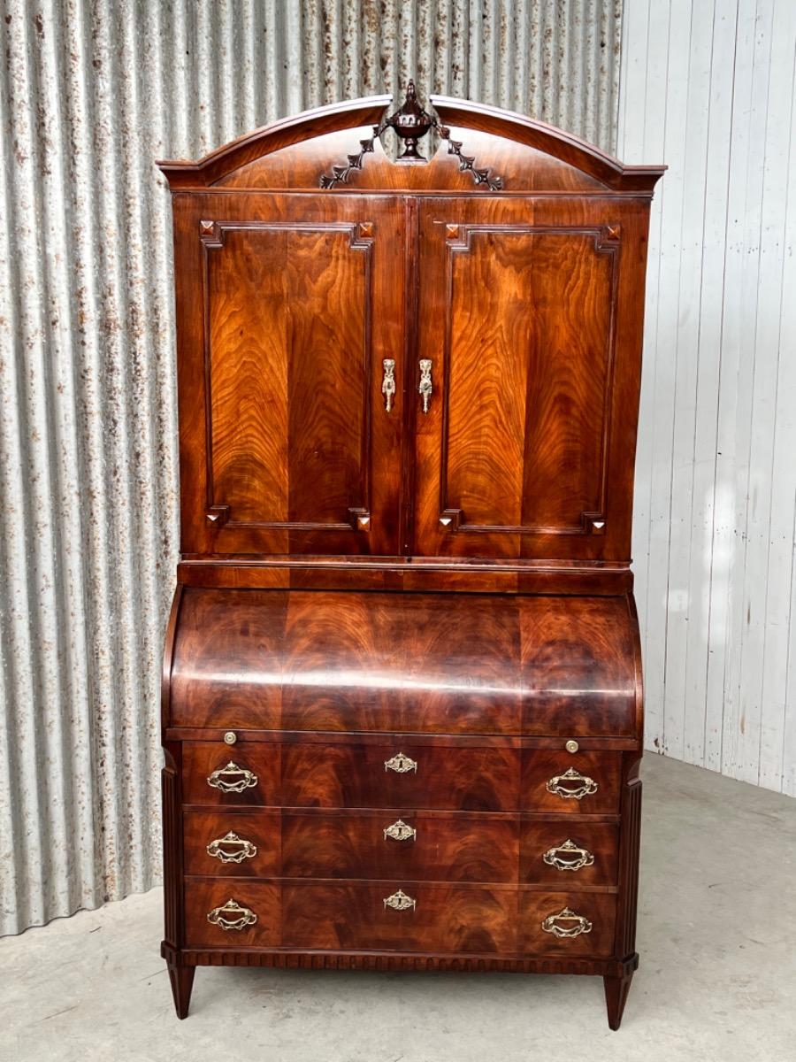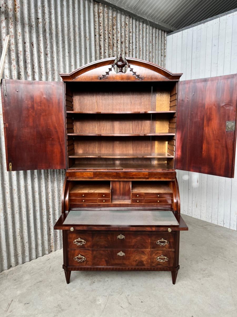 Achter de cilinder diverse kleine laden, deurtje met slot ook Cuba mahonie gefineerd.