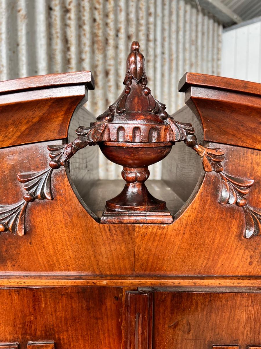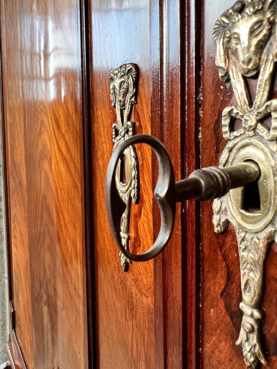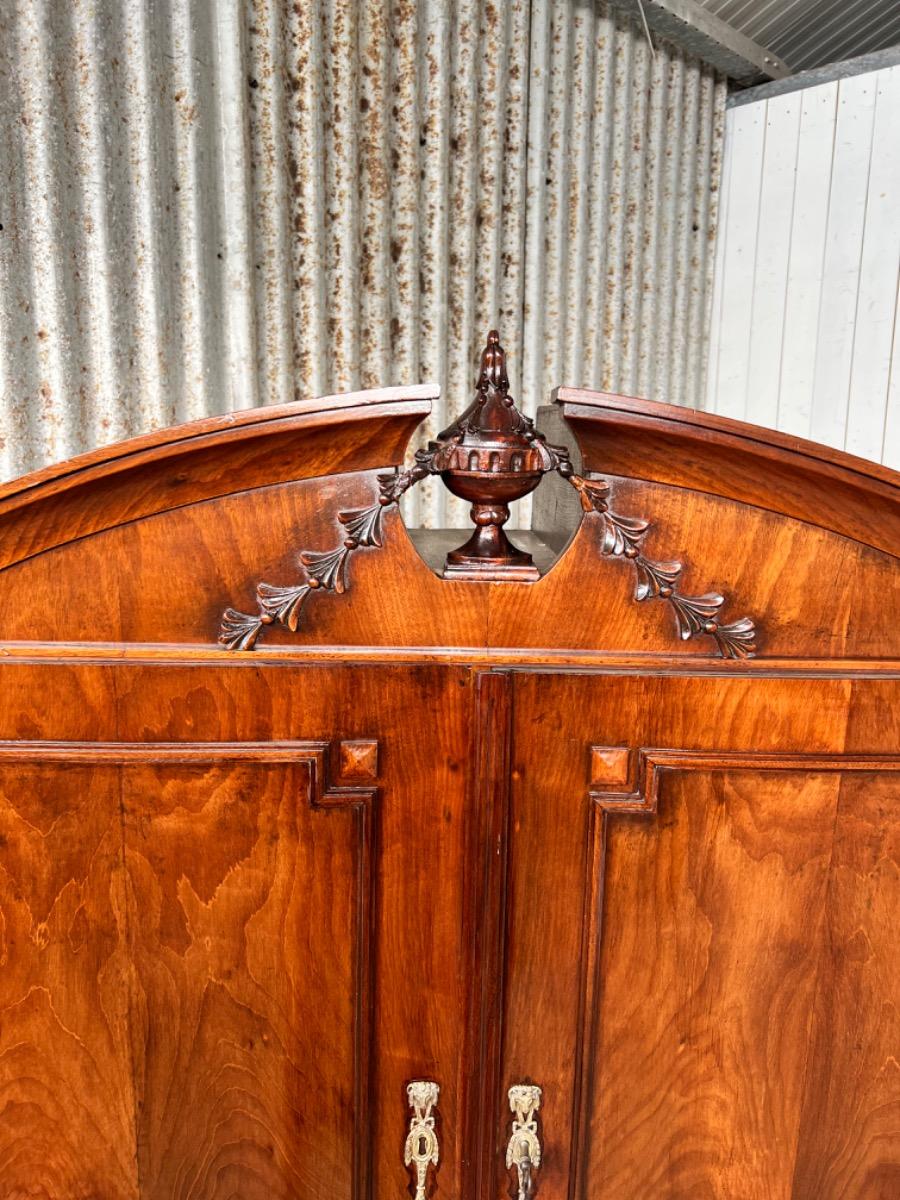 bovenkast met twee paneel deuren, gespiegeld bloem fineer en snijwerken op de kap en deurpanelen waarachter 3 in hoogte verstelbare planken. Deuren sluiten goed met oorspronkelijk slot en werkende sleutel.