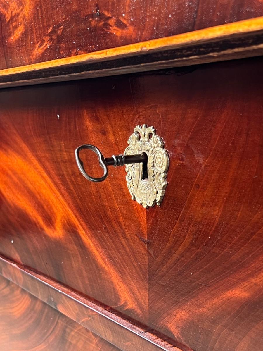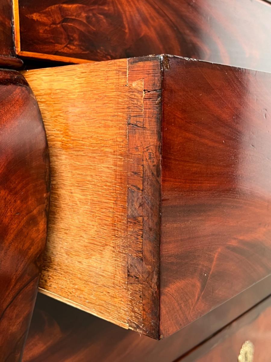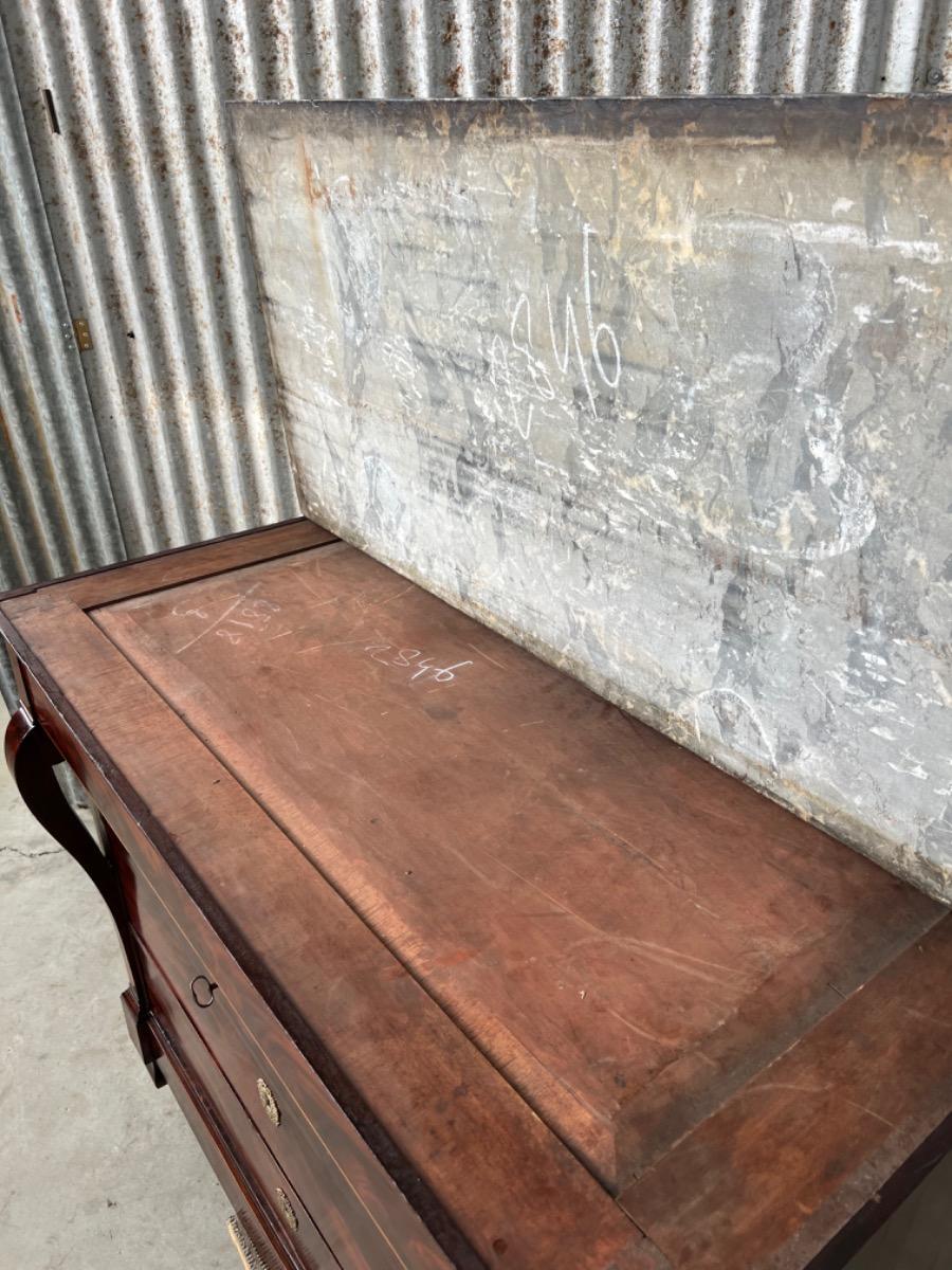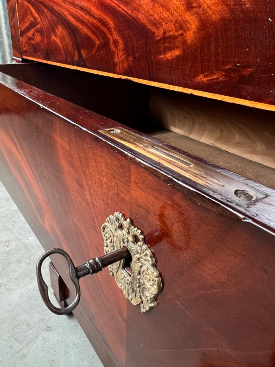 Fineer aan voorzijden mooi doorlopend bloem mahonie fineer op alle laden. Bovenste overstekende lade met hulst omlijsting. (Oorspronkelijk) Mahonie op eiken gefineerd, laden bodems en achterwand van eik.