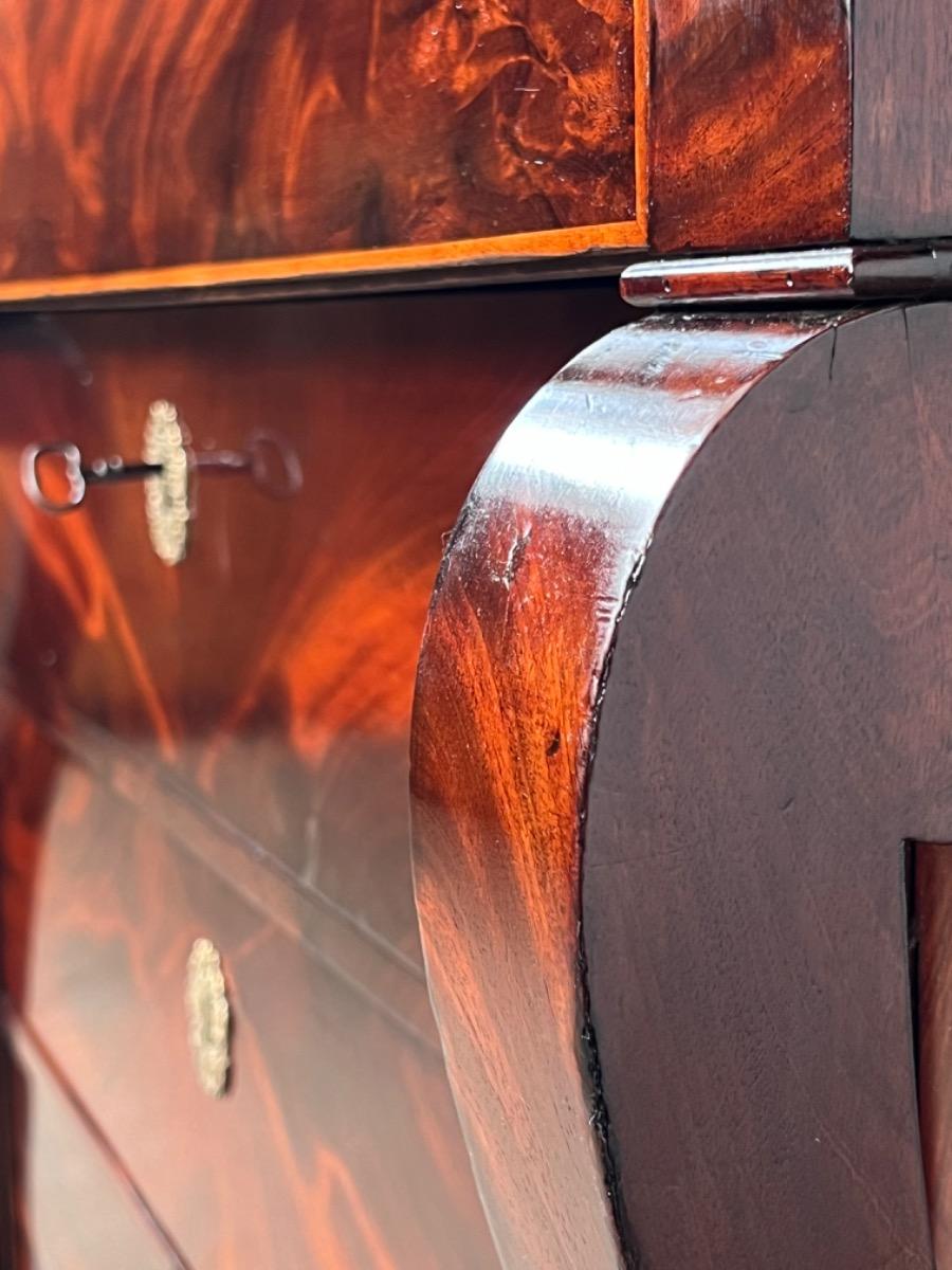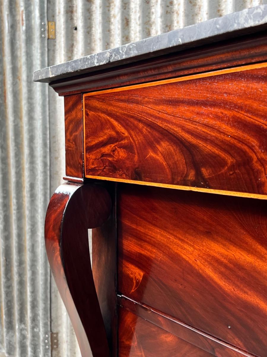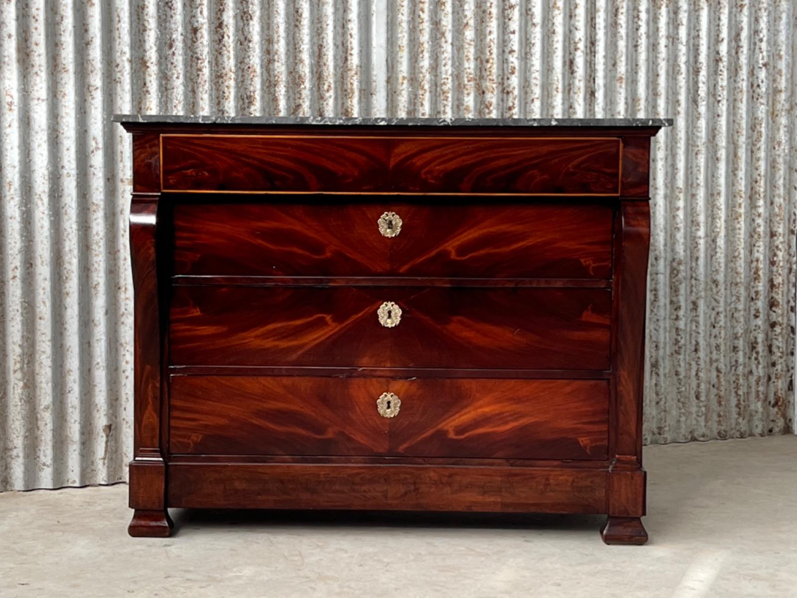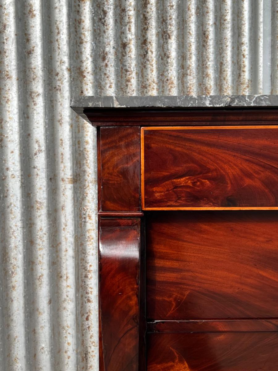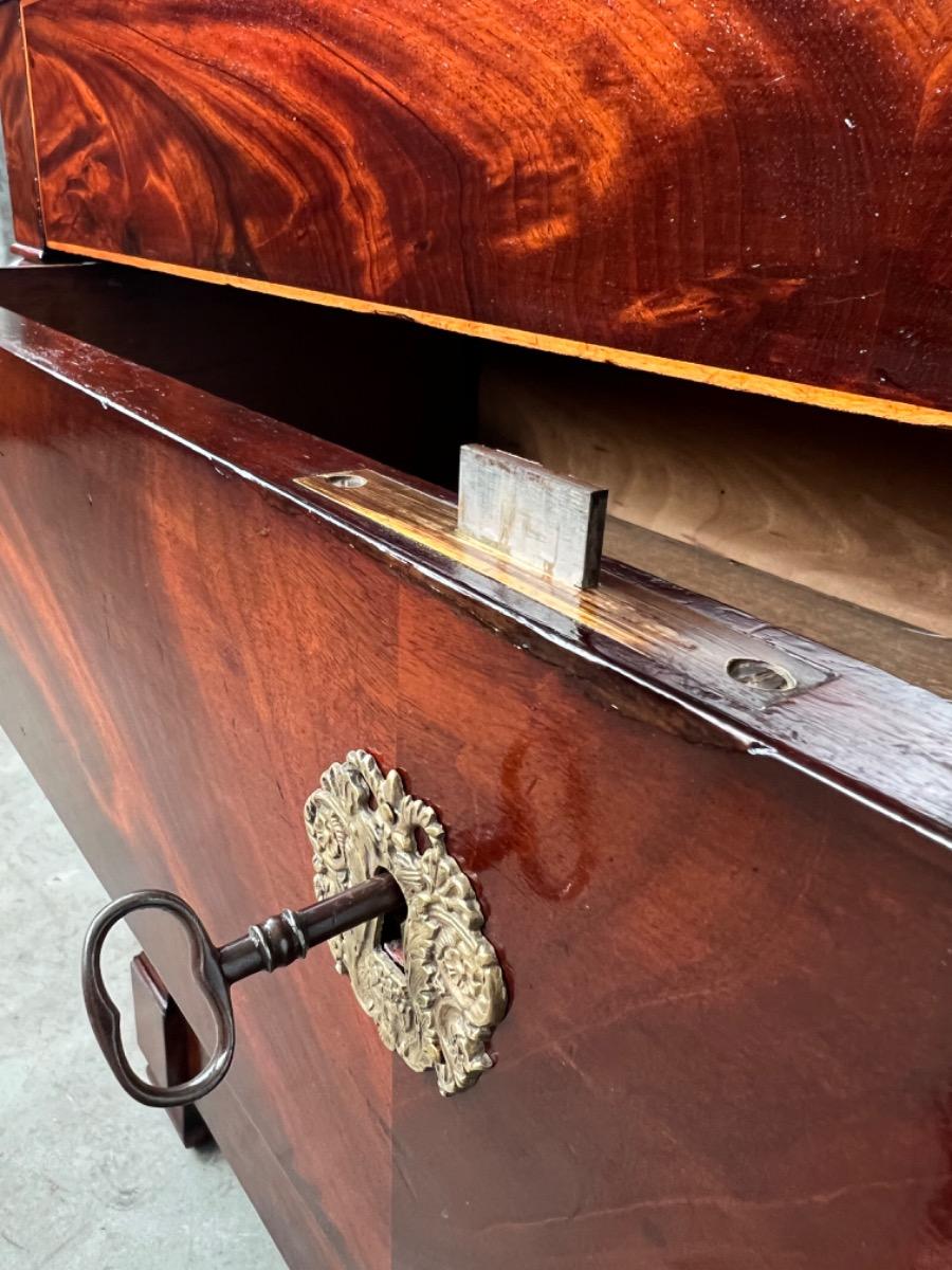 Fineer aan voorzijden mooi doorlopend bloem mahonie fineer op alle laden. Bovenste overstekende lade met hulst omlijsting. (Oorspronkelijk) Mahonie op eiken gefineerd, laden bodems en achterwand van eik.
