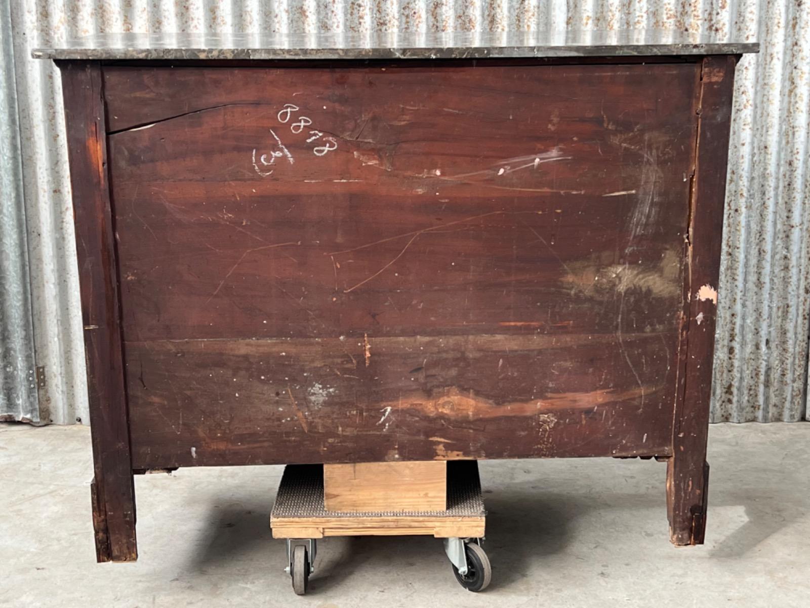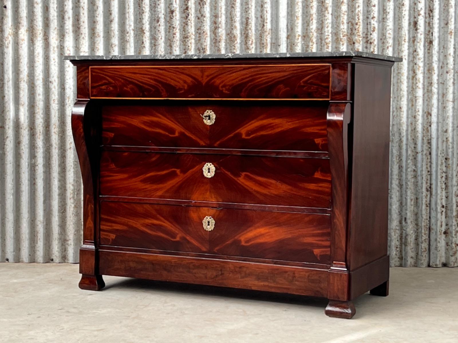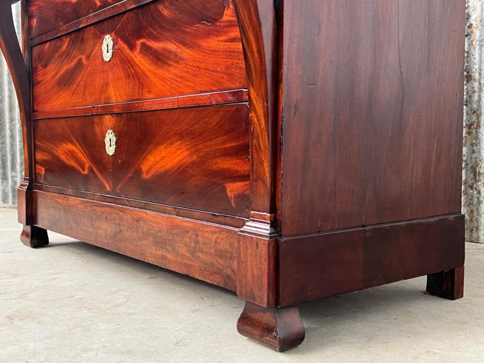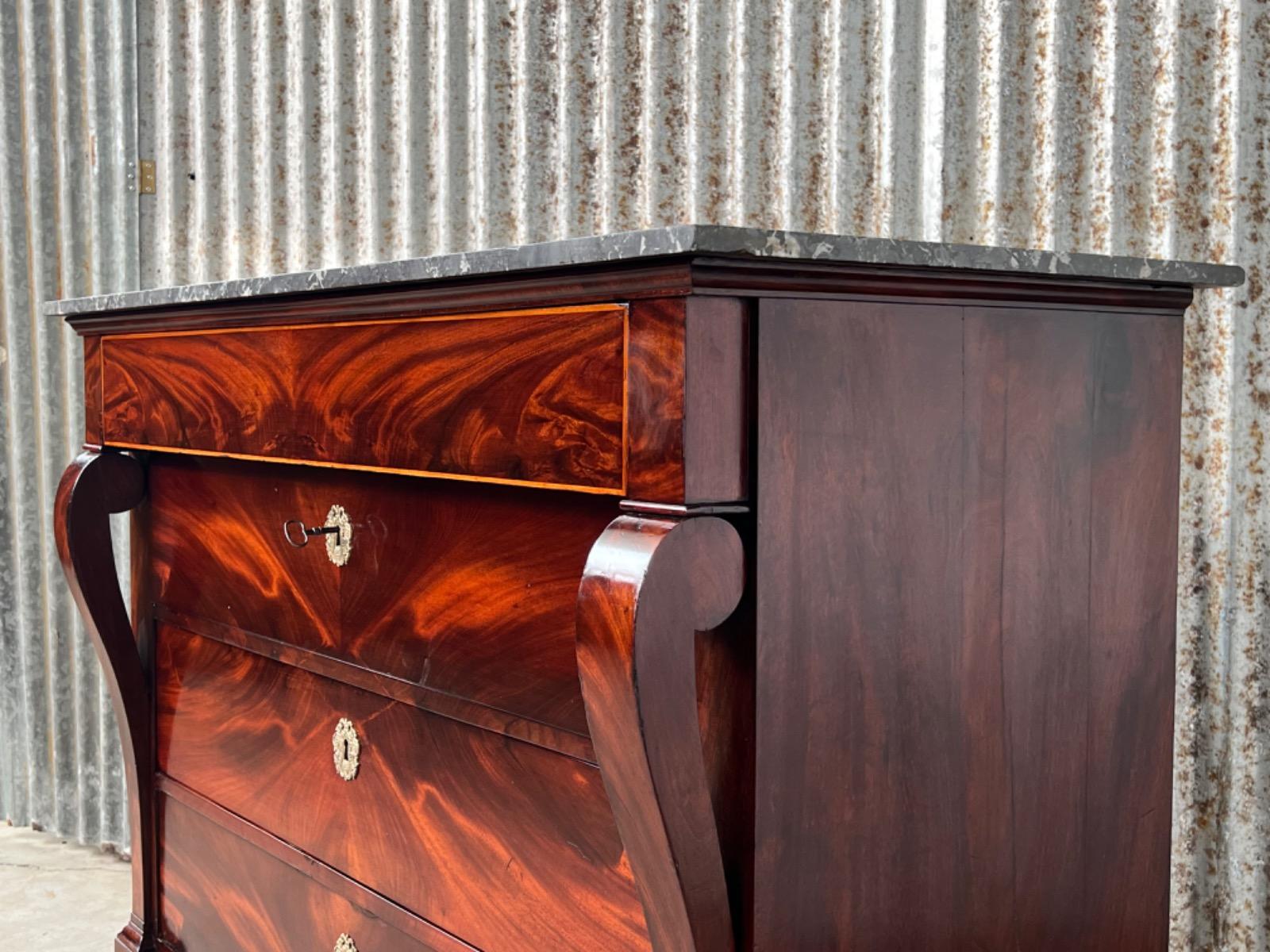 Fineer aan voorzijden mooi doorlopend bloem mahonie fineer op alle laden. Bovenste overstekende lade met hulst omlijsting. (Oorspronkelijk) Mahonie op eiken gefineerd, laden bodems en achterwand van eik.
