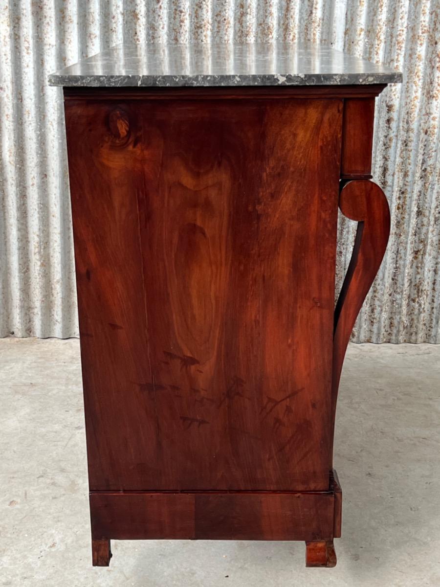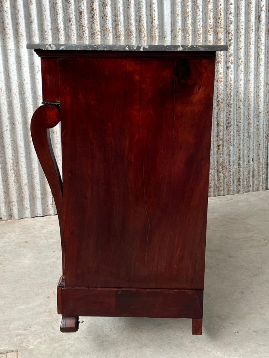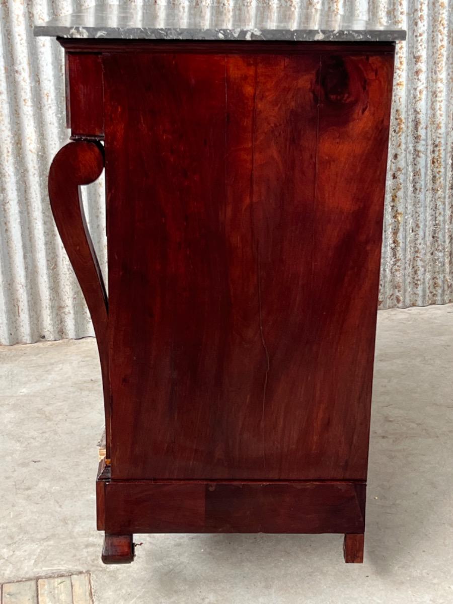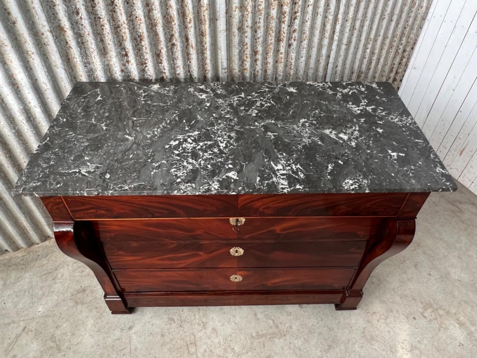 Fineer aan voorzijden mooi doorlopend bloem mahonie fineer op alle laden. Bovenste overstekende lade met hulst omlijsting. (Oorspronkelijk) Mahonie op eiken gefineerd, laden bodems en achterwand van eik.