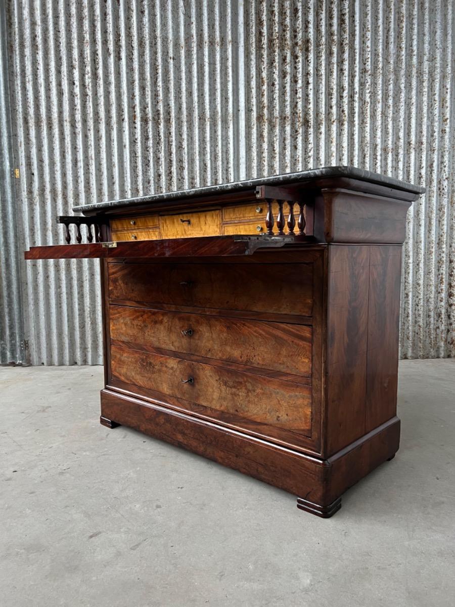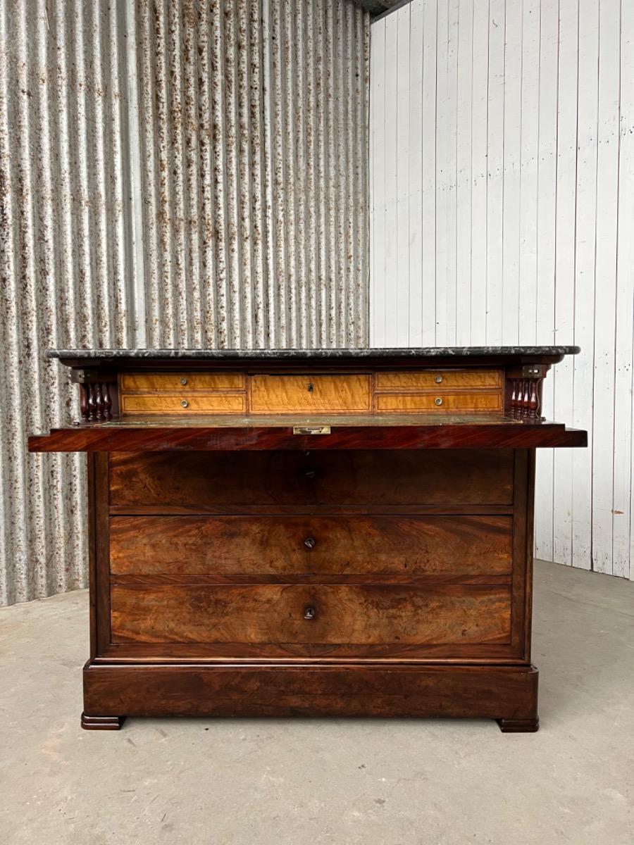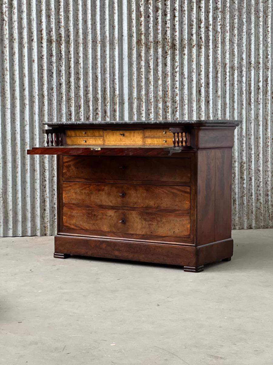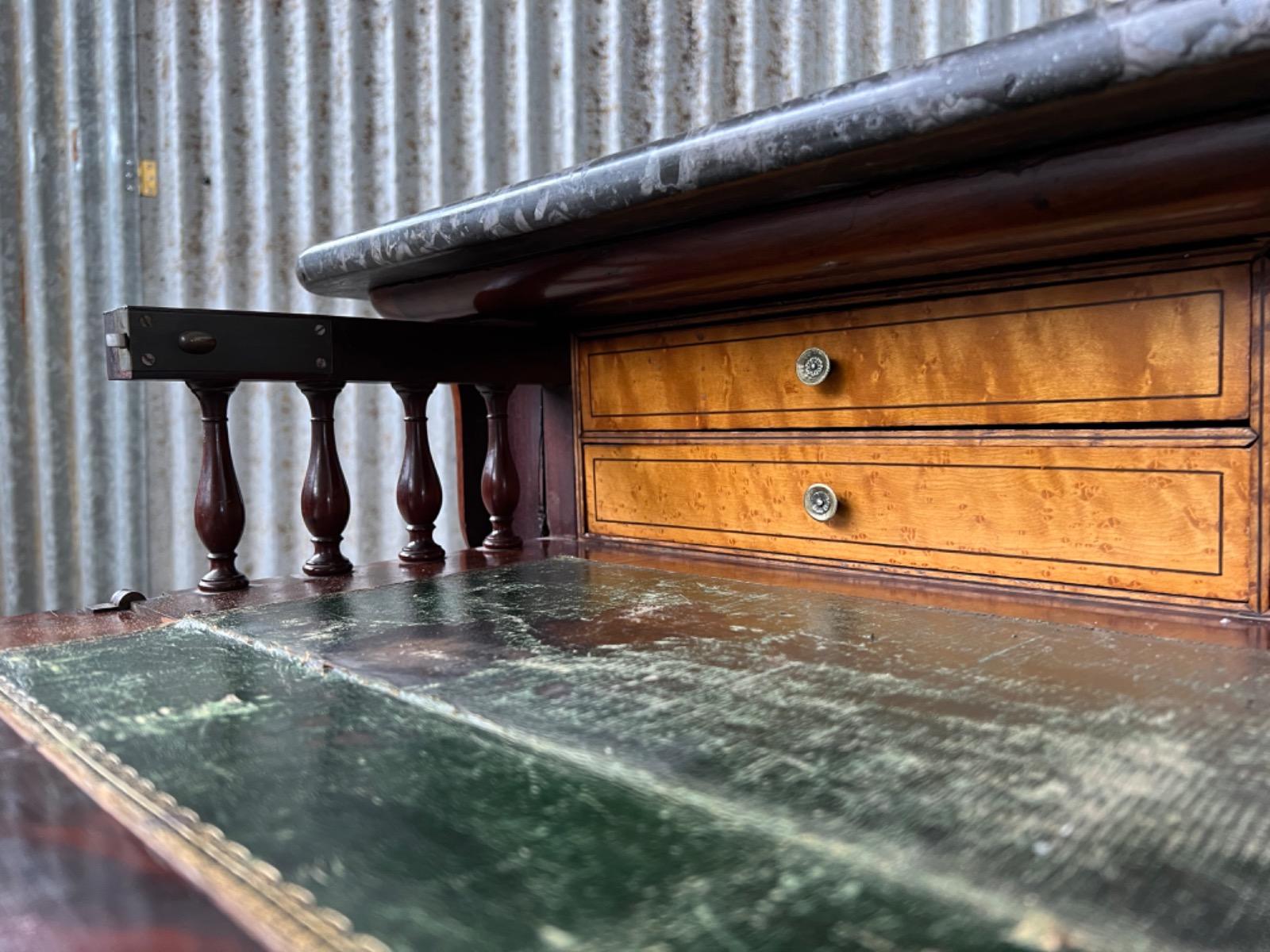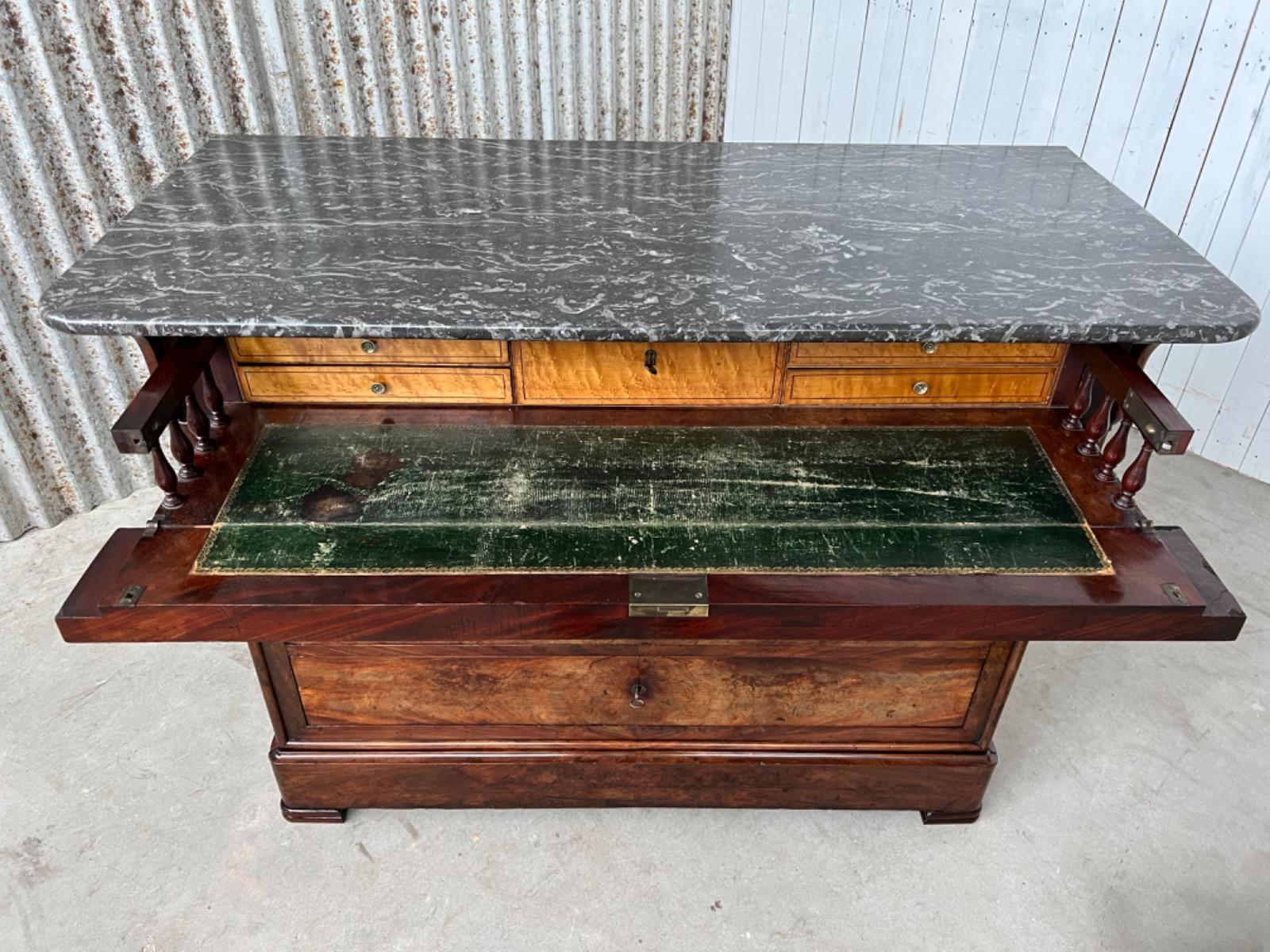 Commode met bureaulade of klepbureau, eerste helft 19e eeuw. Met messing schild beslag, knopjes en scharnieren. Achter de klep een centrale lade met aan weerszijden 2 laden voorzien van zeer fijn bewerkte vergulde messing knopjes. Laden belijmd met ‘vogelogen esdoorn’. Bureau blad met groen leder, goud ombiest ingelegd Onder het bureau deel 3 goed werkende laden met werkende (oorspronkelijke) sloten, en allen een eigen sleutel. Achterwand, lade, zijden en bodems van eikenhout. Geheel gedekt met "St. Anna marmer" dat totaal in tact is. In zeer goede en direct te gebruiken staat. Frankrijk Ca. 1820