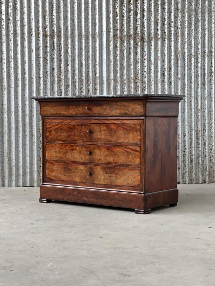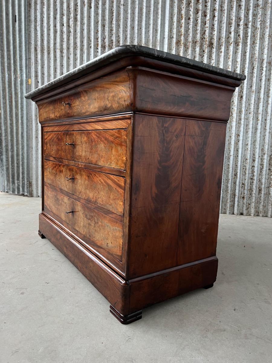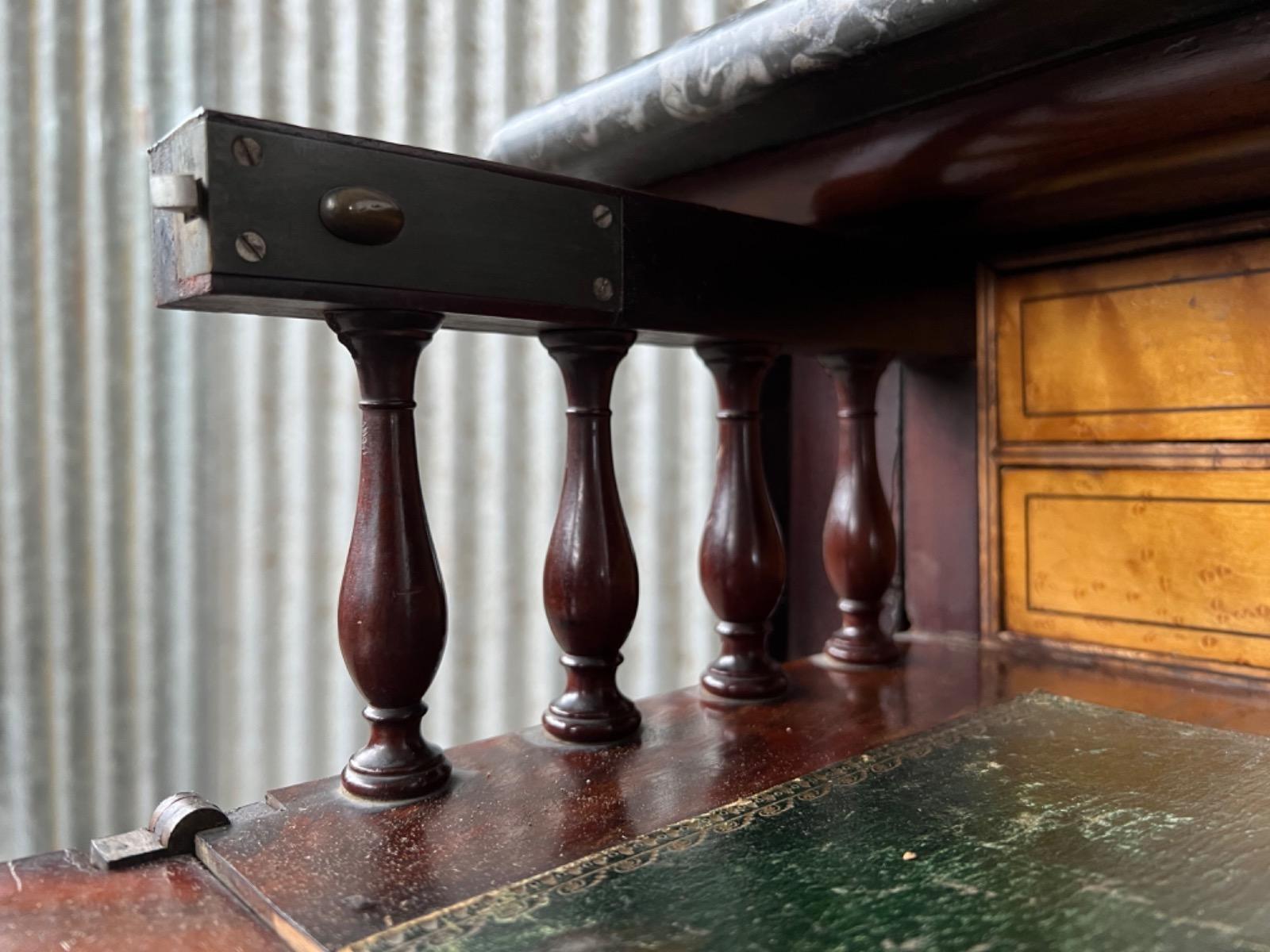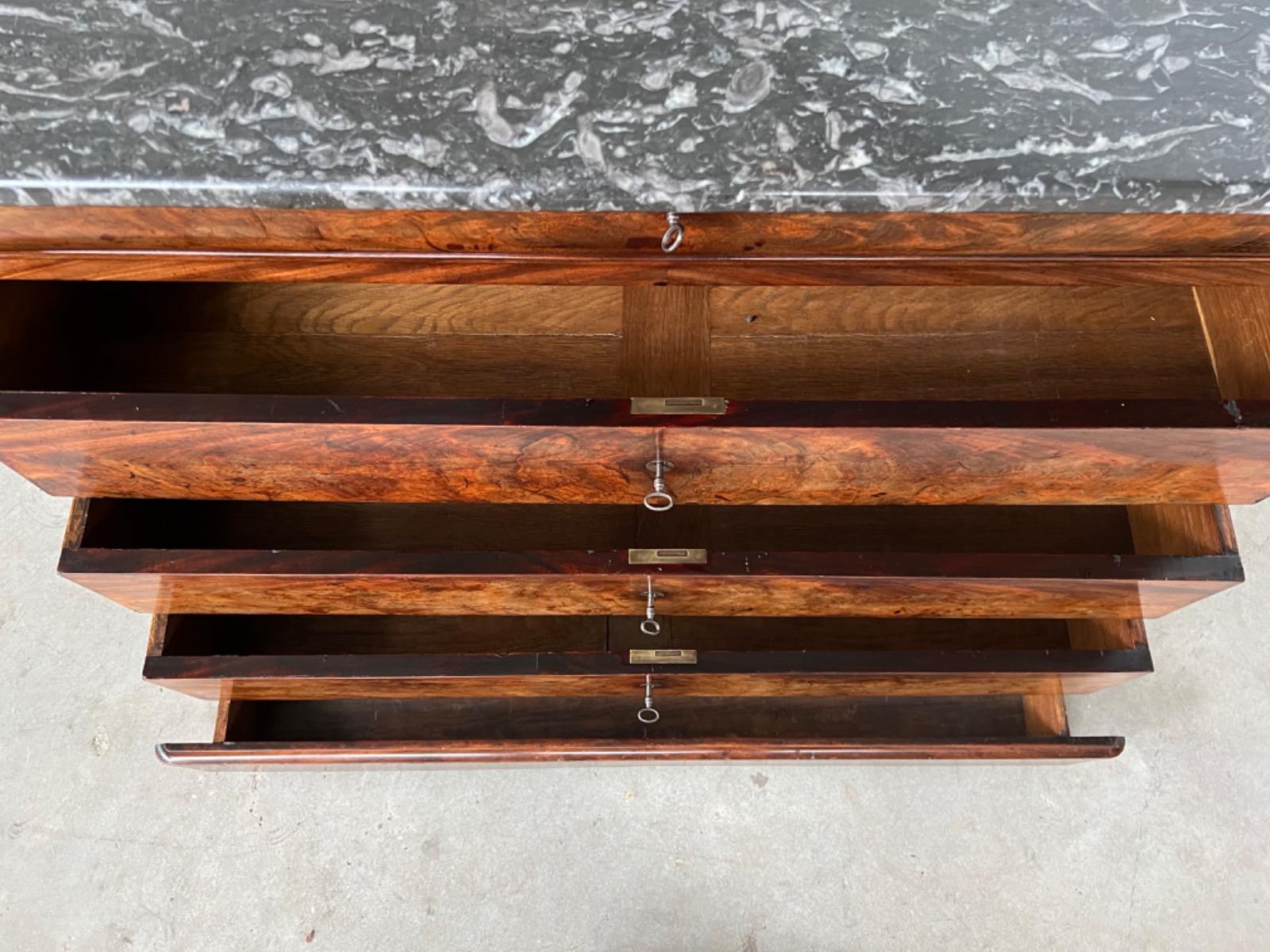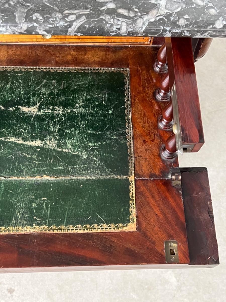 Commode met bureaulade of klepbureau, eerste helft 19e eeuw. Met messing schild beslag, knopjes en scharnieren. Achter de klep een centrale lade met aan weerszijden 2 laden voorzien van zeer fijn bewerkte vergulde messing knopjes. Laden belijmd met ‘vogelogen esdoorn’. Bureau blad met groen leder, goud ombiest ingelegd Onder het bureau deel 3 goed werkende laden met werkende (oorspronkelijke) sloten, en allen een eigen sleutel. Achterwand, lade, zijden en bodems van eikenhout. Geheel gedekt met "St. Anna marmer" dat totaal in tact is. In zeer goede en direct te gebruiken staat. Frankrijk Ca. 1820