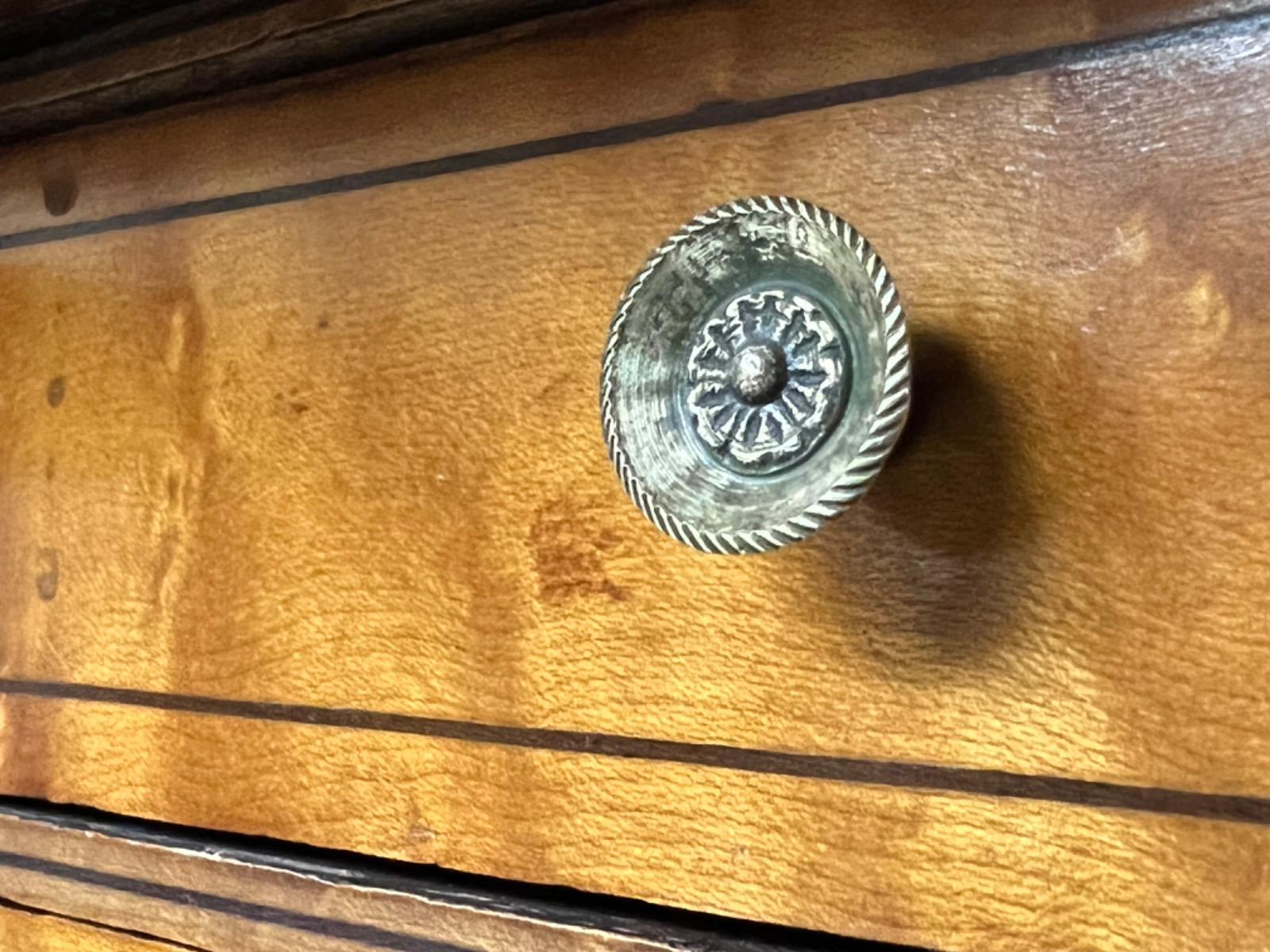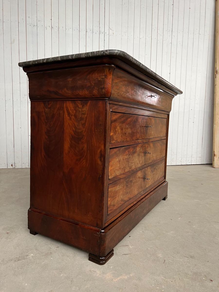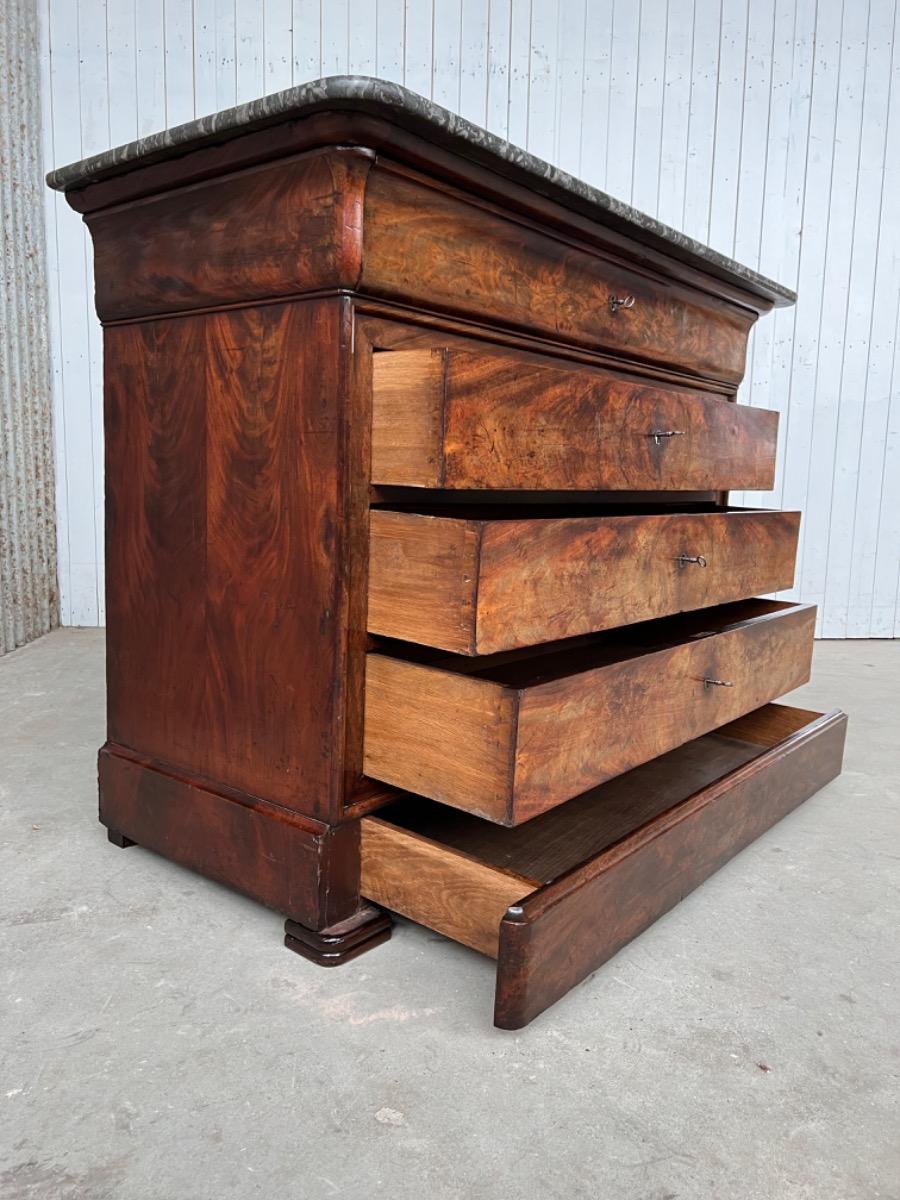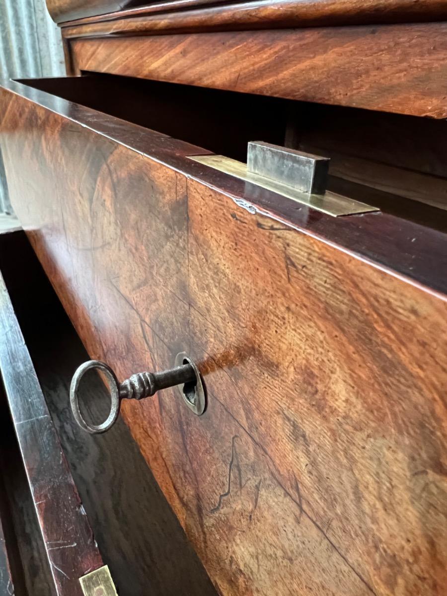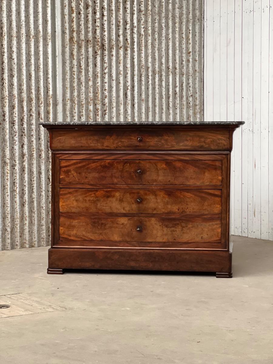 Commode met bureaulade of klepbureau, eerste helft 19e eeuw. Met messing schild beslag, knopjes en scharnieren. Achter de klep een centrale lade met aan weerszijden 2 laden voorzien van zeer fijn bewerkte vergulde messing knopjes. Laden belijmd met ‘vogelogen esdoorn’. Bureau blad met groen leder, goud ombiest ingelegd Onder het bureau deel 3 goed werkende laden met werkende (oorspronkelijke) sloten, en allen een eigen sleutel. Achterwand, lade, zijden en bodems van eikenhout. Geheel gedekt met "St. Anna marmer" dat totaal in tact is. In zeer goede en direct te gebruiken staat. Frankrijk Ca. 1820