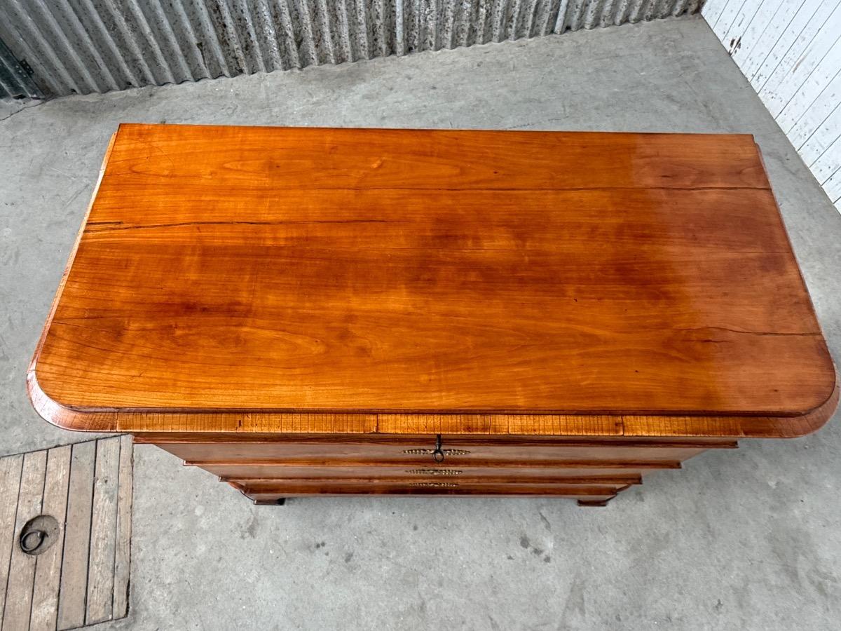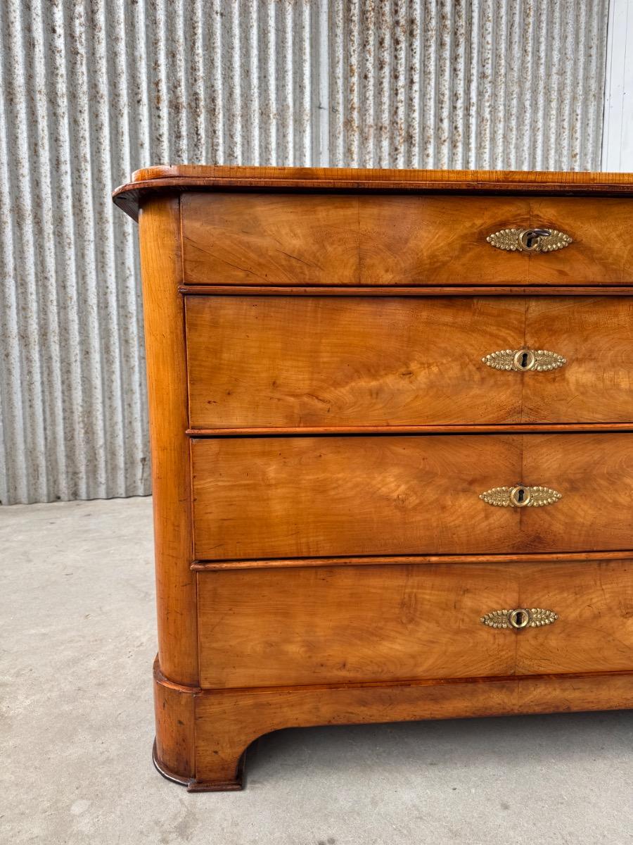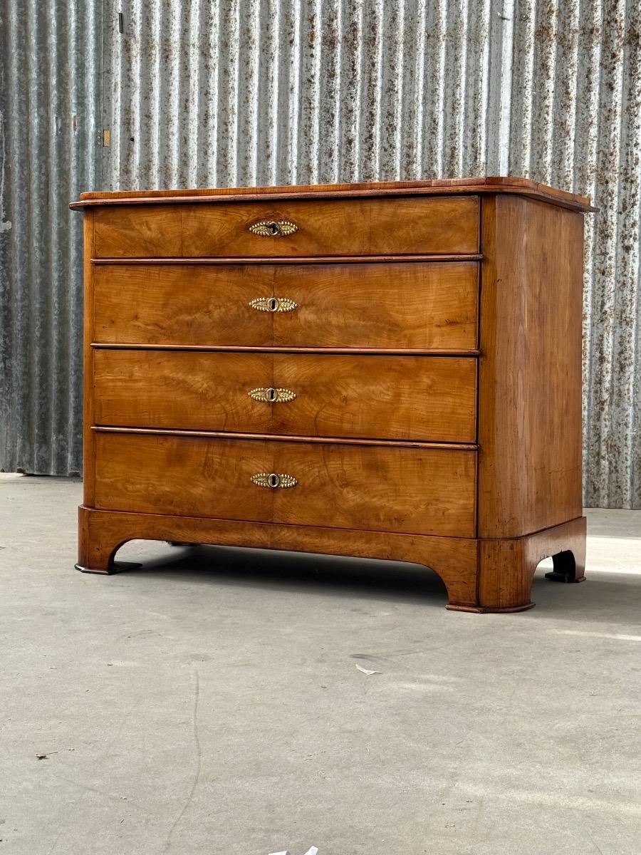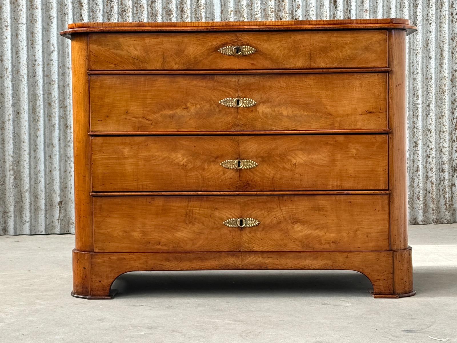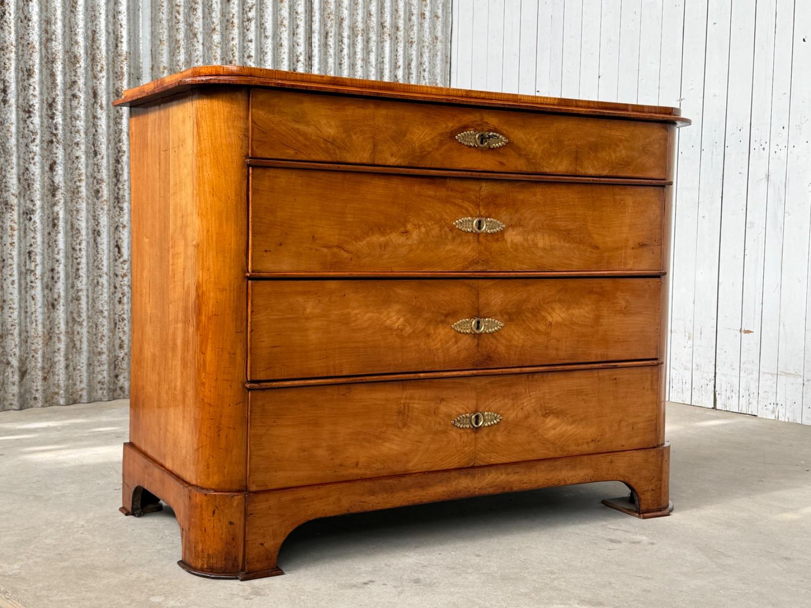 Duits Biedermeier kersen commode. 4 laden, onder het gepolitoerde dek met afgeschuinde rand. Stevige ronde hoeken, zijden zonder scheuren. Geheel op stevige kenmerkende Biedermeier poten. Messing beslag, werkende sloten met sleutels. Duitsland, omstreeks 1810-1840. Afm: H= 94 cm. B= 115 - 123 cm. (smalst- breedst) D= 53 - 56 cm. (ondiepst-diepst) Recent grondig nagelopen op losse delen van constructie en fineer, de oppervlakte afwerking op kleur en glans. Houtworm controle: Geen levende houtworm aangetroffen op 25/8/2025 Comm-2715~
