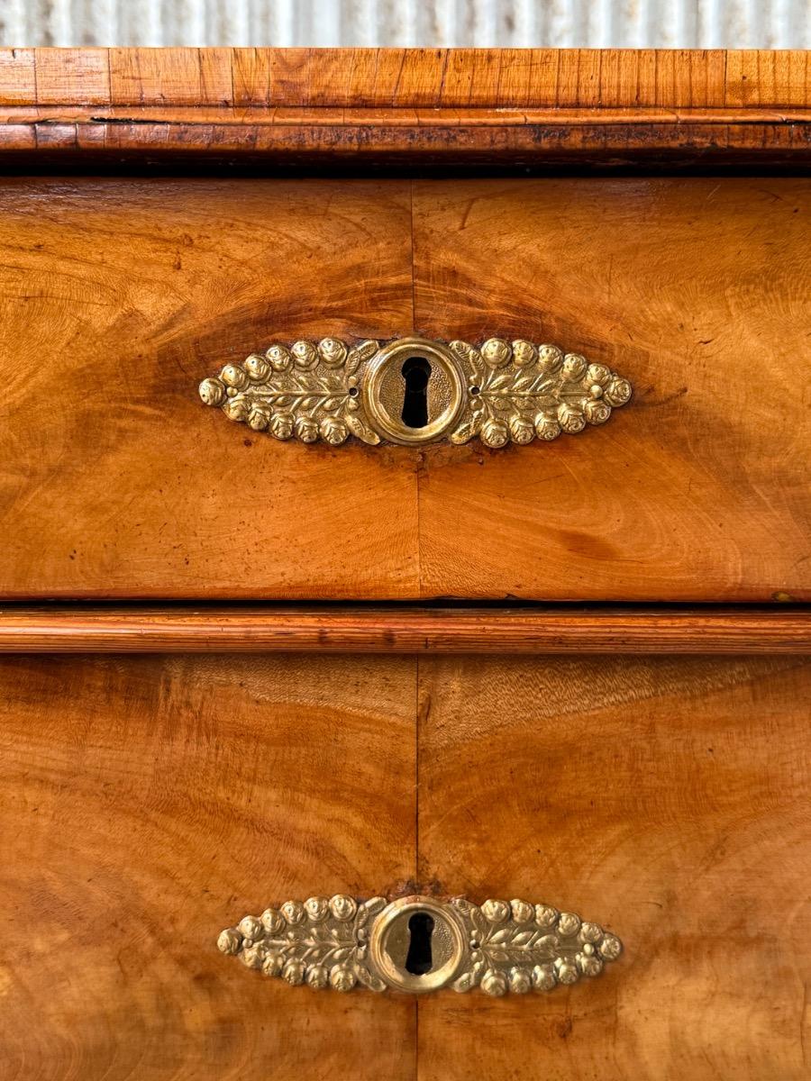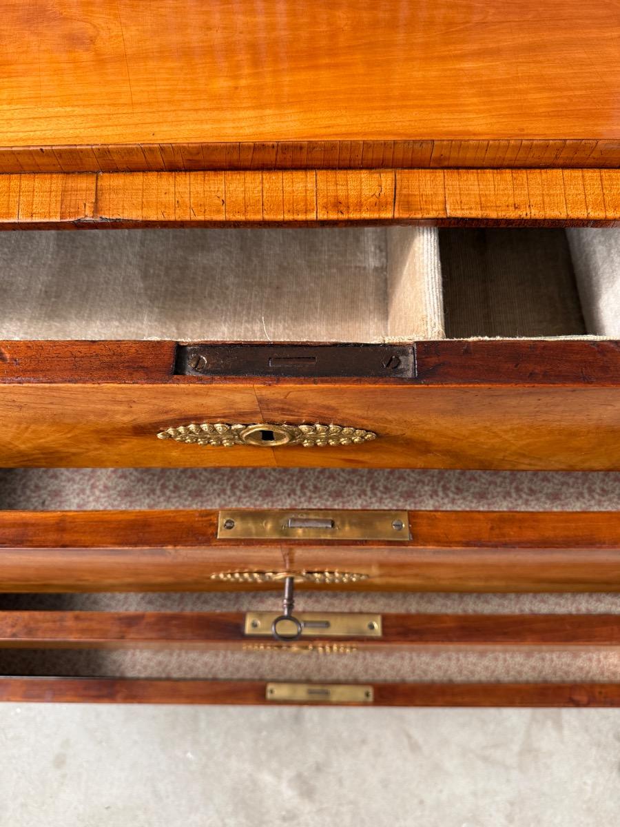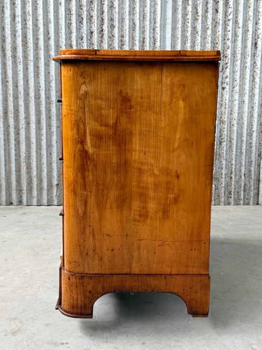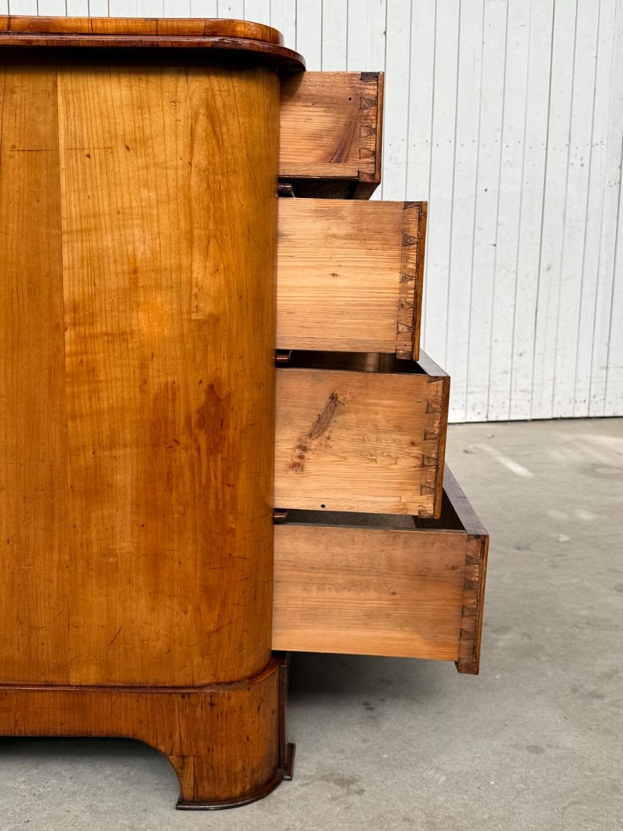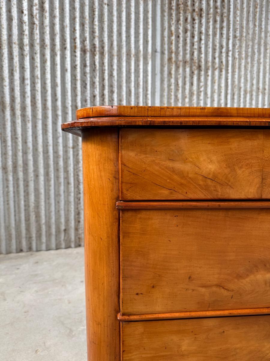 Duits Biedermeier kersen commode. 4 laden, onder het gepolitoerde dek met afgeschuinde rand. Stevige ronde hoeken, zijden zonder scheuren. Geheel op stevige kenmerkende Biedermeier poten. Messing beslag, werkende sloten met sleutels. Duitsland, omstreeks 1810-1840. Afm: H= 94 cm. B= 115 - 123 cm. (smalst- breedst) D= 53 - 56 cm. (ondiepst-diepst) Recent grondig nagelopen op losse delen van constructie en fineer, de oppervlakte afwerking op kleur en glans. Houtworm controle: Geen levende houtworm aangetroffen op 25/8/2025 Comm-2715~