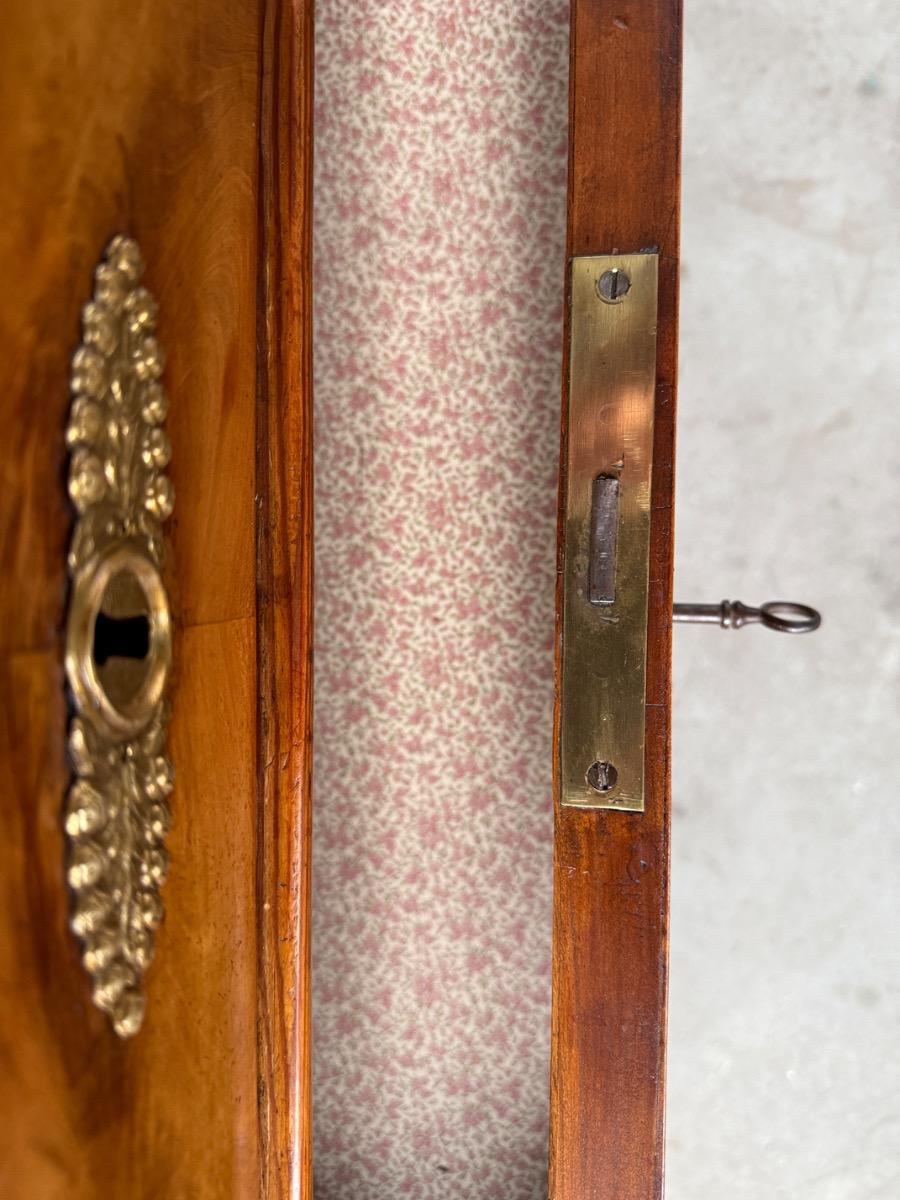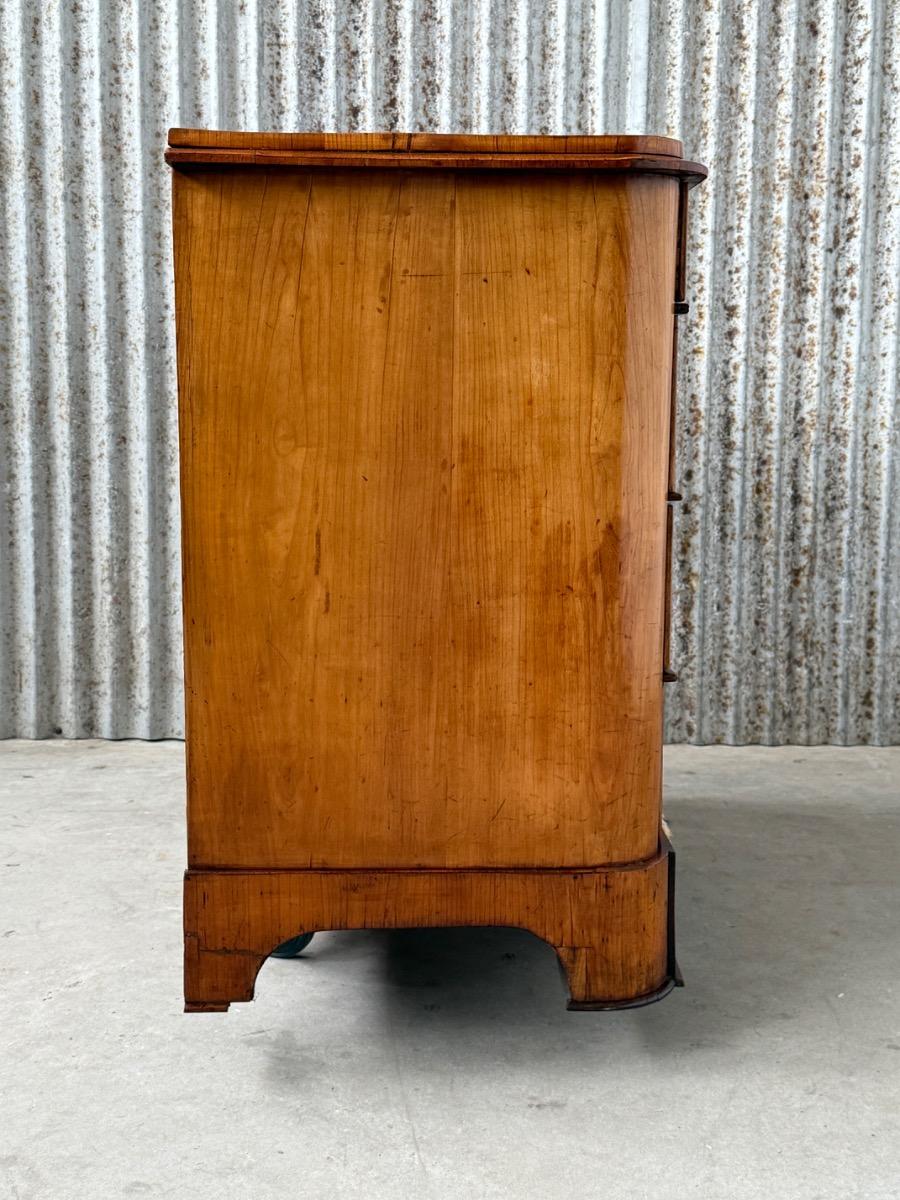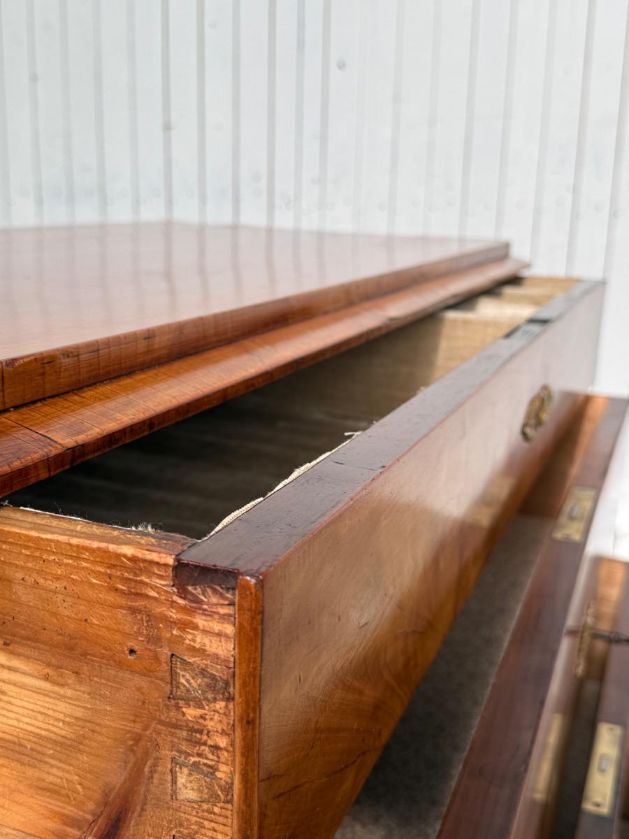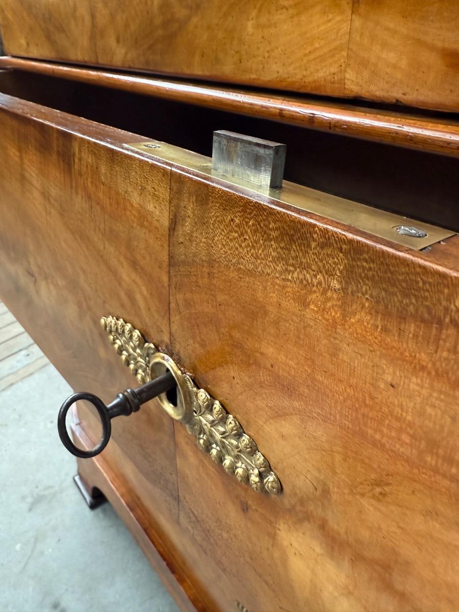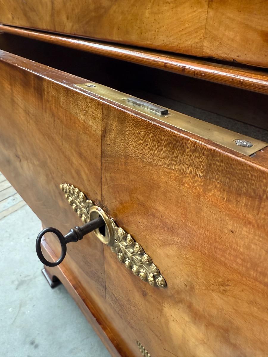 Duits Biedermeier kersen commode. 4 laden, onder het gepolitoerde dek met afgeschuinde rand. Stevige ronde hoeken, zijden zonder scheuren. Geheel op stevige kenmerkende Biedermeier poten. Messing beslag, werkende sloten met sleutels. Duitsland, omstreeks 1810-1840. Afm: H= 94 cm. B= 115 - 123 cm. (smalst- breedst) D= 53 - 56 cm. (ondiepst-diepst) Recent grondig nagelopen op losse delen van constructie en fineer, de oppervlakte afwerking op kleur en glans. Houtworm controle: Geen levende houtworm aangetroffen op 25/8/2025 Comm-2715~