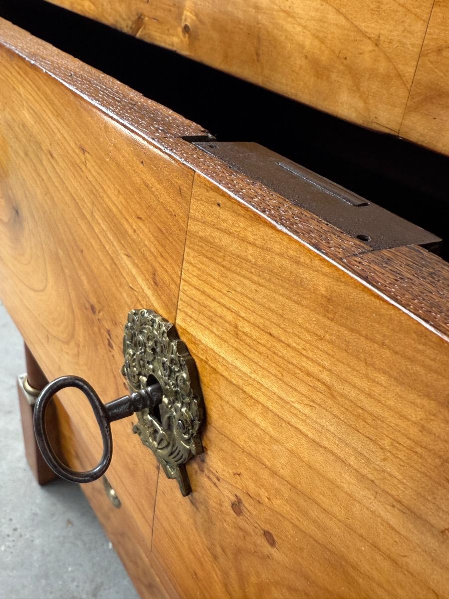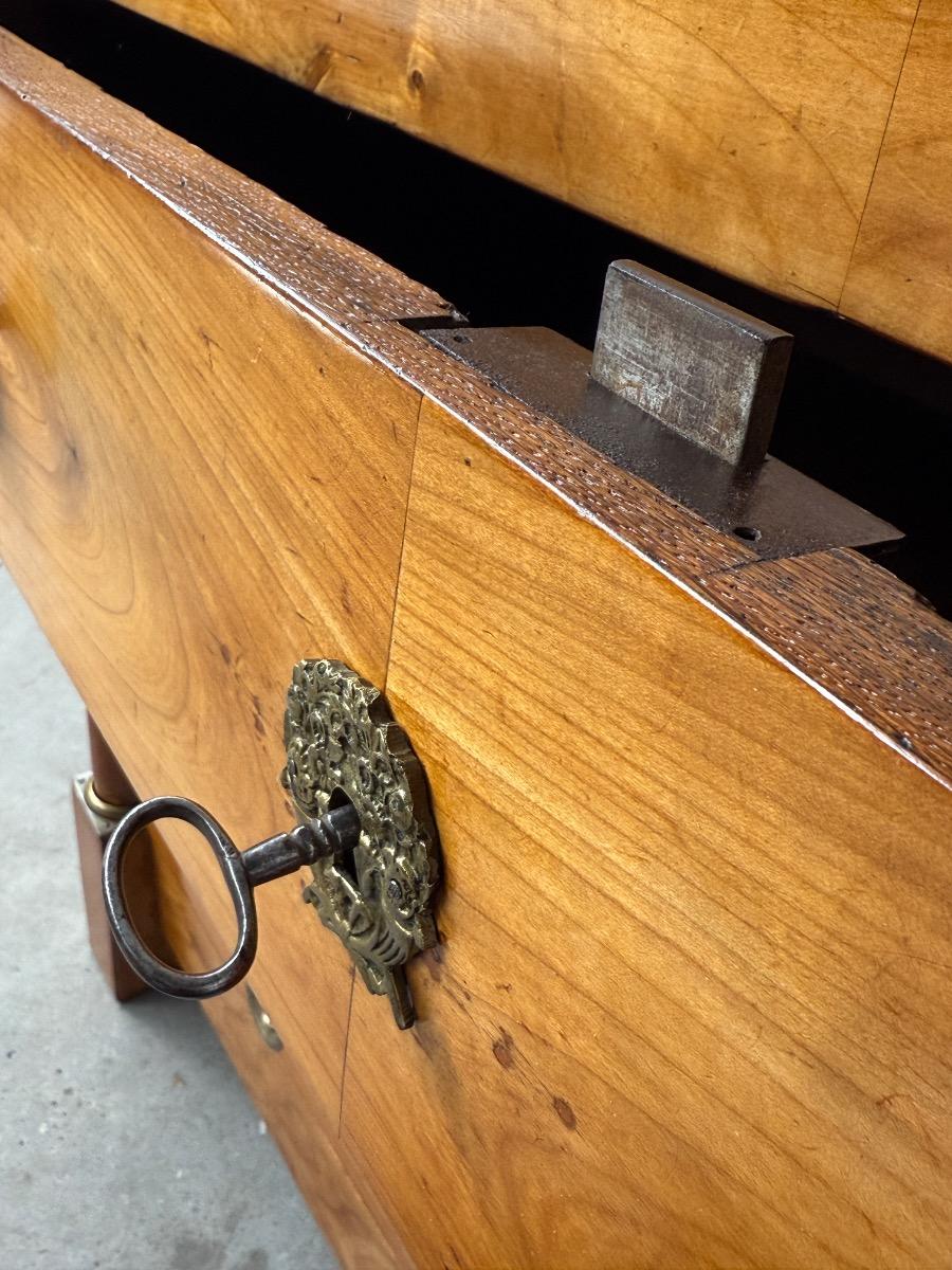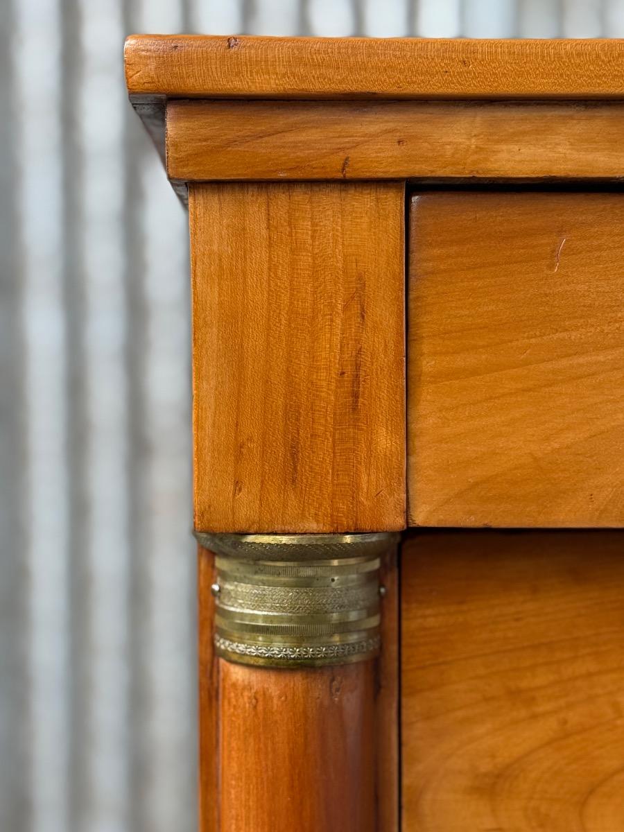 4 laden, 3 en 1 ‘blinde lade’ messing beslag, half volle pilaren met messing kapitelen. In gepaneelde zijden op blokpoot.