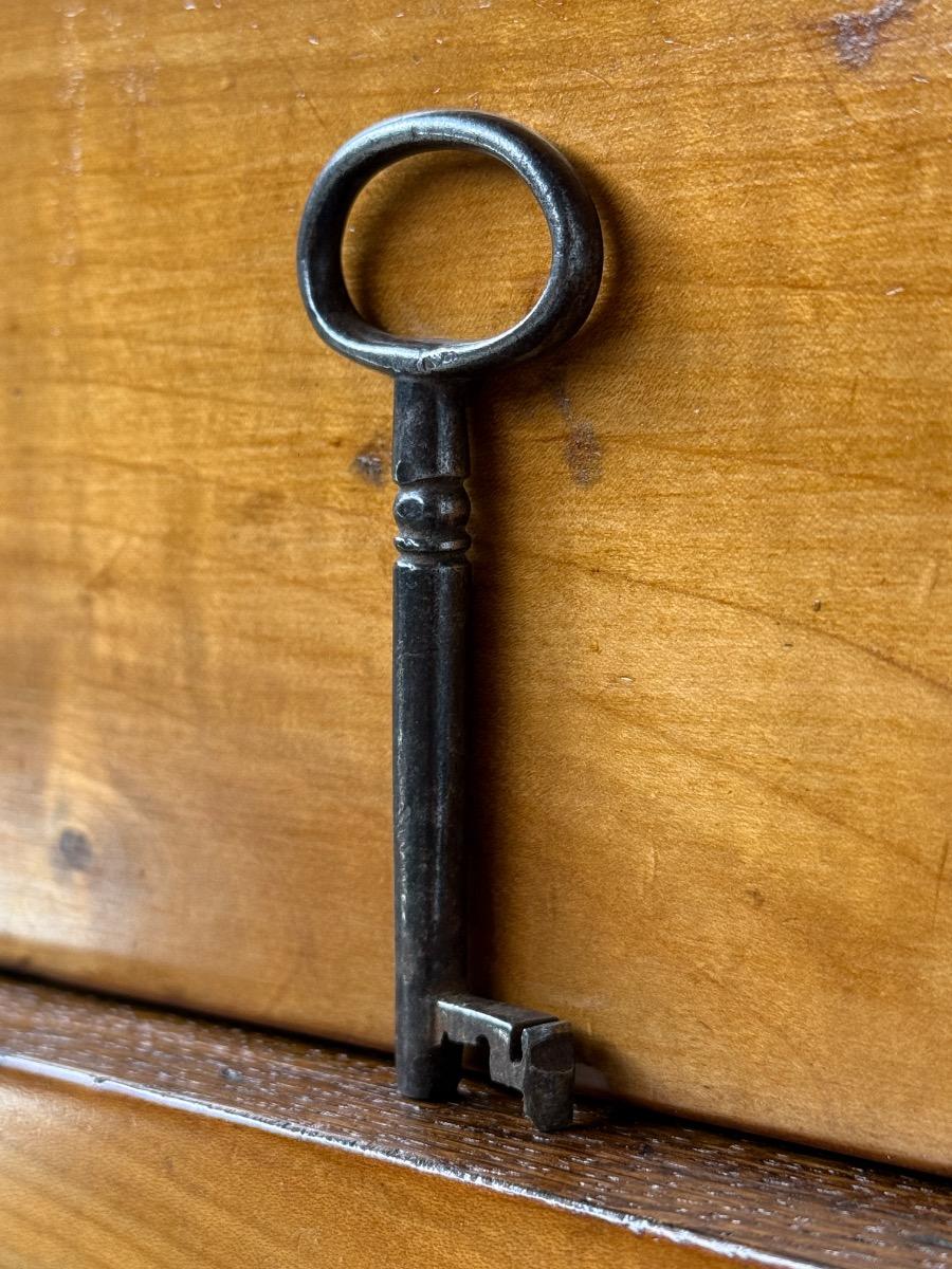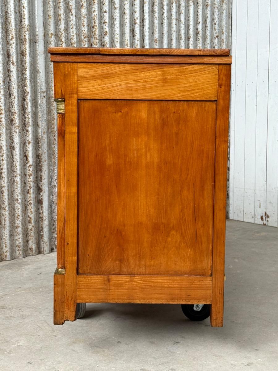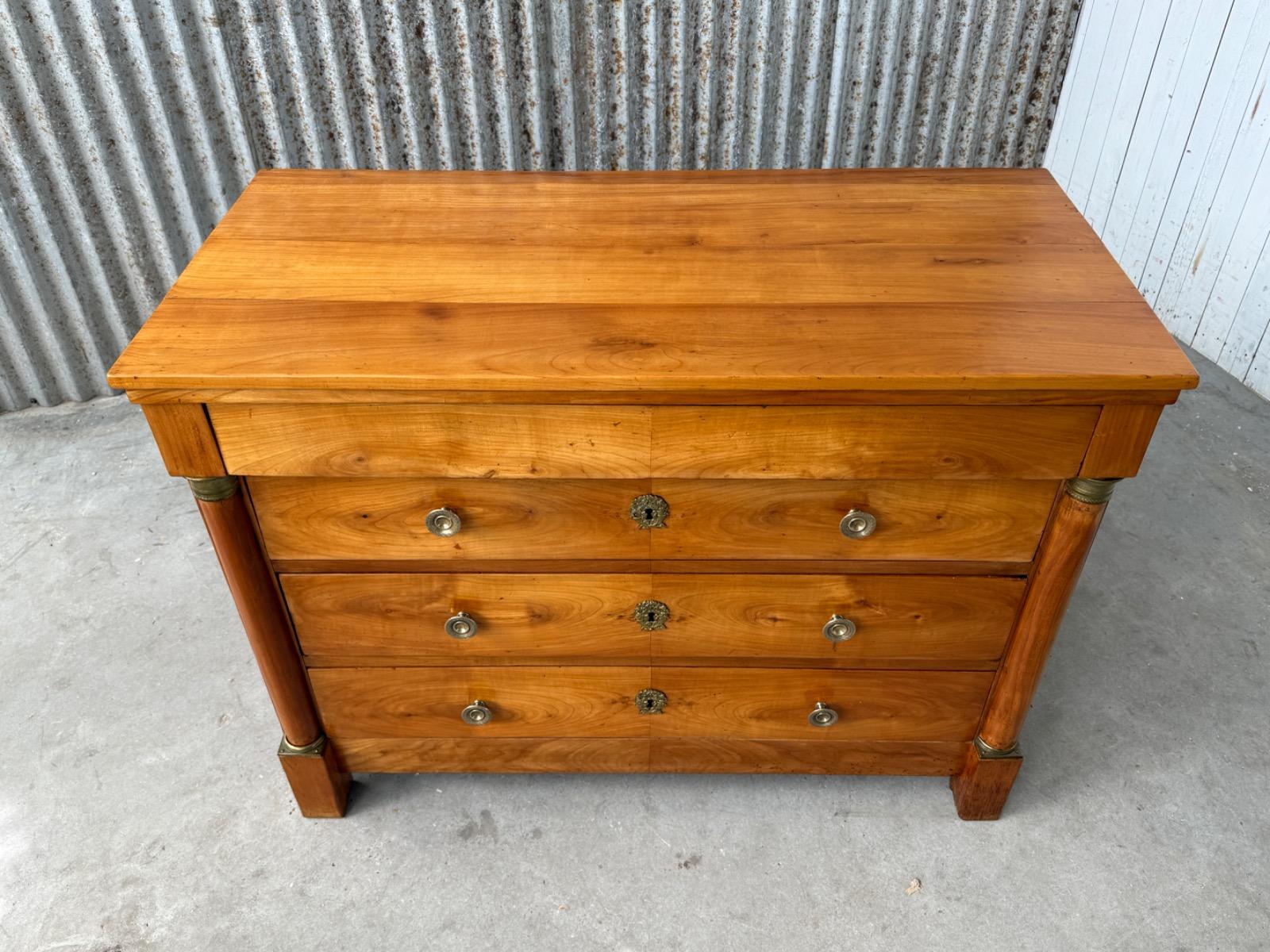 4 laden, 3 en 1 ‘blinde lade’ messing beslag, half volle pilaren met messing kapitelen. In gepaneelde zijden op blokpoot.
