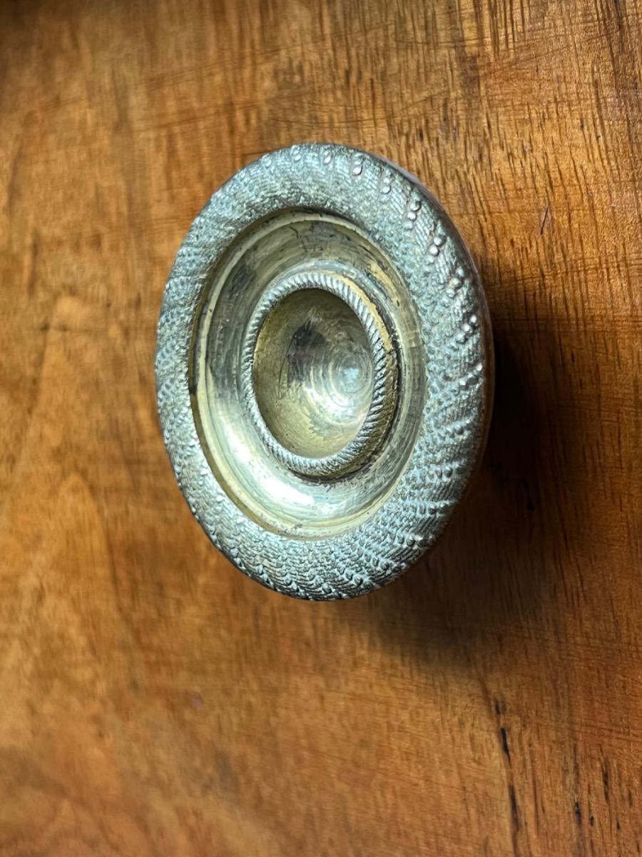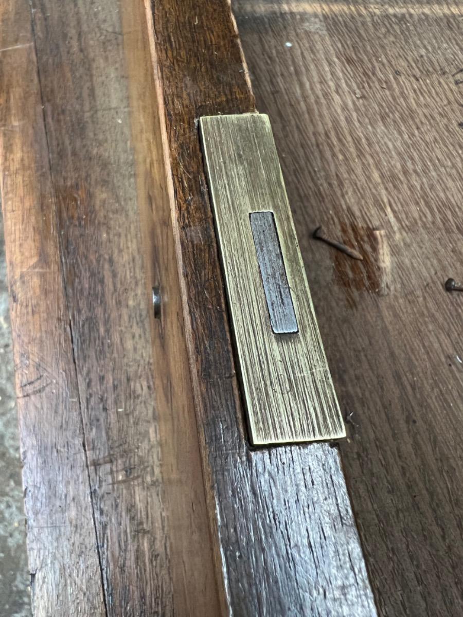 Messing knoppen en schildbeslag op de 4 laden, deze entree`s wijken qua model onderling iets af.