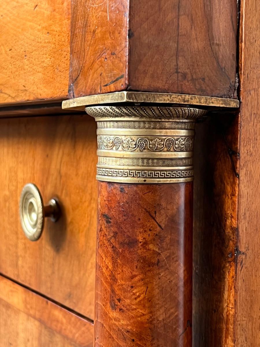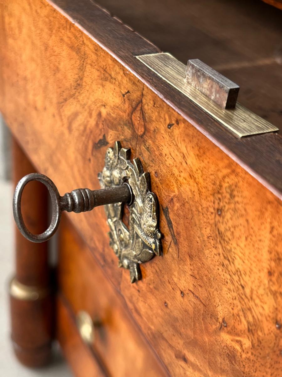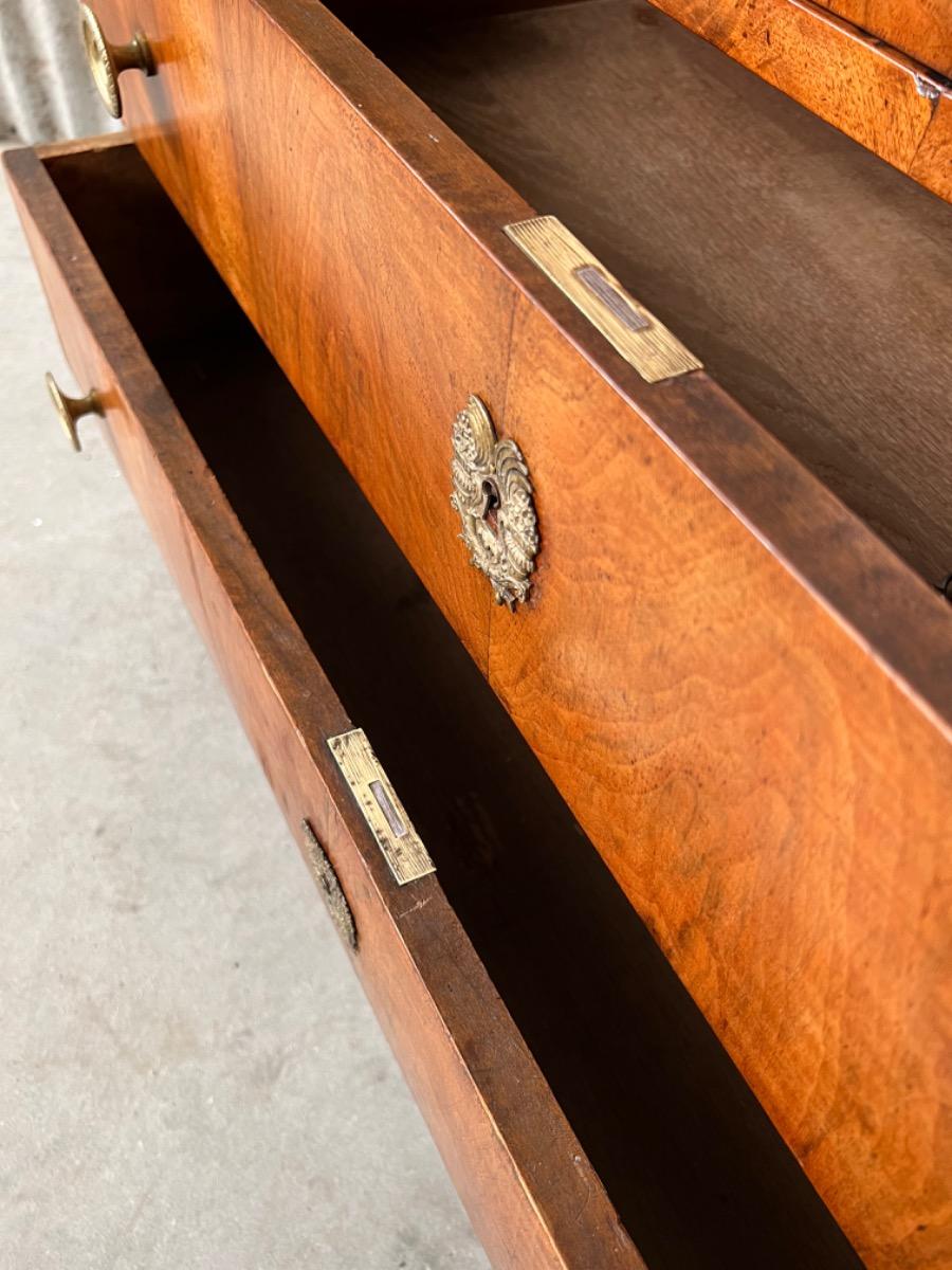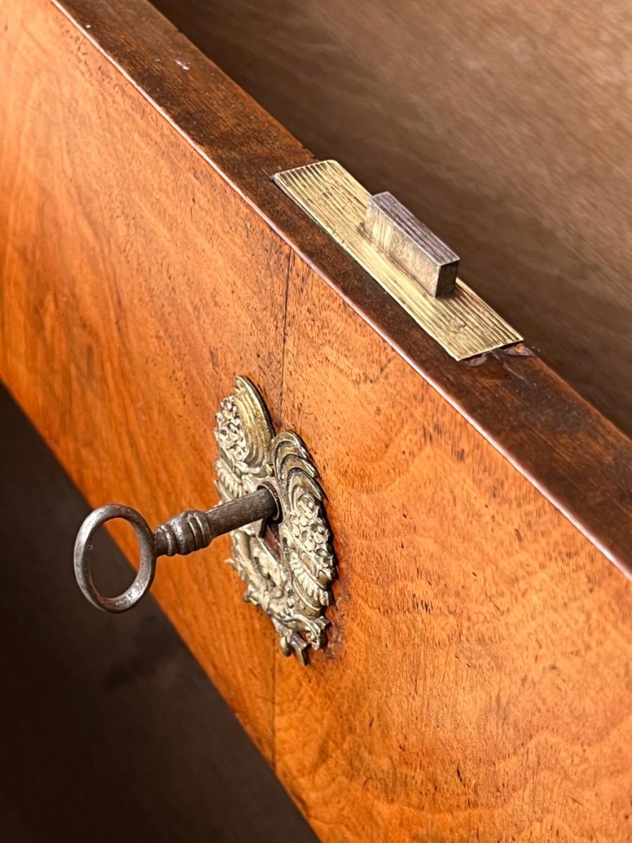 Volle notenhouten pilaren met oorspronkelijke vuurverguld messing kapitelen. Sloten oorspronkelijk, werkend mèt elke lade een sleutel.