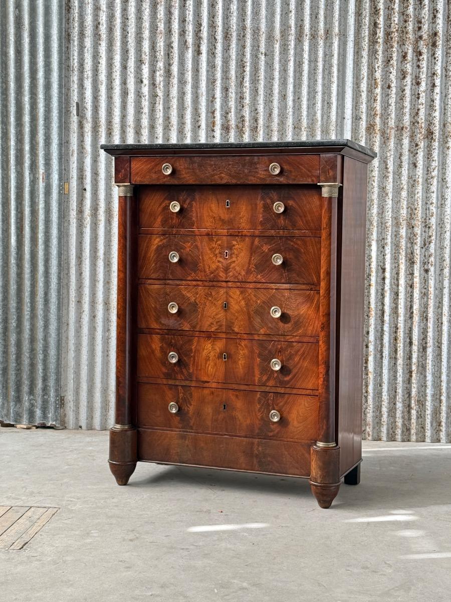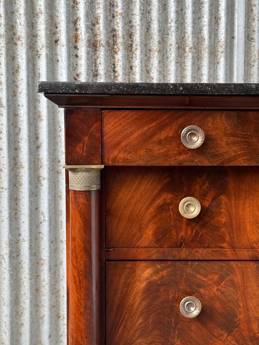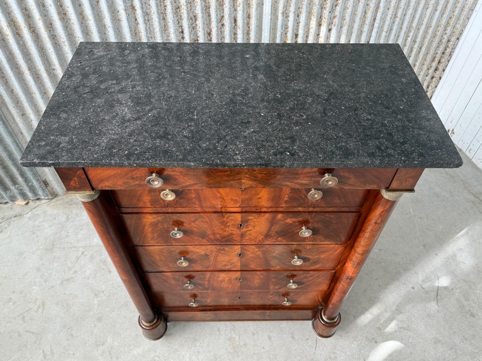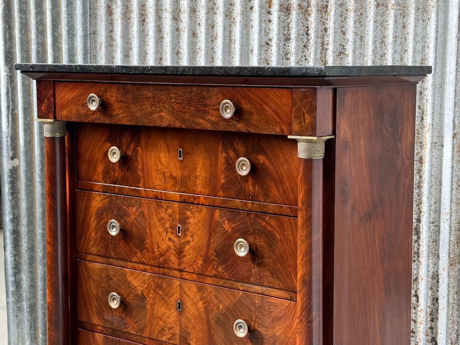 Franse empire hoge ladekast of commode, met fraai over alle laden doorlopend mahonie met het oorspronkelijke dikke (2,5. cm) gekapte Arduin hardstenen blad. Volle pilaren met oorspronkelijke vuur verguld messing kapitelen. Messing schild beslag / entree’s op de laden, met ronde knoppen. Blindhout is eiken en grenen hout. Frankrijk, goede kwaliteit, omstreeks 1800. Afm: H= 141 cm. B= 94 - 103 cm. (Op zijde gemeten - blad) D= 40 - 53 cm. (Ondiepste maat- diepste maat) Onlangs grondig nagelopen op losse delen van constructie en fineer. Geen levende houtworm aangetroffen op 16/3/2025 Comm-2753~
