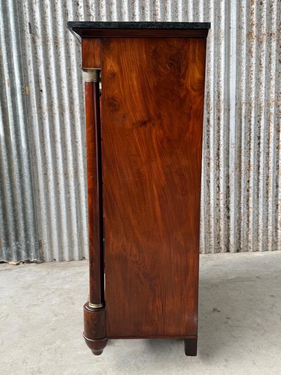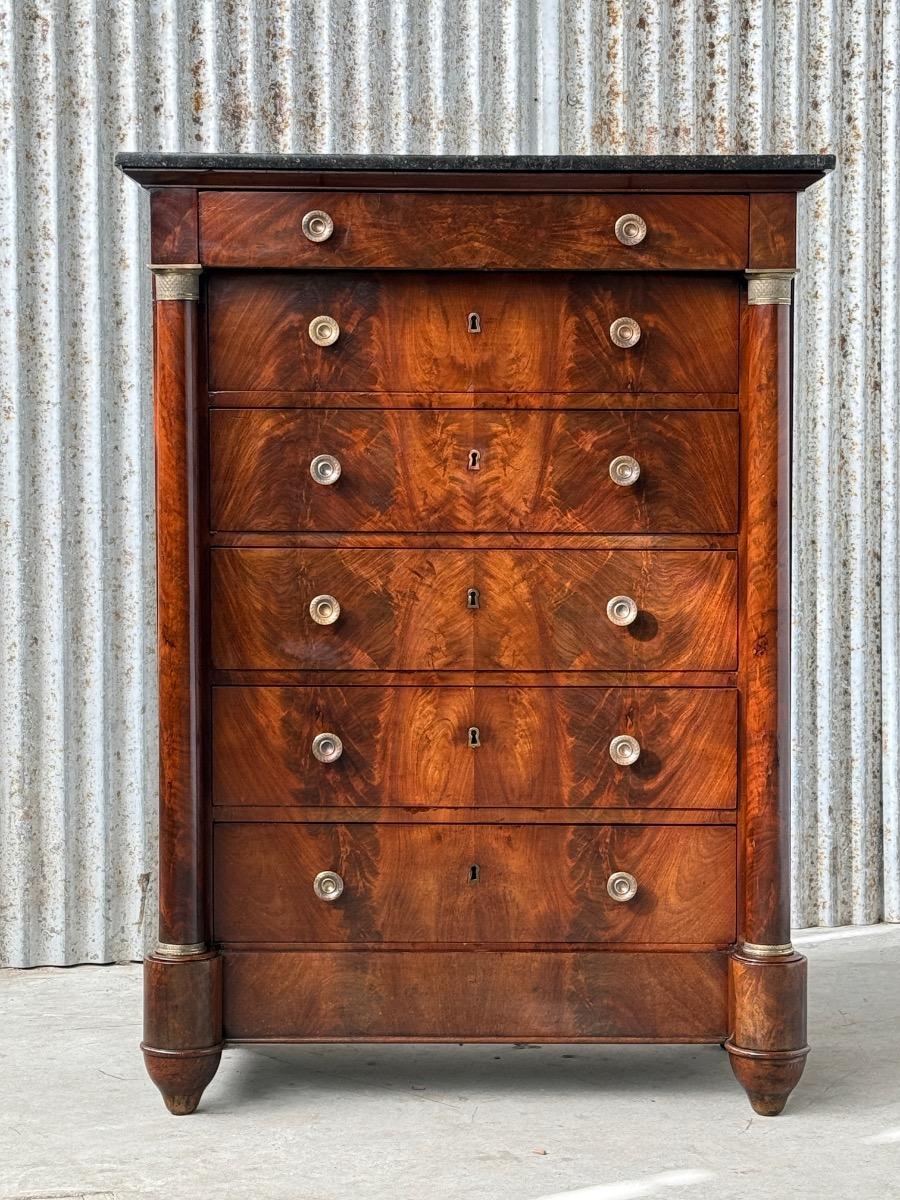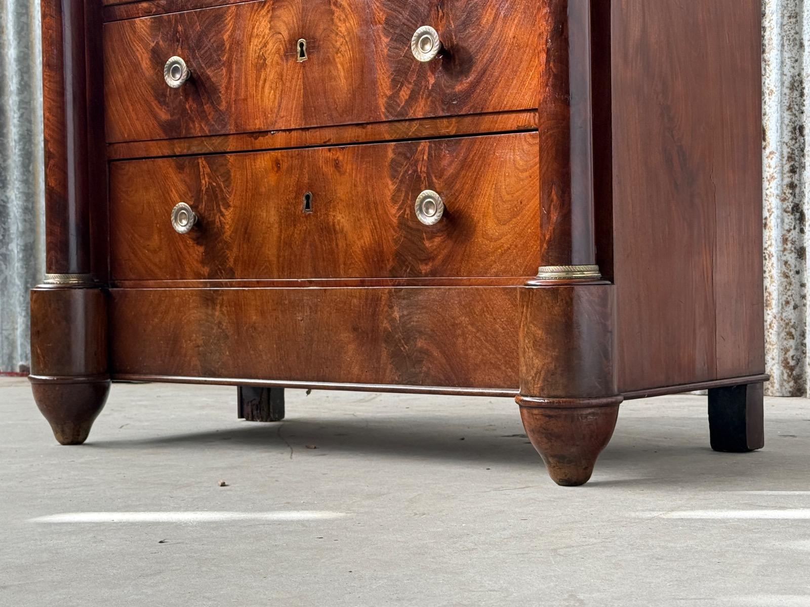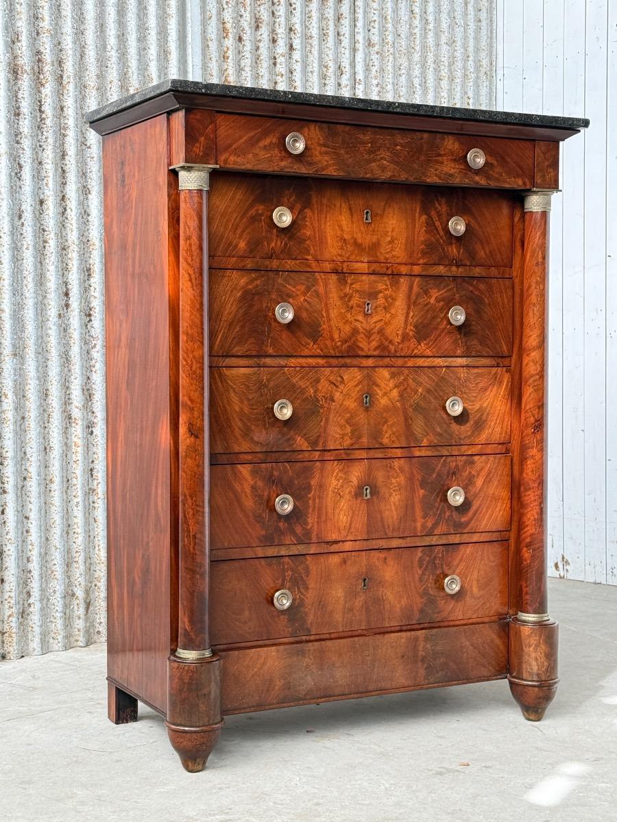 Franse empire hoge ladekast of commode, met fraai over alle laden doorlopend mahonie met het oorspronkelijke dikke (2,5. cm) gekapte Arduin hardstenen blad. Volle pilaren met oorspronkelijke vuur verguld messing kapitelen. Messing schild beslag / entree’s op de laden, met ronde knoppen. Blindhout is eiken en grenen hout. Frankrijk, goede kwaliteit, omstreeks 1800. Afm: H= 141 cm. B= 94 - 103 cm. (Op zijde gemeten - blad) D= 40 - 53 cm. (Ondiepste maat- diepste maat) Onlangs grondig nagelopen op losse delen van constructie en fineer. Geen levende houtworm aangetroffen op 16/3/2025 Comm-2753~