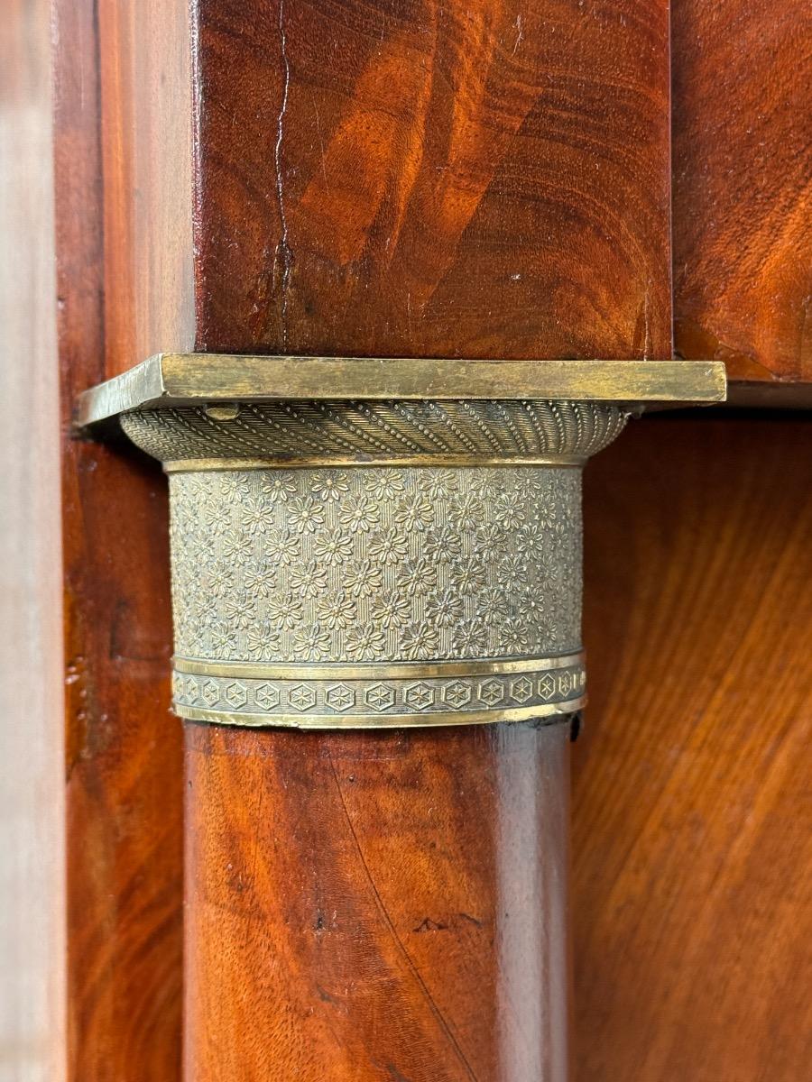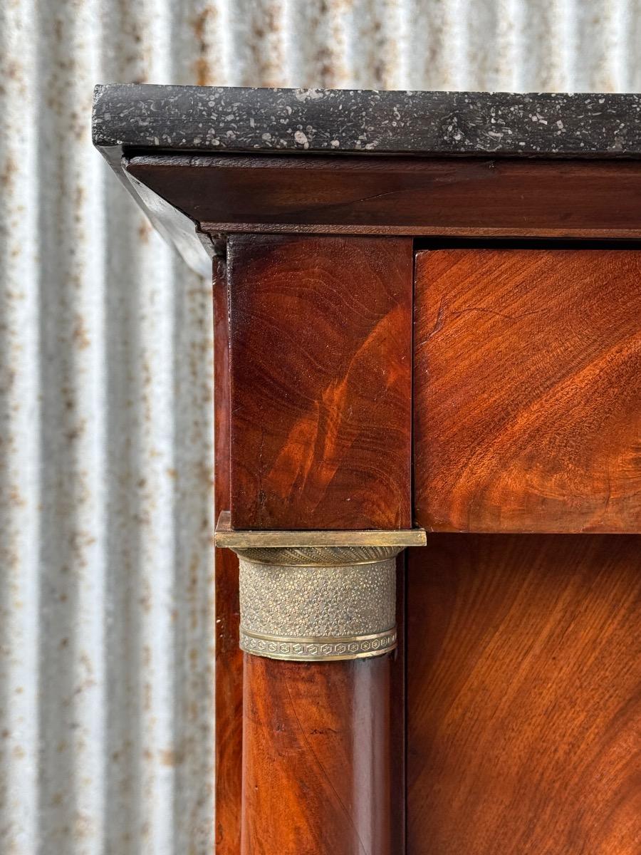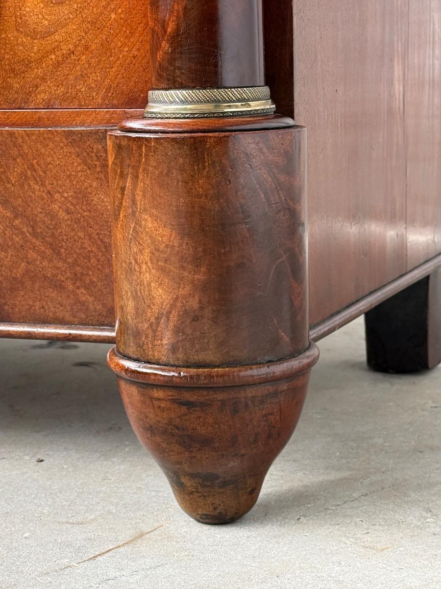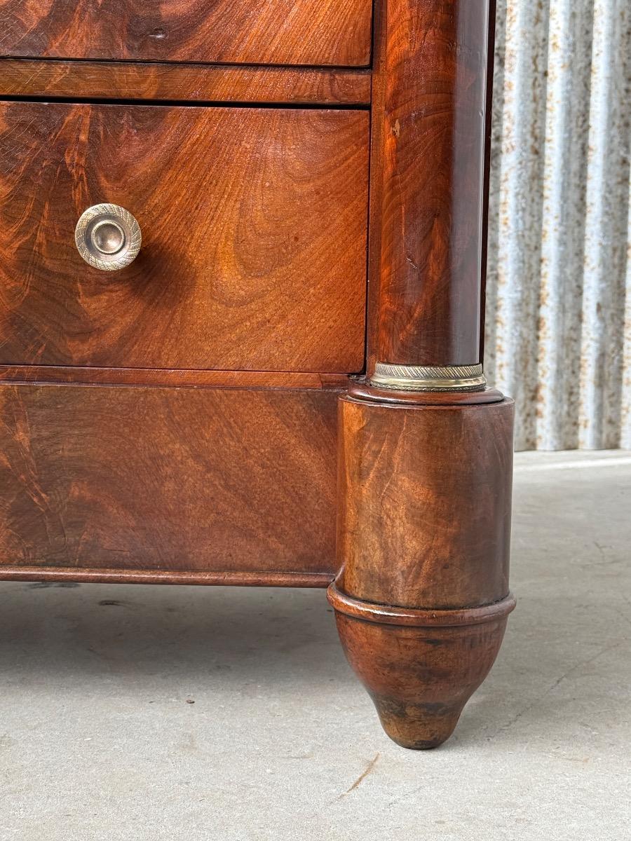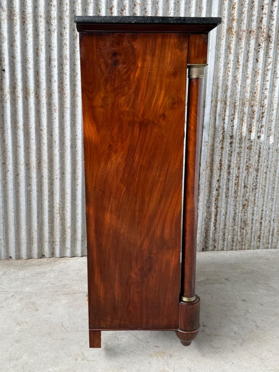 Franse empire hoge ladekast of commode, met fraai over alle laden doorlopend mahonie met het oorspronkelijke dikke (2,5. cm) gekapte Arduin hardstenen blad. Volle pilaren met oorspronkelijke vuur verguld messing kapitelen. Messing schild beslag / entree’s op de laden, met ronde knoppen. Blindhout is eiken en grenen hout. Frankrijk, goede kwaliteit, omstreeks 1800. Afm: H= 141 cm. B= 94 - 103 cm. (Op zijde gemeten - blad) D= 40 - 53 cm. (Ondiepste maat- diepste maat) Onlangs grondig nagelopen op losse delen van constructie en fineer. Geen levende houtworm aangetroffen op 16/3/2025 Comm-2753~