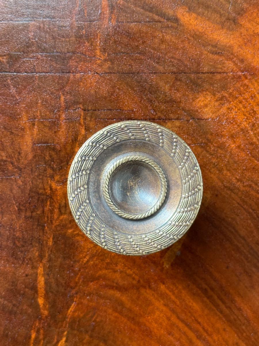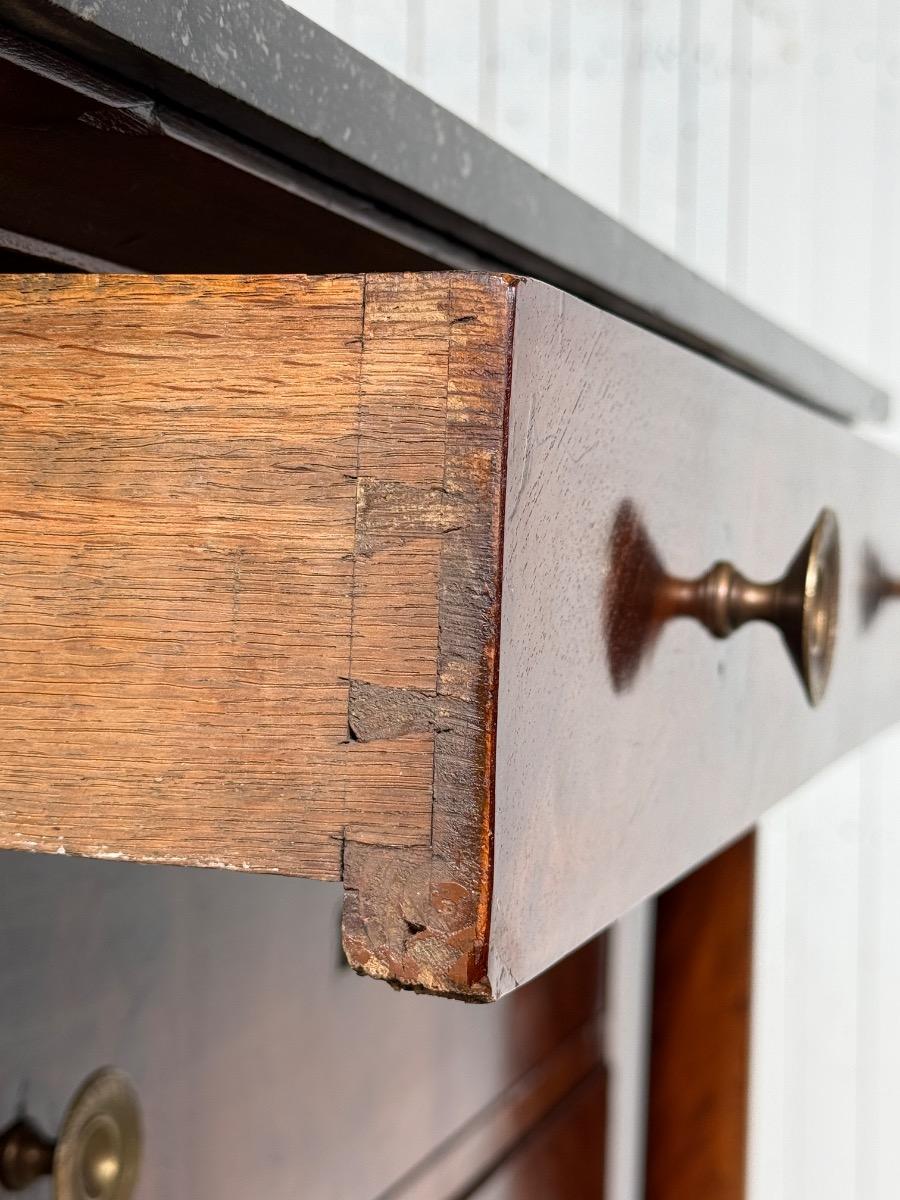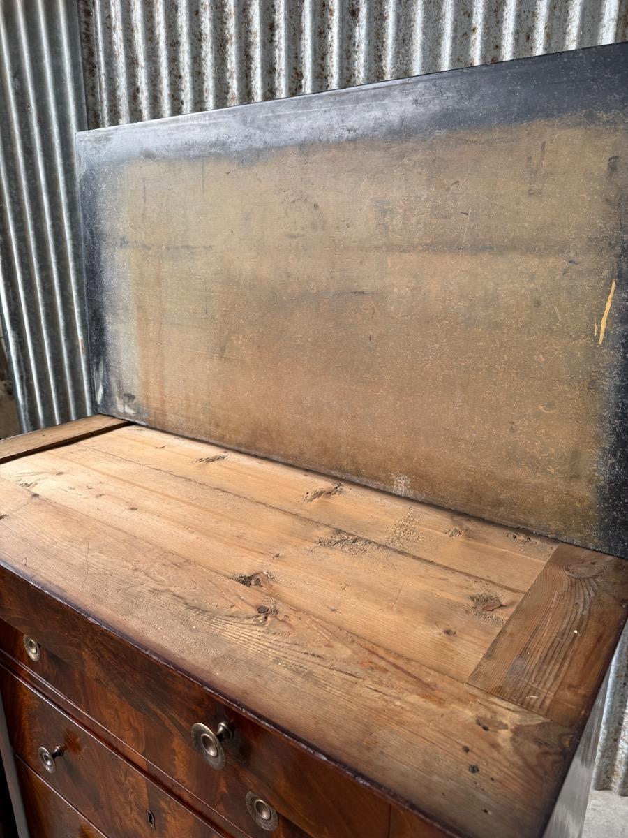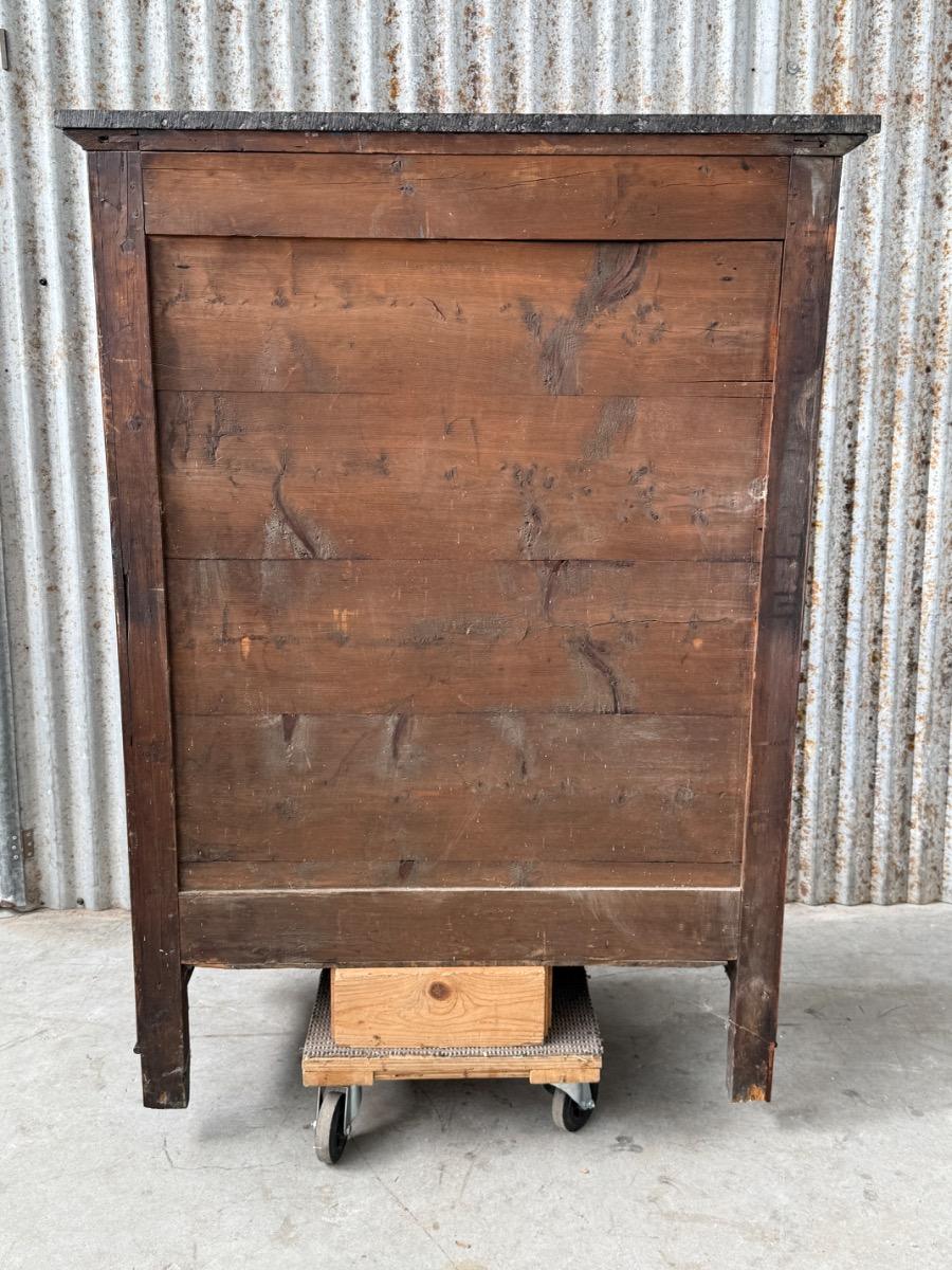 Franse empire hoge ladekast of commode, met fraai over alle laden doorlopend mahonie met het oorspronkelijke dikke (2,5. cm) gekapte Arduin hardstenen blad. Volle pilaren met oorspronkelijke vuur verguld messing kapitelen. Messing schild beslag / entree’s op de laden, met ronde knoppen. Blindhout is eiken en grenen hout. Frankrijk, goede kwaliteit, omstreeks 1800. Afm: H= 141 cm. B= 94 - 103 cm. (Op zijde gemeten - blad) D= 40 - 53 cm. (Ondiepste maat- diepste maat) Onlangs grondig nagelopen op losse delen van constructie en fineer. Geen levende houtworm aangetroffen op 16/3/2025 Comm-2753~