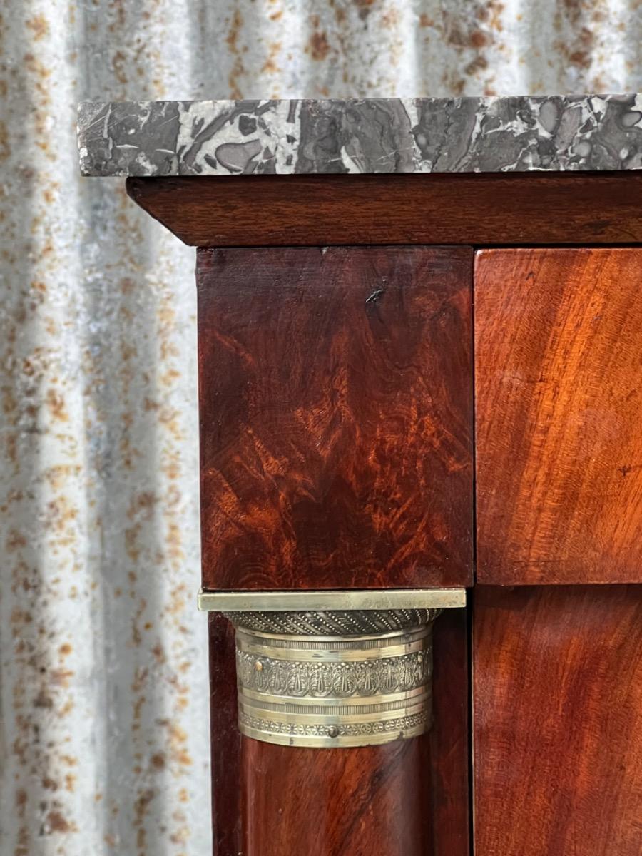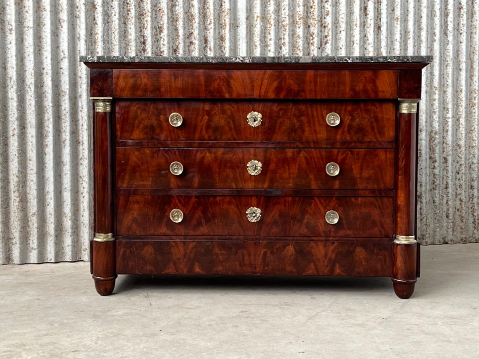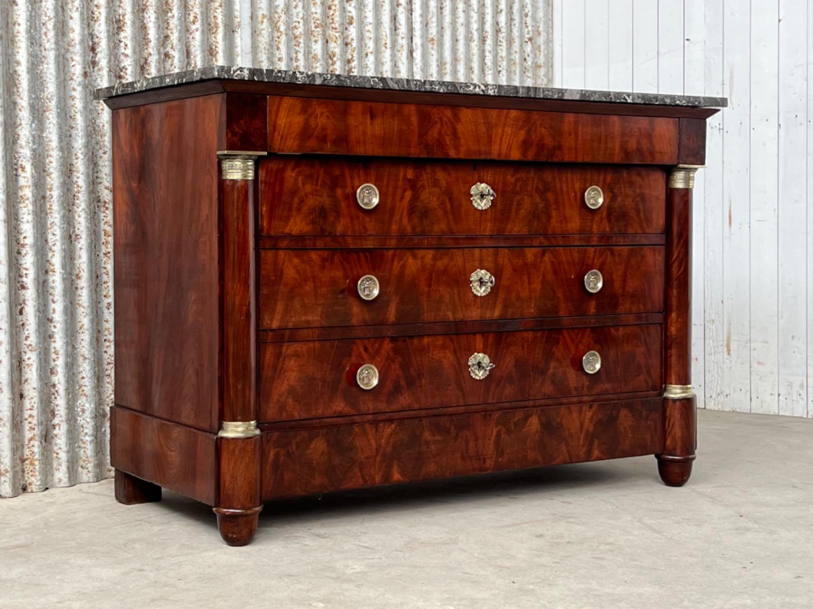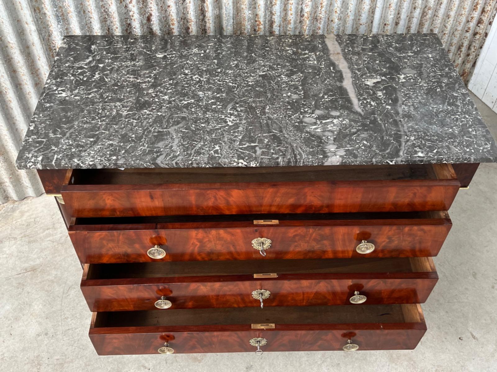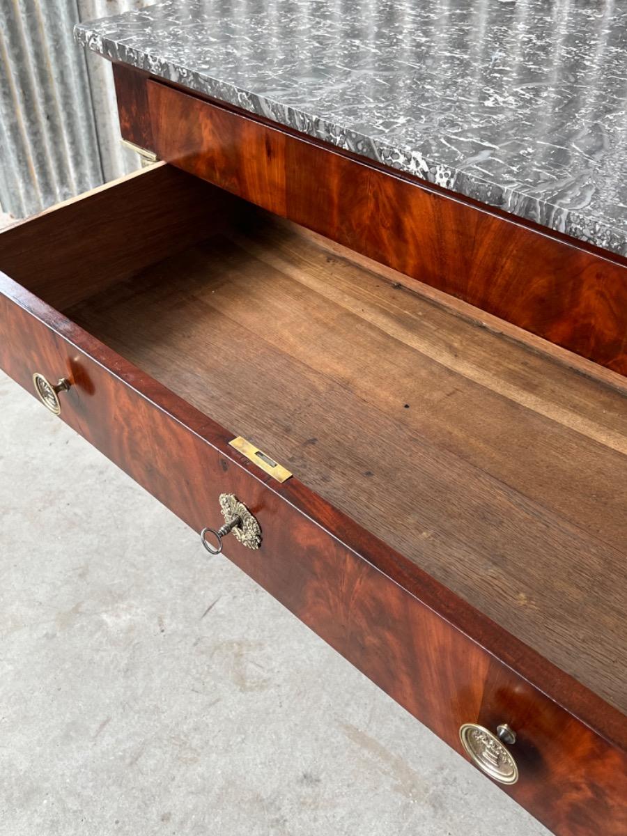 Franse empire ladekast of commode, met fraai over alle laden doorlopend mahonie met het oorspronkelijke dikke (2,5. cm) gekapte Gris Ambrosia marmeren blad.