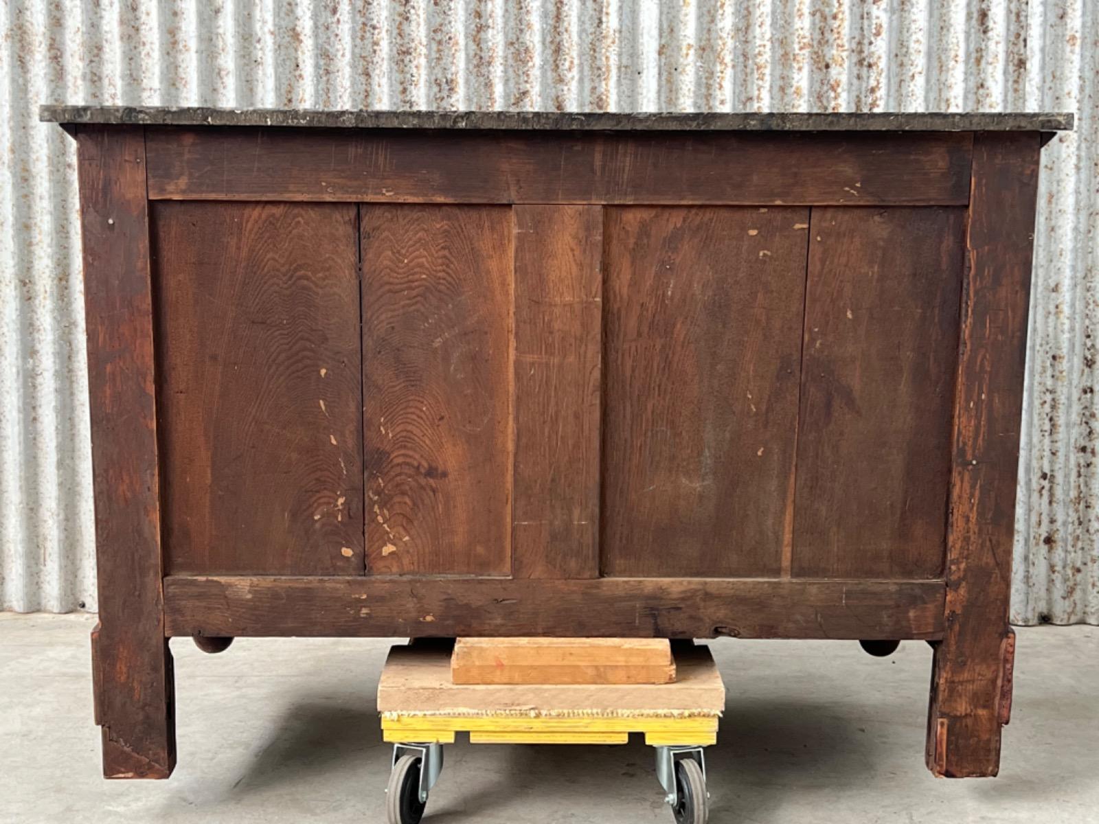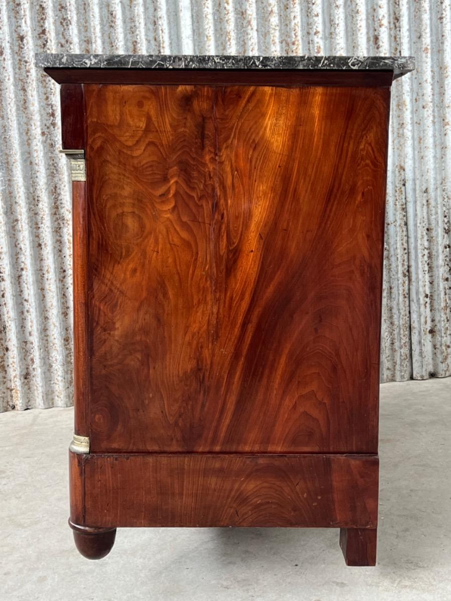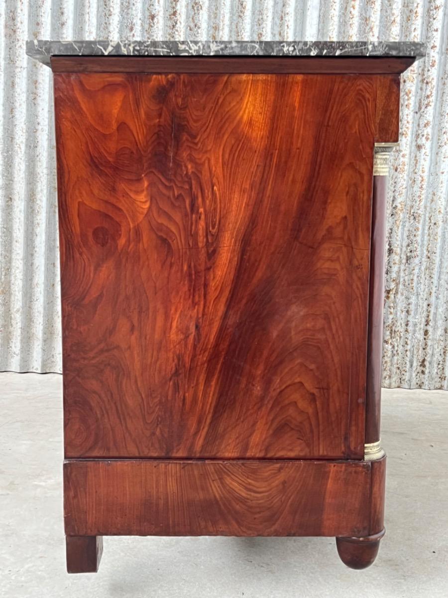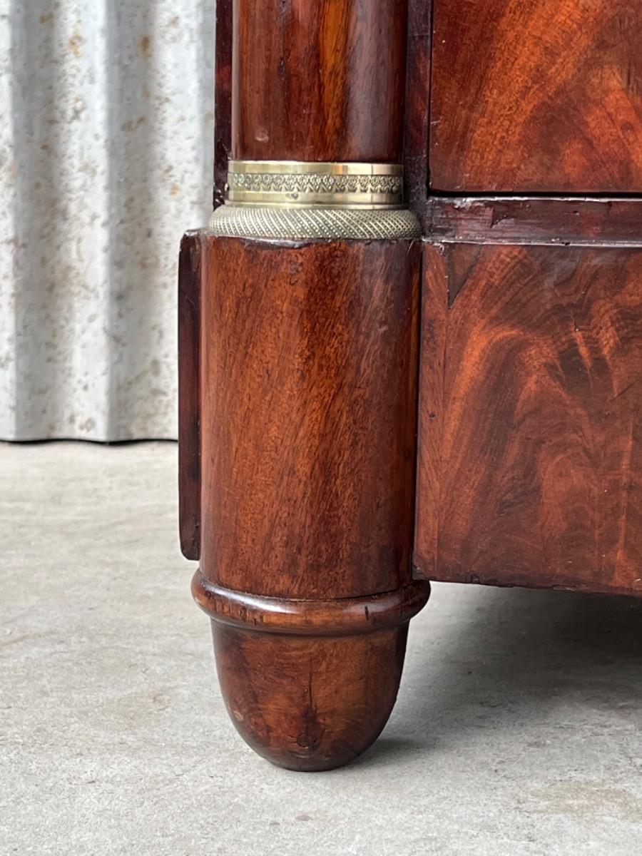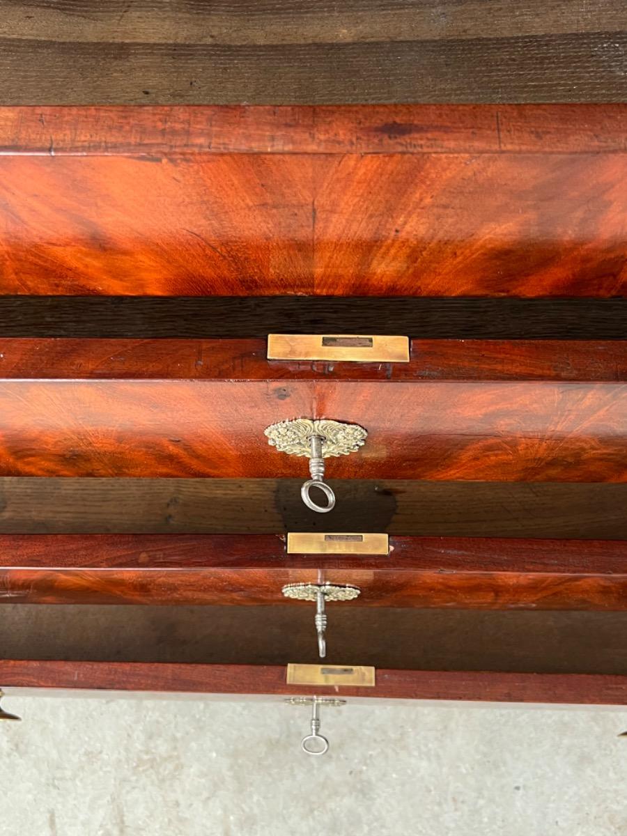 Franse empire ladekast of commode, met fraai over alle laden doorlopend mahonie met het oorspronkelijke dikke (2,5. cm) gekapte Gris Ambrosia marmeren blad.