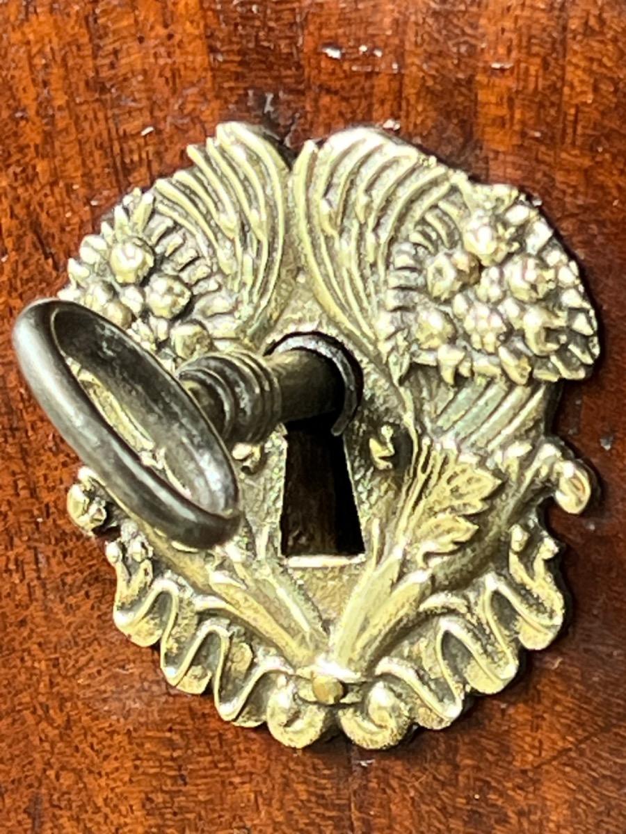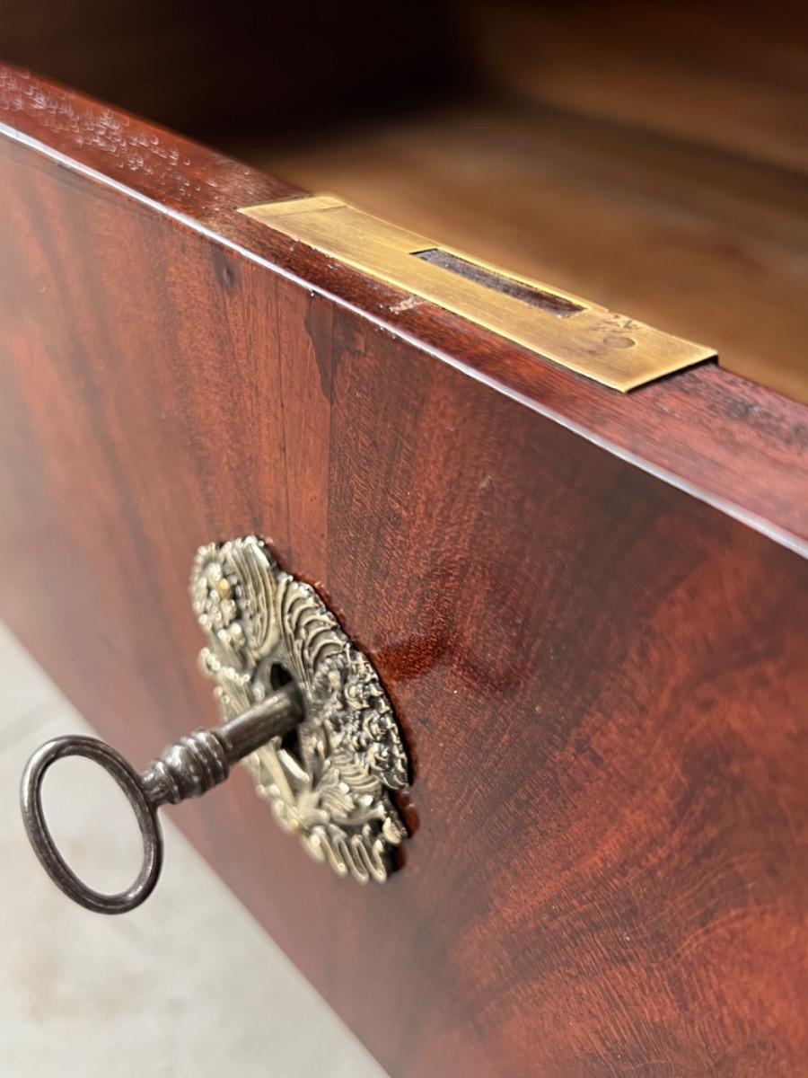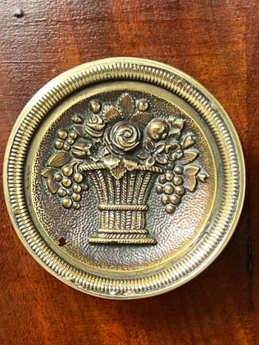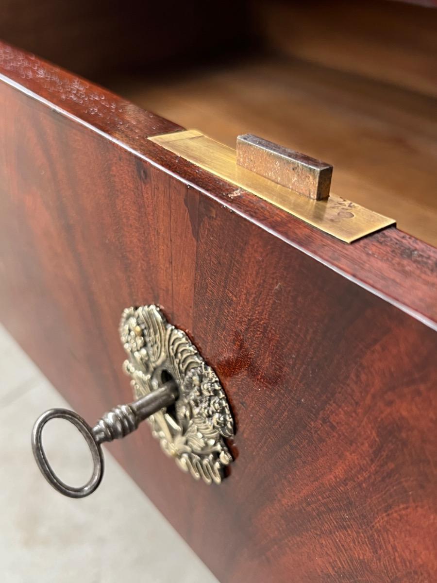 Messing knoppen en schild beslag op de 3 laden, met op de bovenste lade, dit is een ‘blinde lade’ met twee onzichtbare grepen aan onderzijde van de iets overstekende lade.