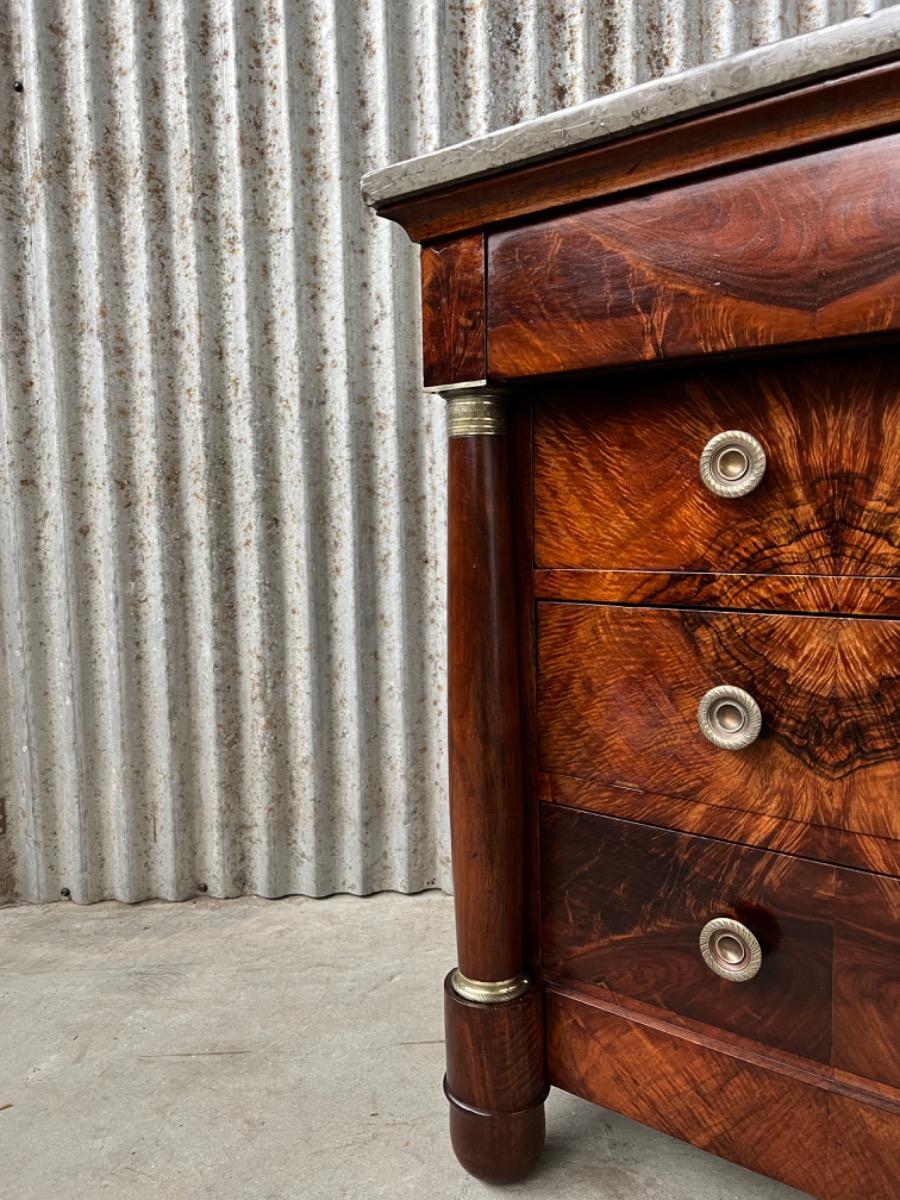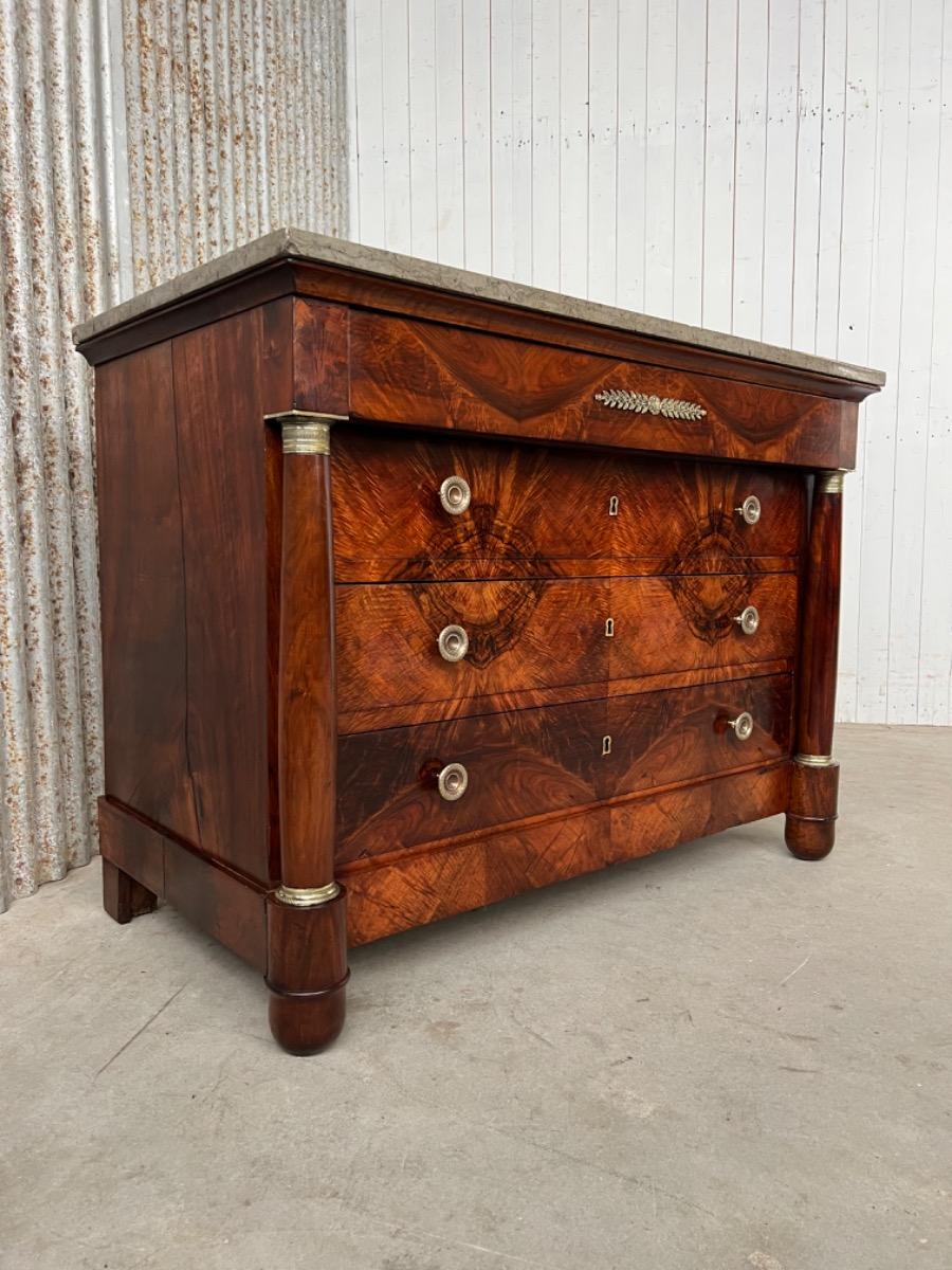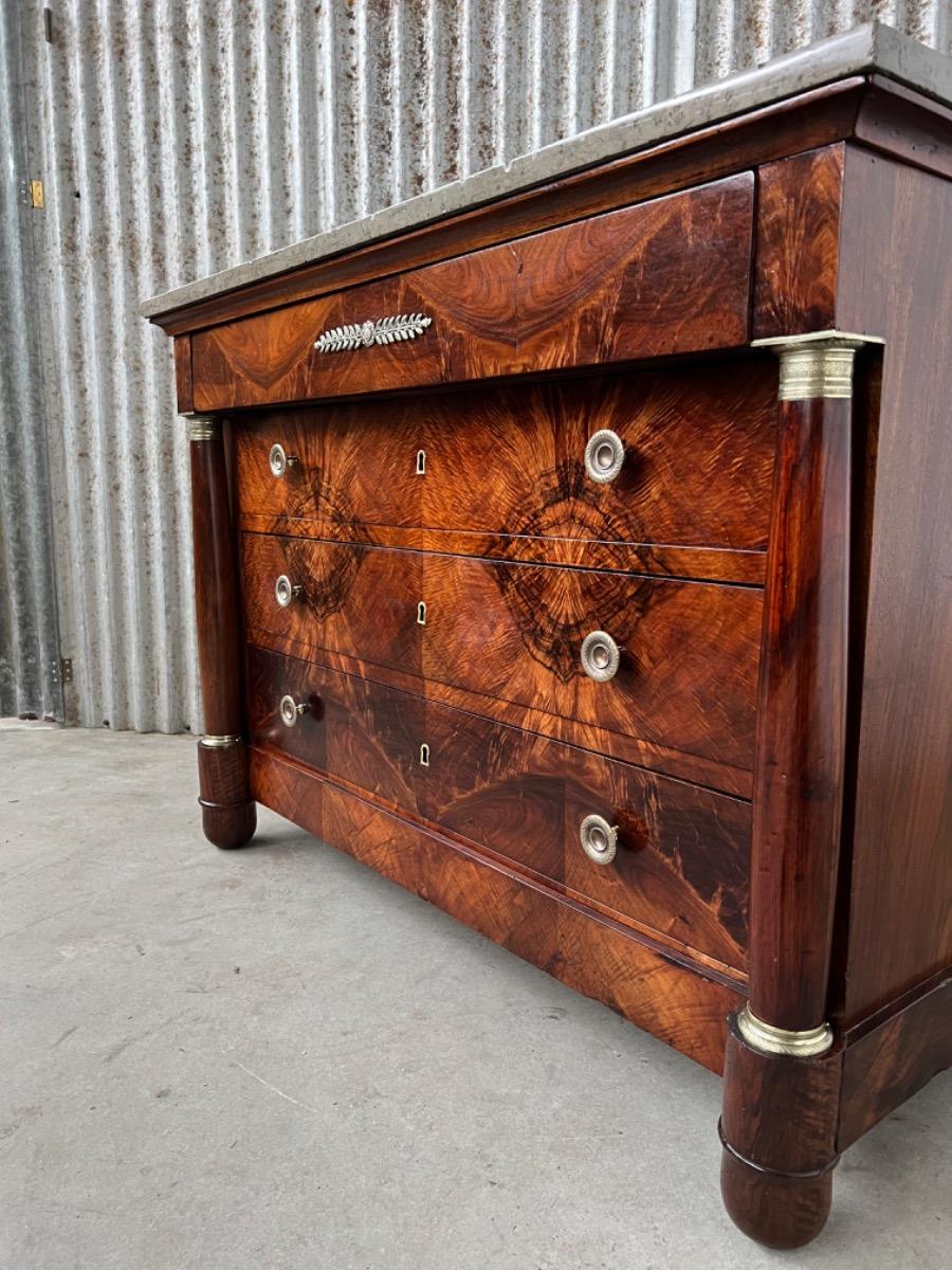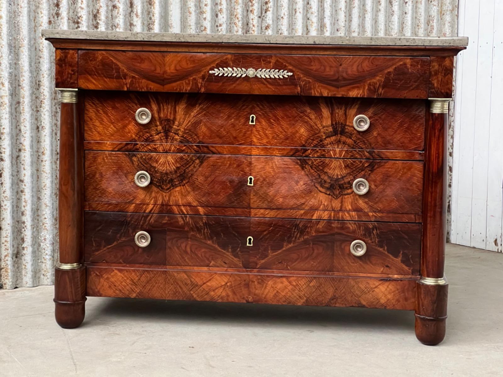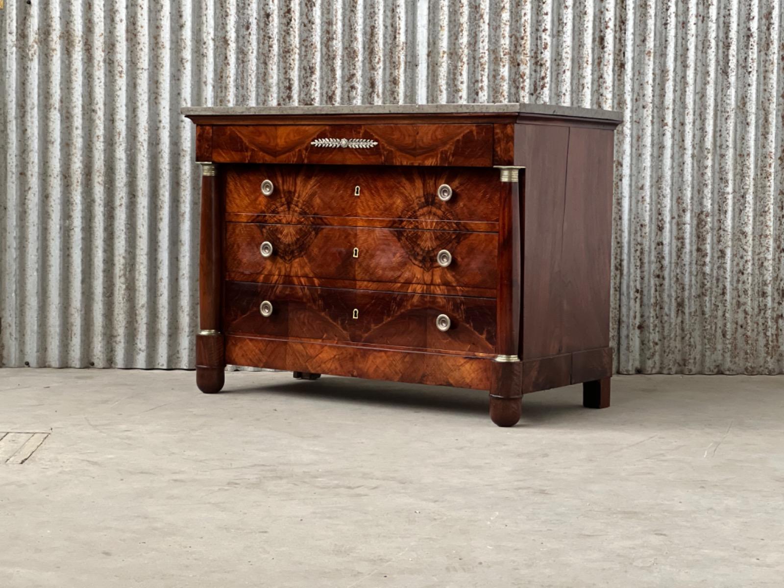 Franse empire ladekast of commode, met fraai over alle laden doorlopend Noten, met het oorspronkelijke dikke (2,5. cm) gekapte Gris Ambrosia marmeren blad. Volle noten houten pilaren met oorspronkelijke vuur verguld messing kapitelen. Oorspronkelijke sloten aanwezig. Messing knoppen en schildbeslag op de 3 laden, met op de bovenste lade, dit is een ‘blinde lade’ met twee onzichtbare grepen aan onderzijde van de iets overstekende lade. Blindhout ook walnoten of notenhout. Frankrijk, goede kwaliteit, omstreeks 1800. Afm: H= 92cm. B= 121 - 125 cm. (Op zijde gemeten - blad) D= 54 - 64 cm. (Ondiepste maat- diepste maat) Onlangs grondig nagelopen op losse delen van constructie en fineer. Geen levende houtworm aangetroffen op 24/3/2023. Comm-2556~