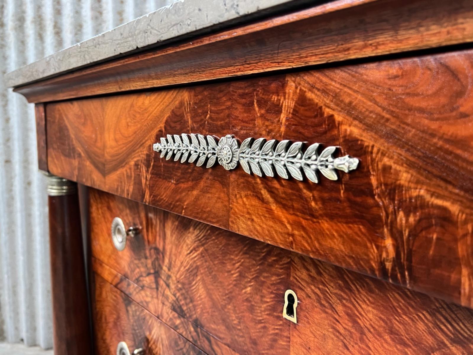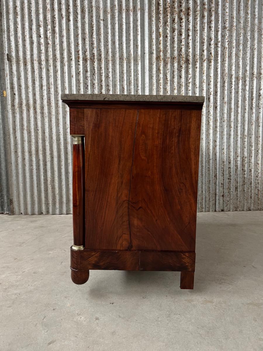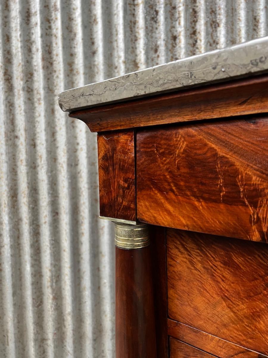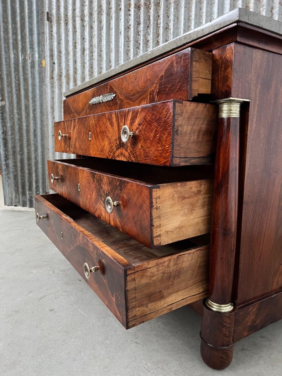 Franse empire ladekast of commode, met fraai over alle laden doorlopend Noten, met het oorspronkelijke dikke (2,5. cm) gekapte Gris Ambrosia marmeren blad. Volle noten houten pilaren met oorspronkelijke vuur verguld messing kapitelen. Oorspronkelijke sloten aanwezig. Messing knoppen en schildbeslag op de 3 laden, met op de bovenste lade, dit is een ‘blinde lade’ met twee onzichtbare grepen aan onderzijde van de iets overstekende lade. Blindhout ook walnoten of notenhout. Frankrijk, goede kwaliteit, omstreeks 1800. Afm: H= 92cm. B= 121 - 125 cm. (Op zijde gemeten - blad) D= 54 - 64 cm. (Ondiepste maat- diepste maat) Onlangs grondig nagelopen op losse delen van constructie en fineer. Geen levende houtworm aangetroffen op 24/3/2023. Comm-2556~