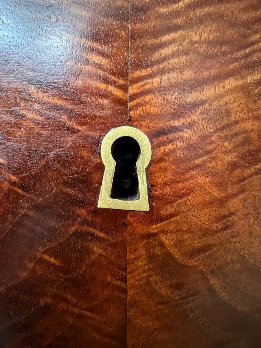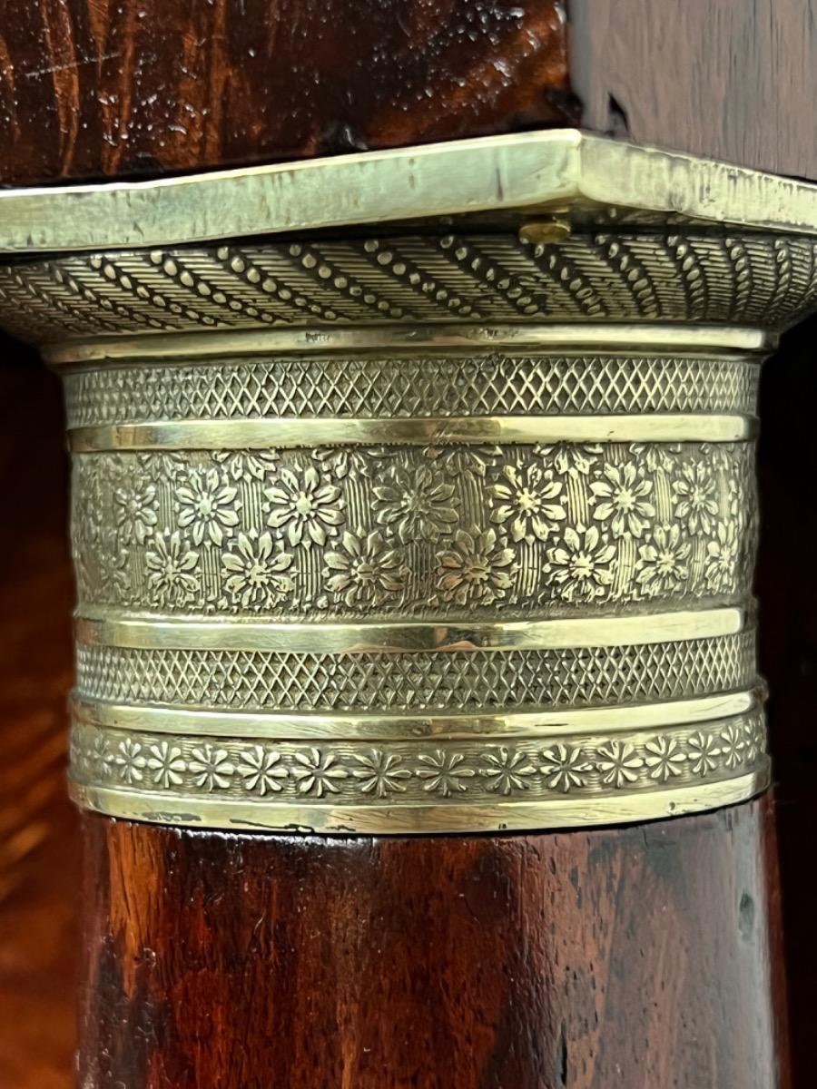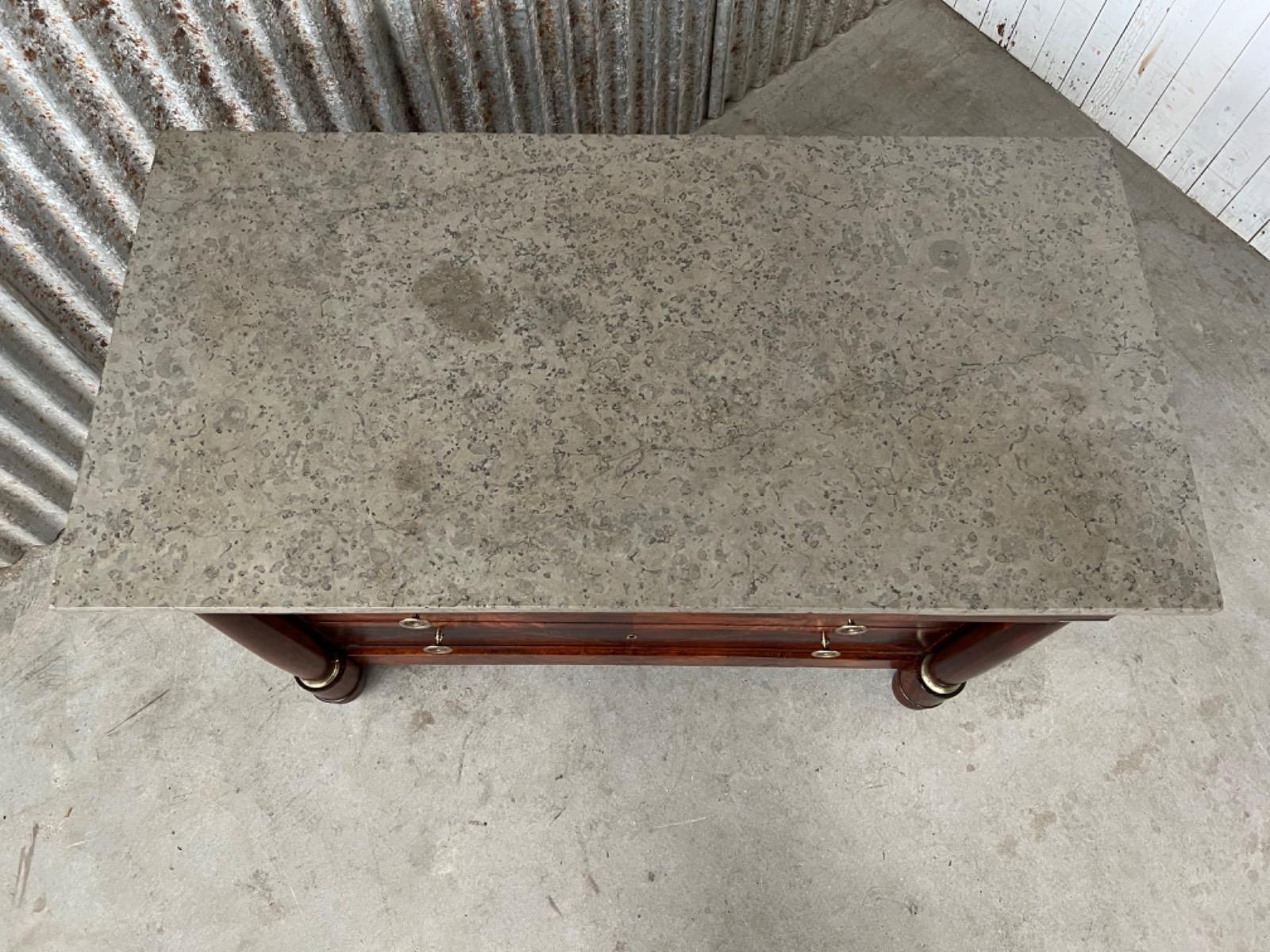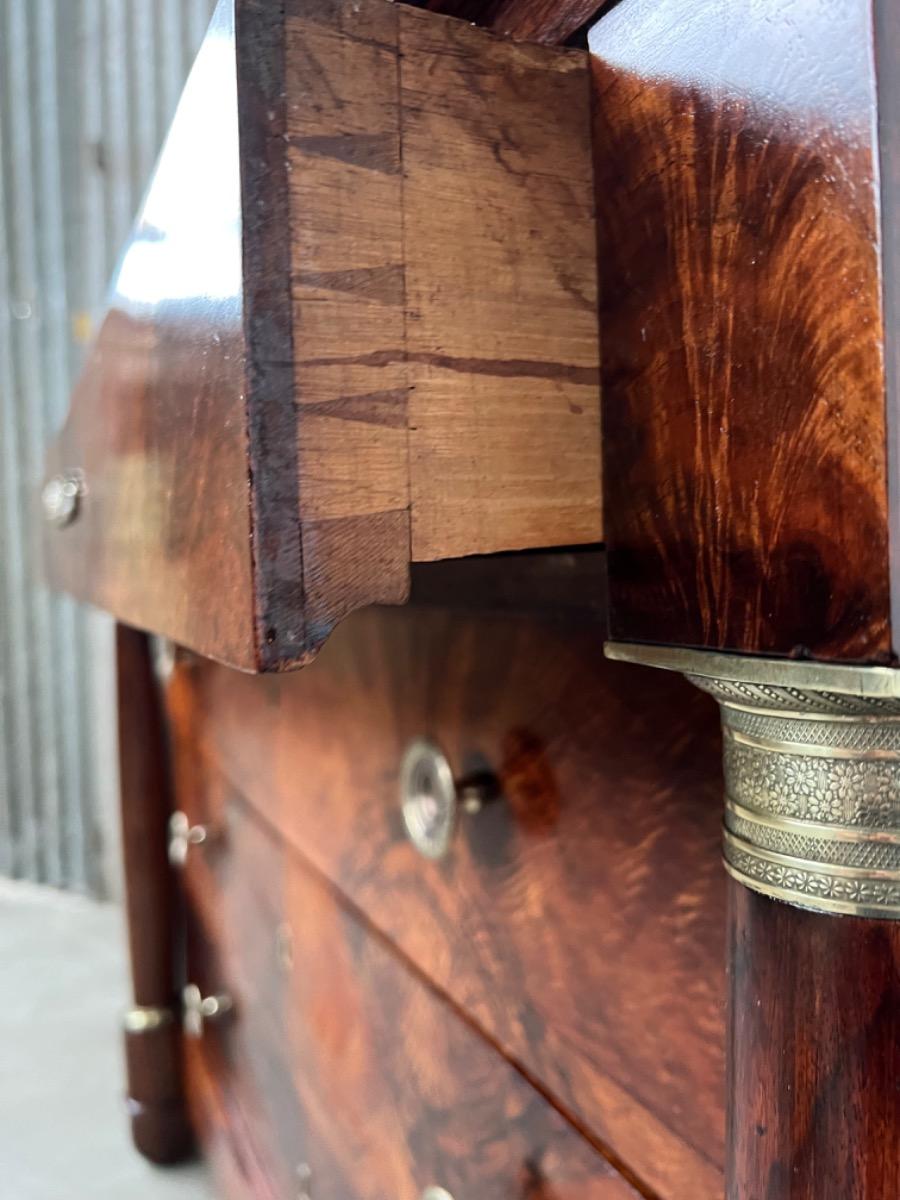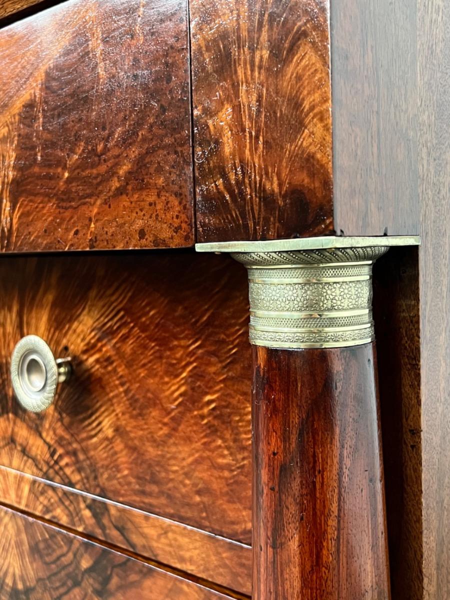 Franse empire ladekast of commode, met fraai over alle laden doorlopend Noten, met het oorspronkelijke dikke (2,5. cm) gekapte Gris Ambrosia marmeren blad. Volle noten houten pilaren met oorspronkelijke vuur verguld messing kapitelen. Oorspronkelijke sloten aanwezig. Messing knoppen en schildbeslag op de 3 laden, met op de bovenste lade, dit is een ‘blinde lade’ met twee onzichtbare grepen aan onderzijde van de iets overstekende lade. Blindhout ook walnoten of notenhout. Frankrijk, goede kwaliteit, omstreeks 1800. Afm: H= 92cm. B= 121 - 125 cm. (Op zijde gemeten - blad) D= 54 - 64 cm. (Ondiepste maat- diepste maat) Onlangs grondig nagelopen op losse delen van constructie en fineer. Geen levende houtworm aangetroffen op 24/3/2023. Comm-2556~