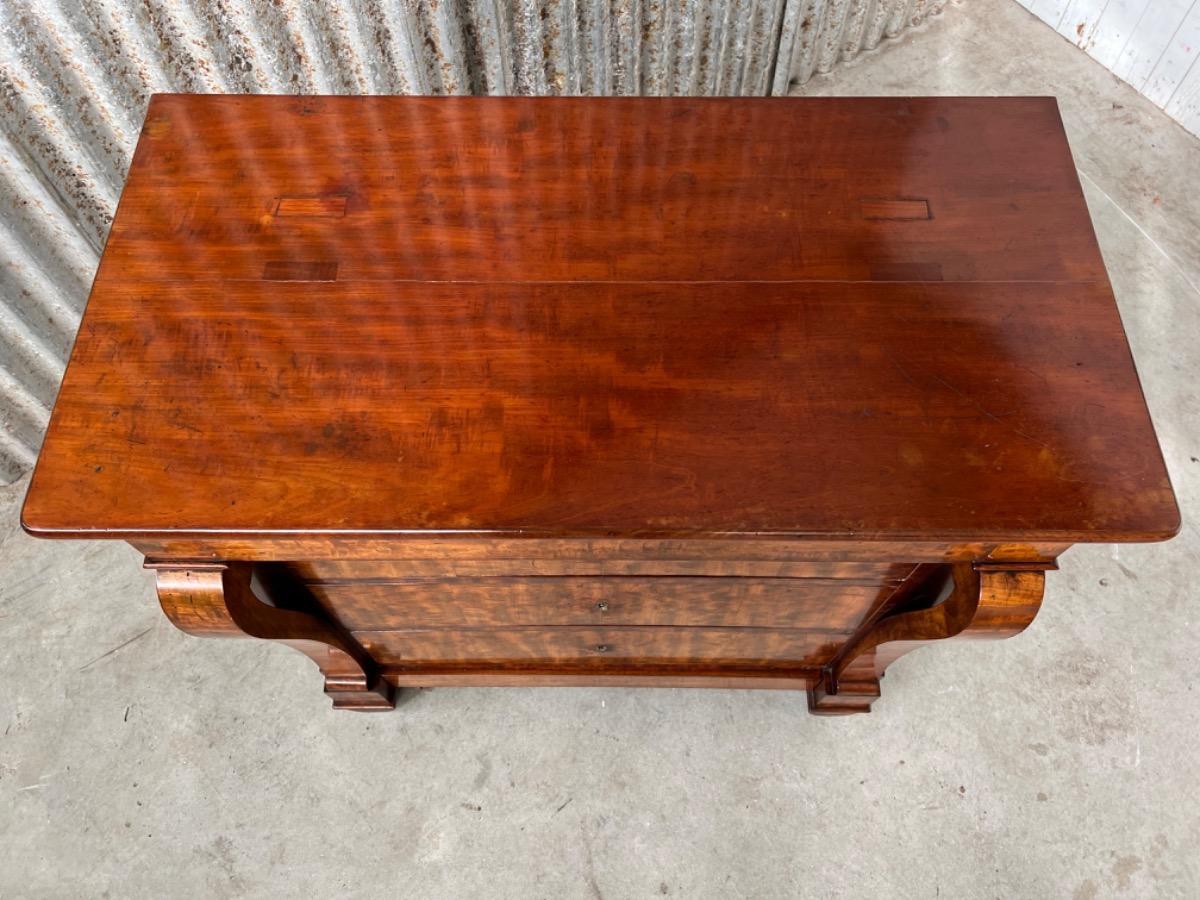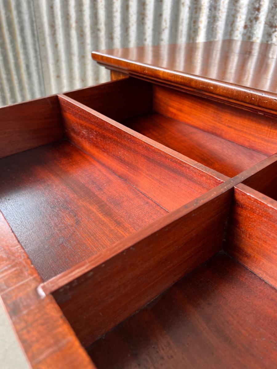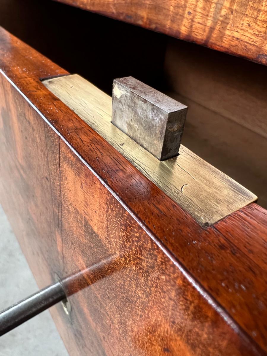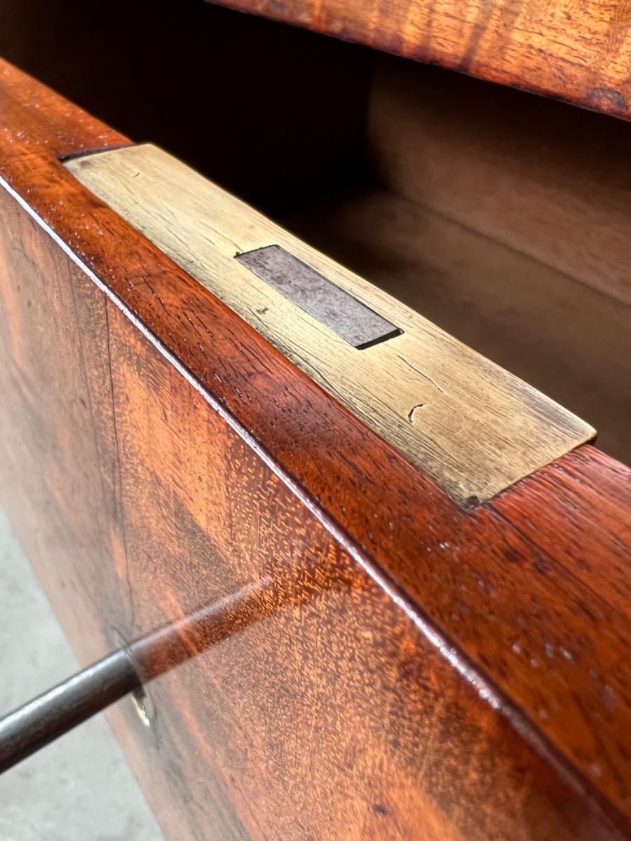 Mahonie ladekast of commode met kap waarin een verborgen of blinde lade. Bijzondere daar aan is dat de lade zelf gemaakt is van massief mahonie. Zie de foto’s. Daaronder 3 laden met slot, bovenste lade vergrendelt ook de bovenste ‘blinde’ lade.