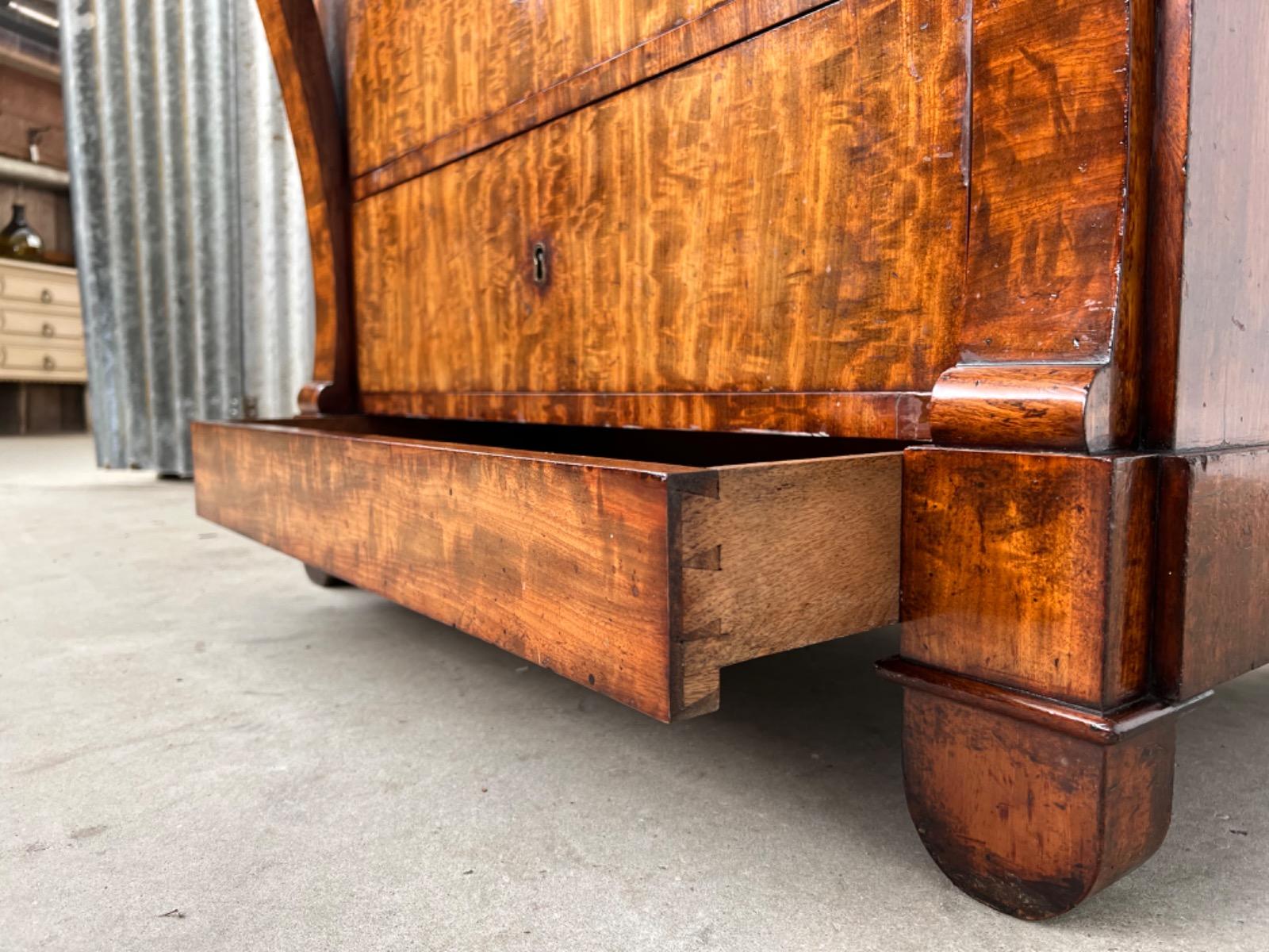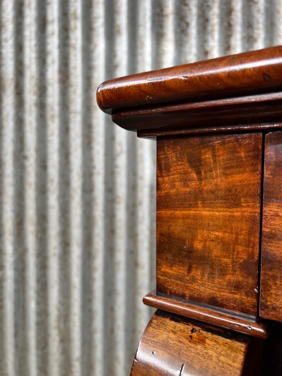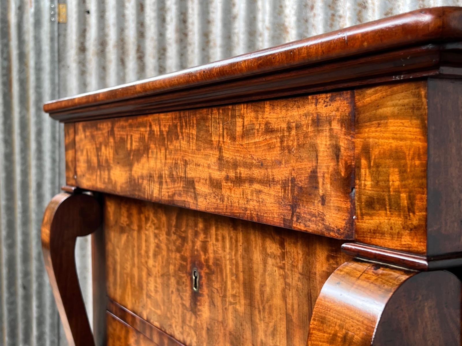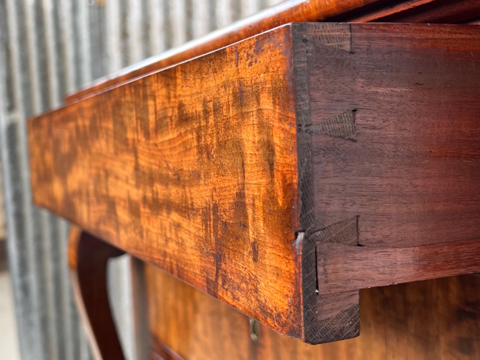 Mahonie ladekast of commode met kap waarin een verborgen of blinde lade. Bijzondere daar aan is dat de lade zelf gemaakt is van massief mahonie. Zie de foto’s. Daaronder 3 laden met slot, bovenste lade vergrendelt ook de bovenste ‘blinde’ lade.