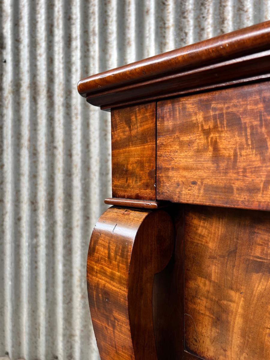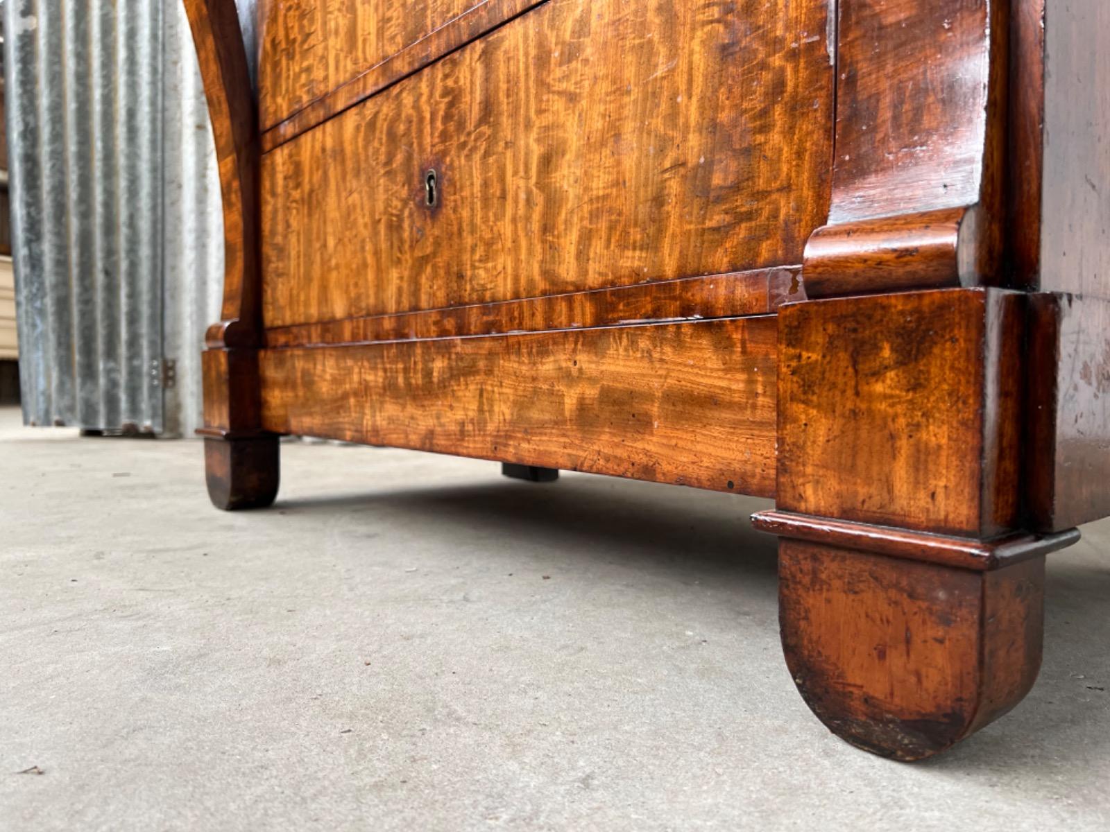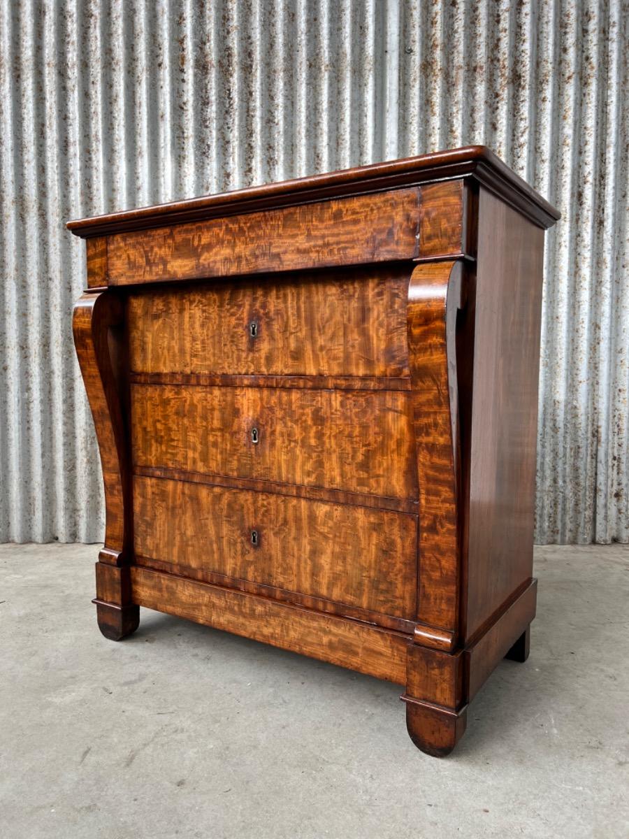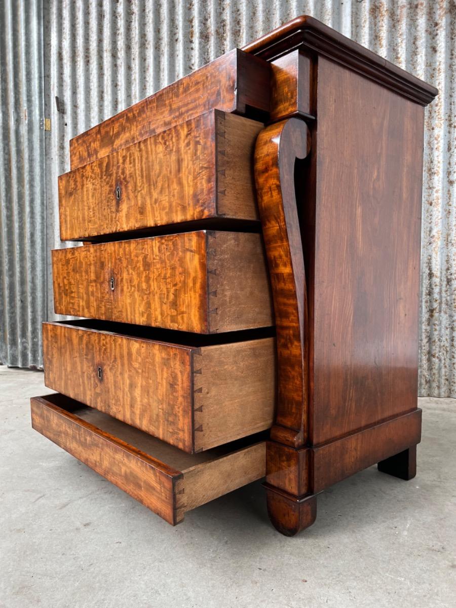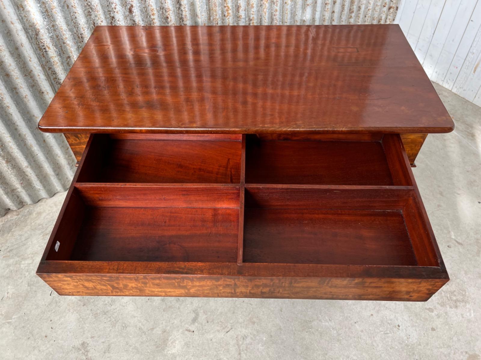 Mahonie ladekast of commode met kap waarin een verborgen of blinde lade. Bijzondere daar aan is dat de lade zelf gemaakt is van massief mahonie. Zie de foto’s. Daaronder 3 laden met slot, bovenste lade vergrendelt ook de bovenste ‘blinde’ lade.