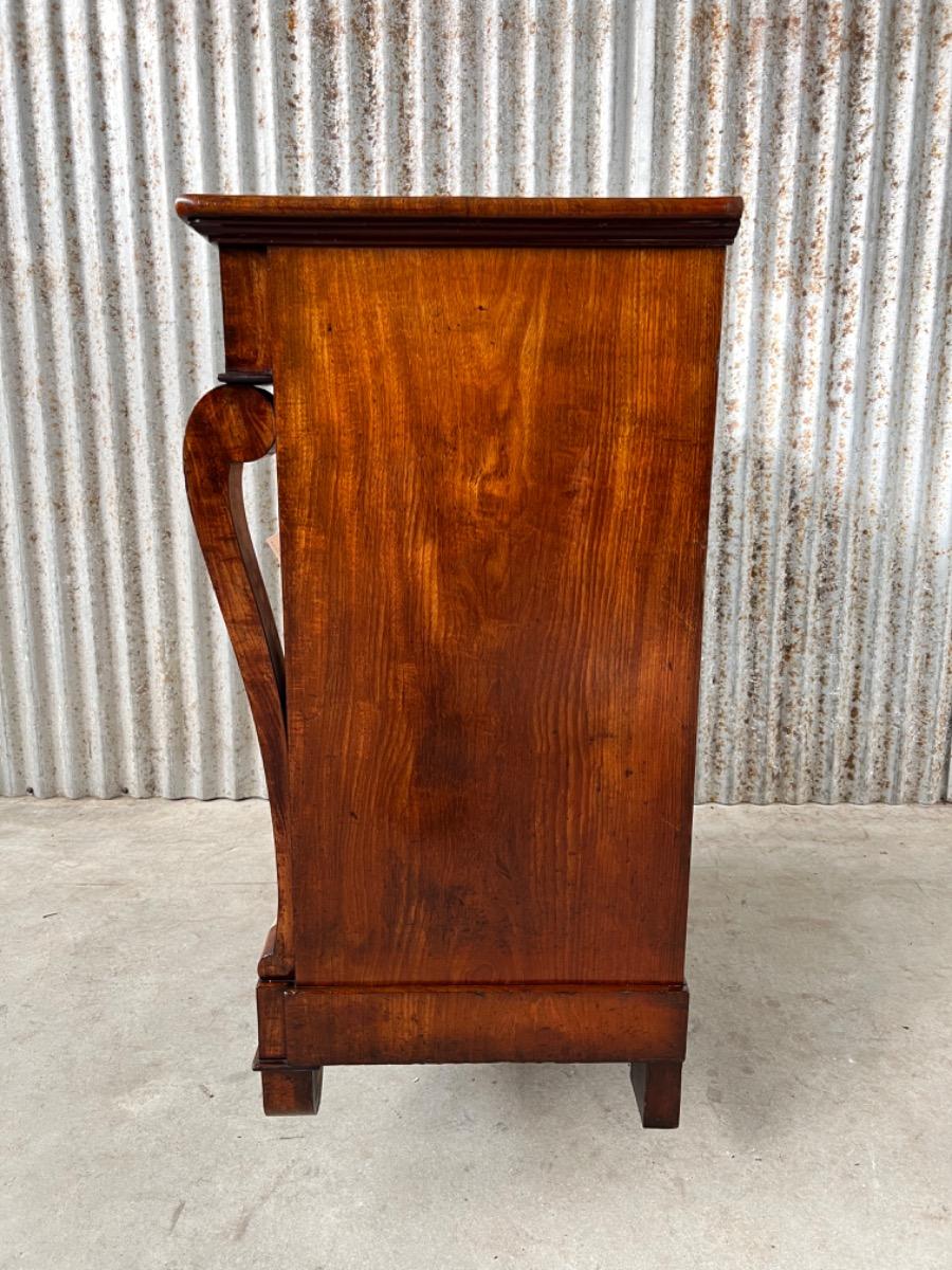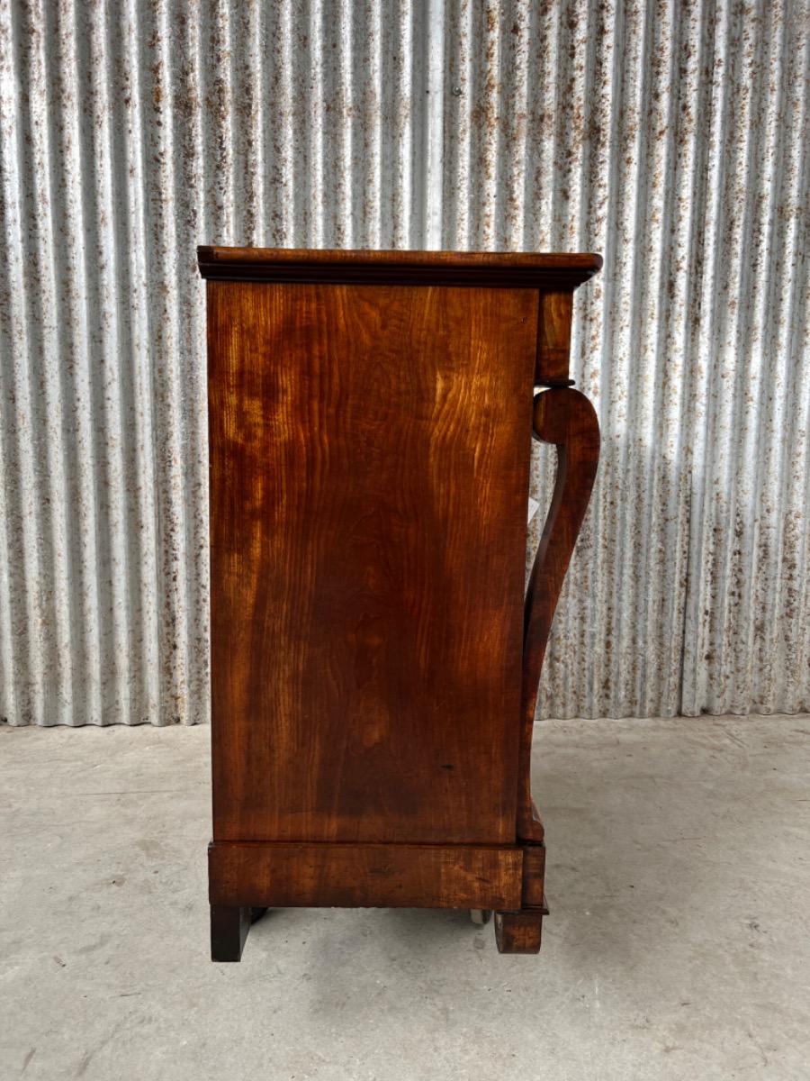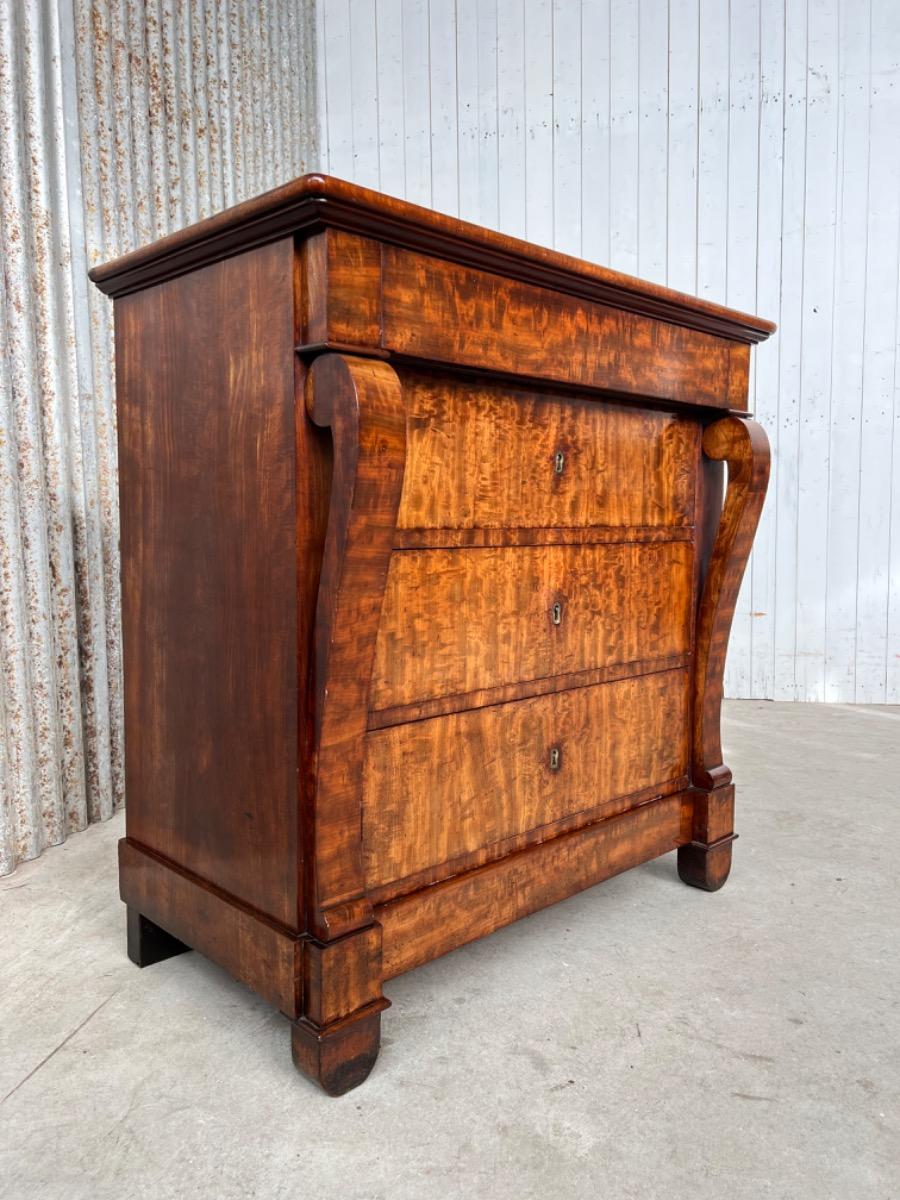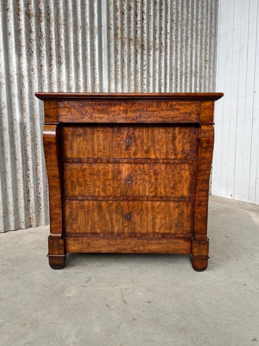 Mahonie ladekast of commode met kap waarin een verborgen of blinde lade. Bijzondere daar aan is dat de lade zelf gemaakt is van massief mahonie. Zie de foto’s. Daaronder 3 laden met slot, bovenste lade vergrendelt ook de bovenste ‘blinde’ lade.
