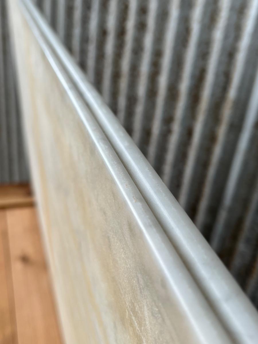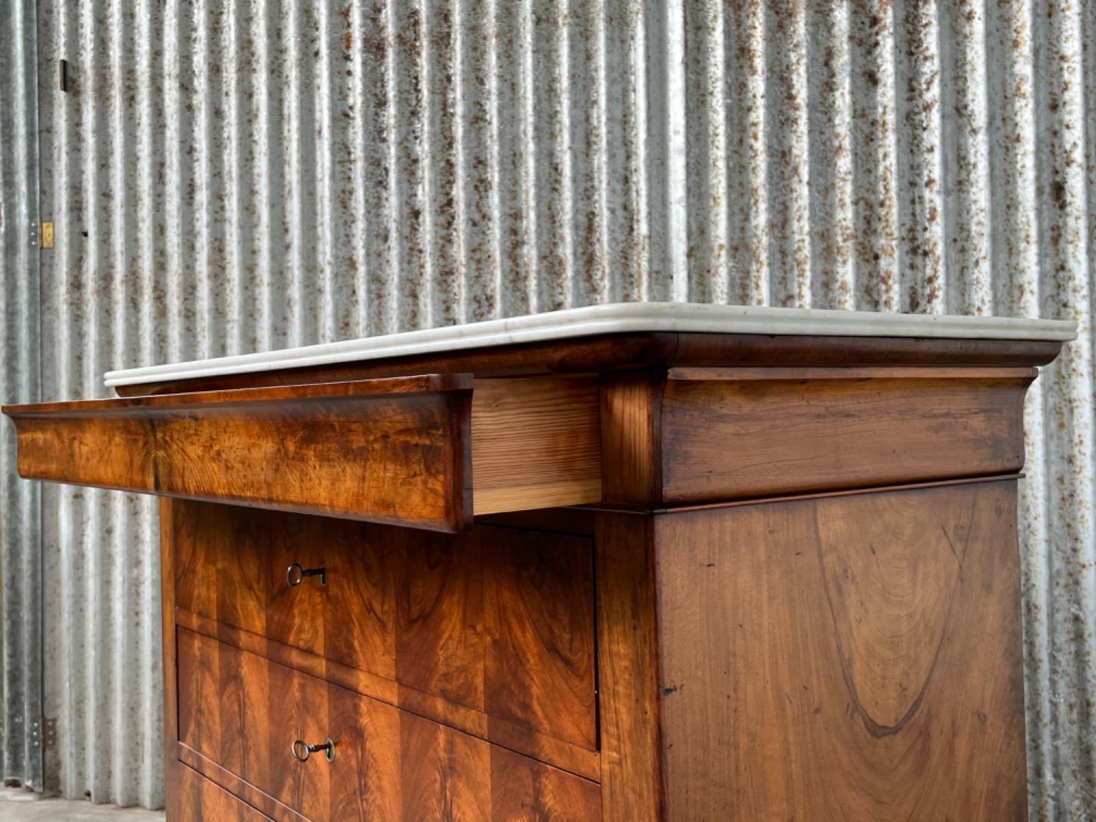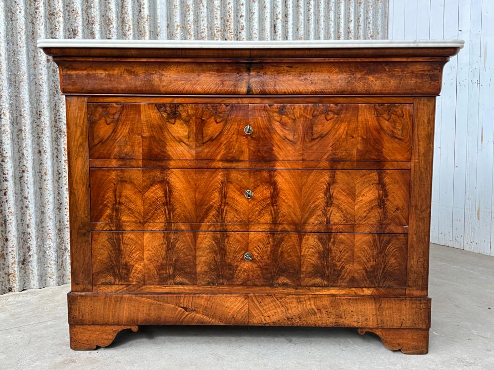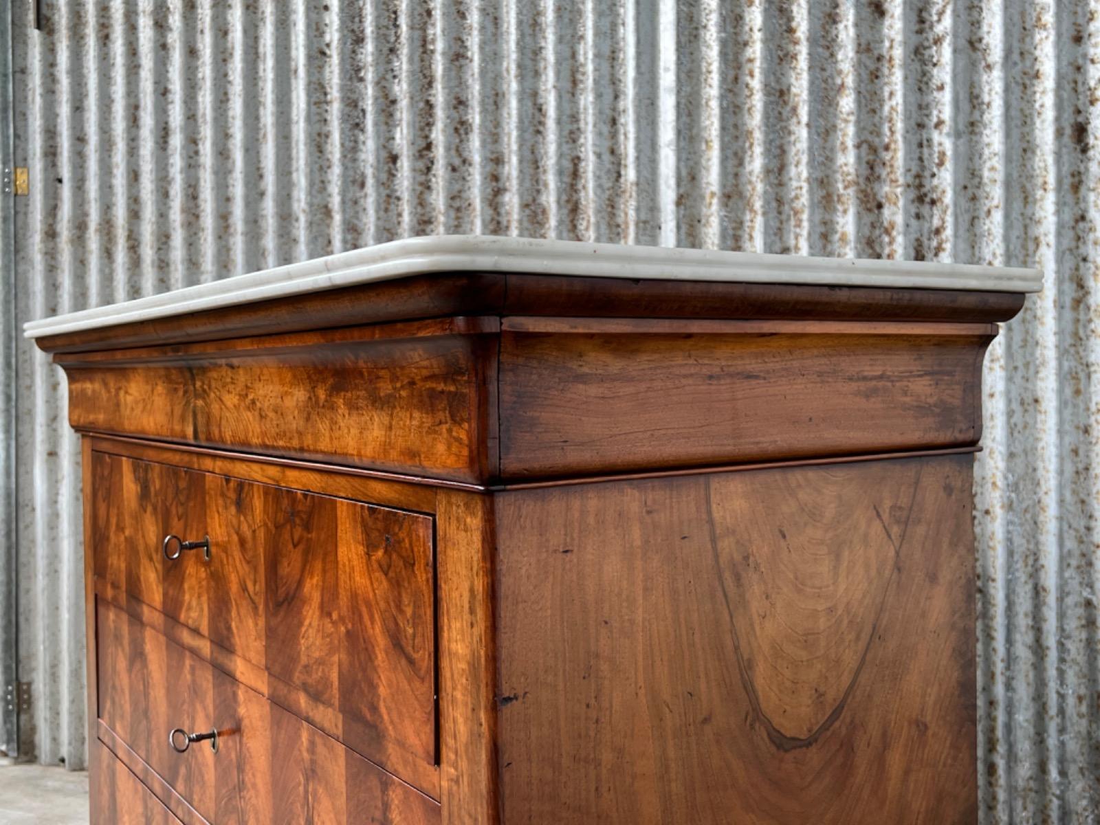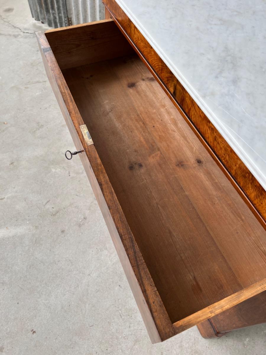 Noten commode Louis Philippe ladekast Bovenste lade is een "blinde" lade, greeploos, waaronder 3 laden met werkende en ‘gestempelde of gemerkte’ sloten van ‘Laurent’ (zie foto’s) Verticaal gespiegeld noten fineer op zachthout. Ronde messing entreé’s. (Compleet) Bianca Carrara marmer, gekapt aan de achterkant, niet gebroken ook niet geweest. Meubel verkeert in zeer goede en direct te gebruiken staat, de 4 laden lopen goed. Frankrijk circa 1820 -1840. Afm: H= 93 cm. B= 108 - 120 cm. (smalst- breedst) D= 48 - 55 cm. (ondiepst-diepst) Onlangs grondig nagelopen op losse delen van constructie en fineer. Geen levende houtworm aangetroffen op 13/3/2023 Comm-2567~