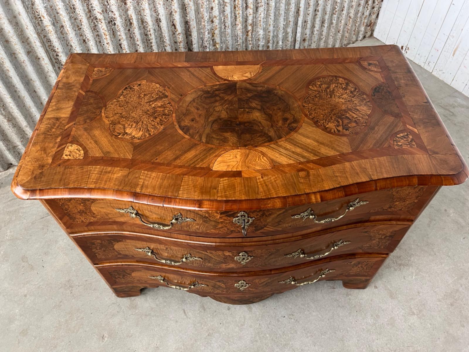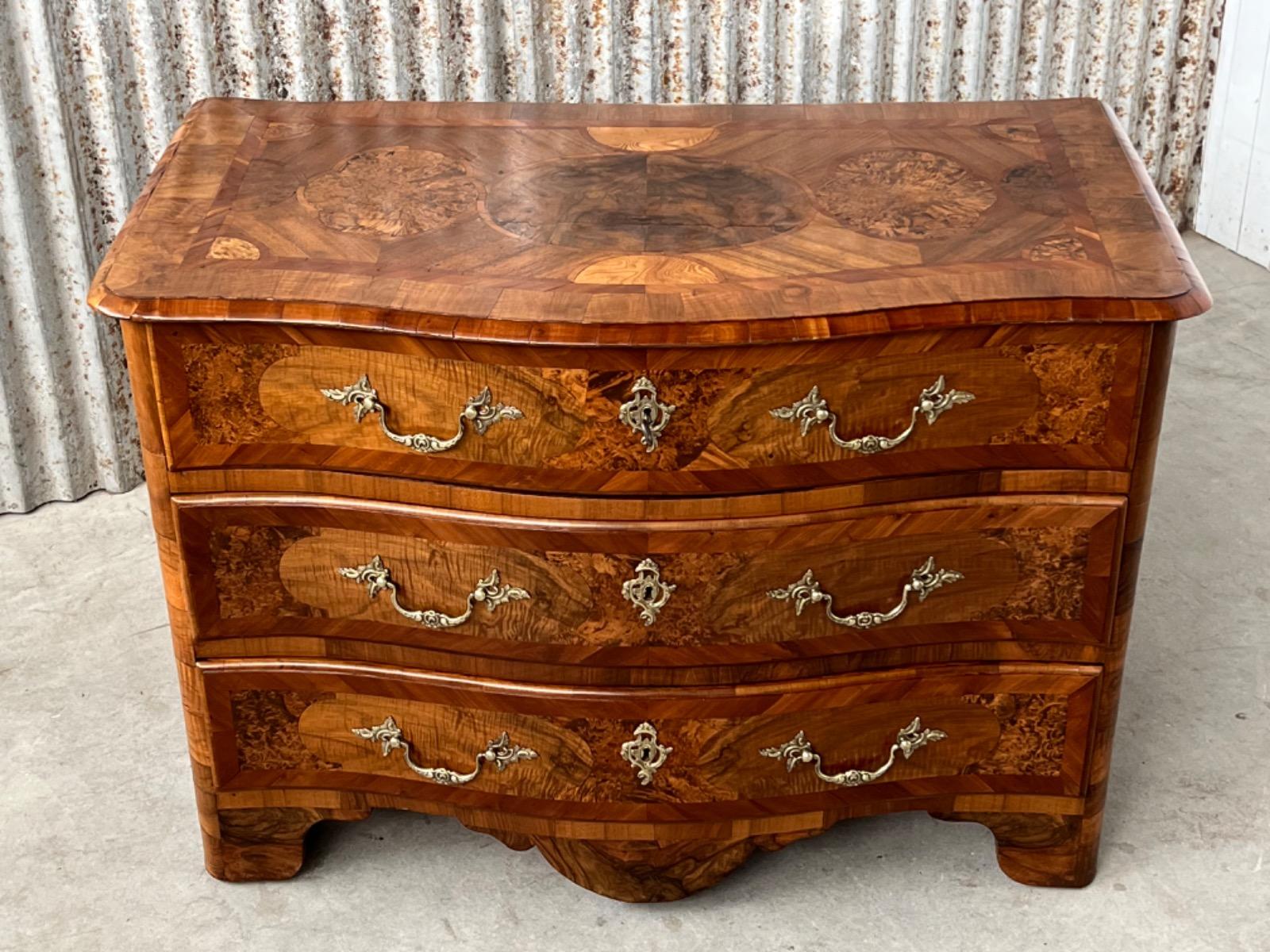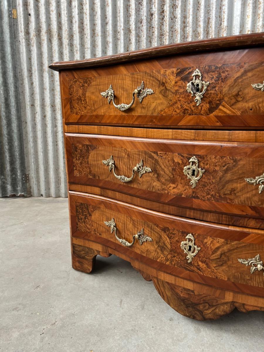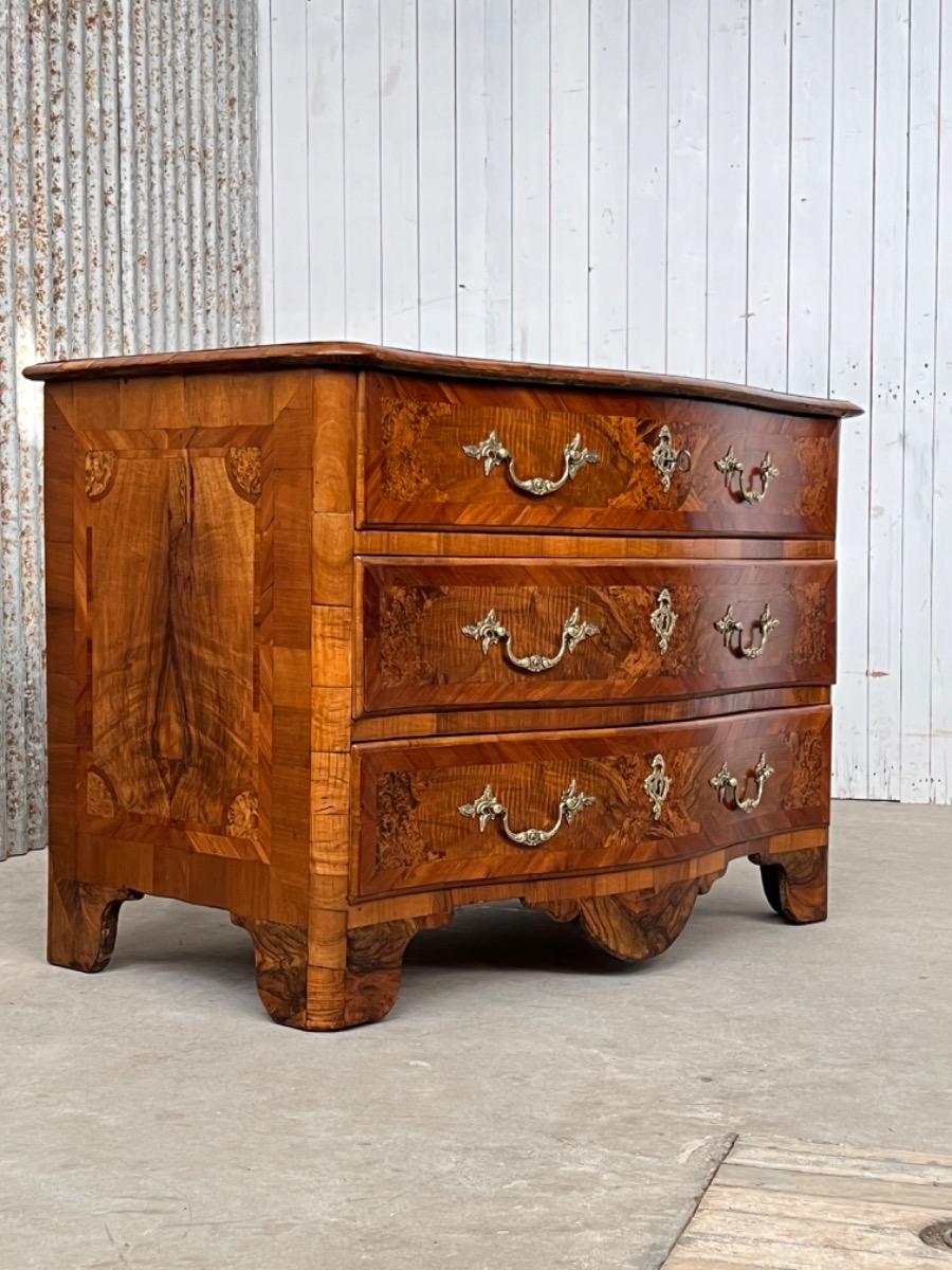 Noten Louis XIV ladekast ‘Du Dauphiné’ met gegoten messing beslag. Licht gebogen laden met, inlegwerk. Gecontouneerd blad en "breacket poten". Achterwand en laden (bodems) van spar/den. Vroeg 18e eeuws notenhouten meubel met inlegwerk van berkenwortel, taxus, kersen en essenhout. Dik ingelegd bovenblad met daaronder drie grote laden, eveneens ingelegd. Alle oorspronkelijke sloten aanwezig er werkend met oorspronkelijke sleutel. Frankrijk, mogelijk Zwitsers Goede kwaliteit, omstreeks 1740-1760. Afm: H= 83cm. B= 119 cm. D= 57-67 cm. (Min-max maten) Onlangs grondig nagelopen op losse delen van constructie en fineer. Houtworm controle : Geen levende houtworm aangetroffen op 9/1/2024 com-2738~