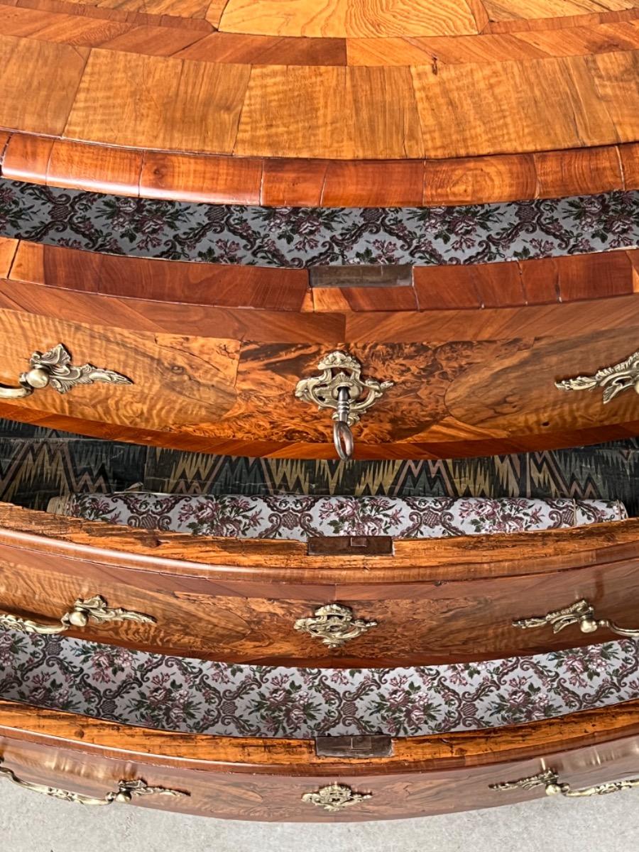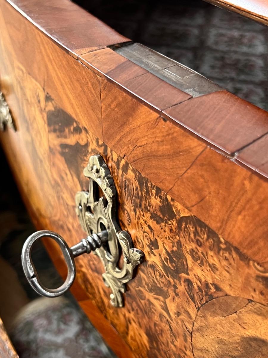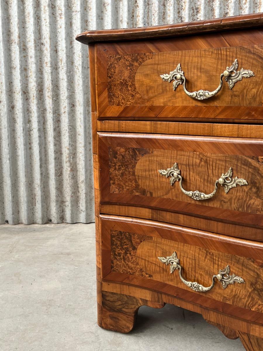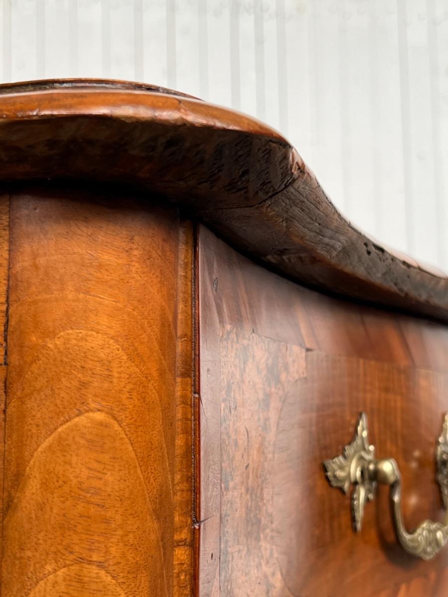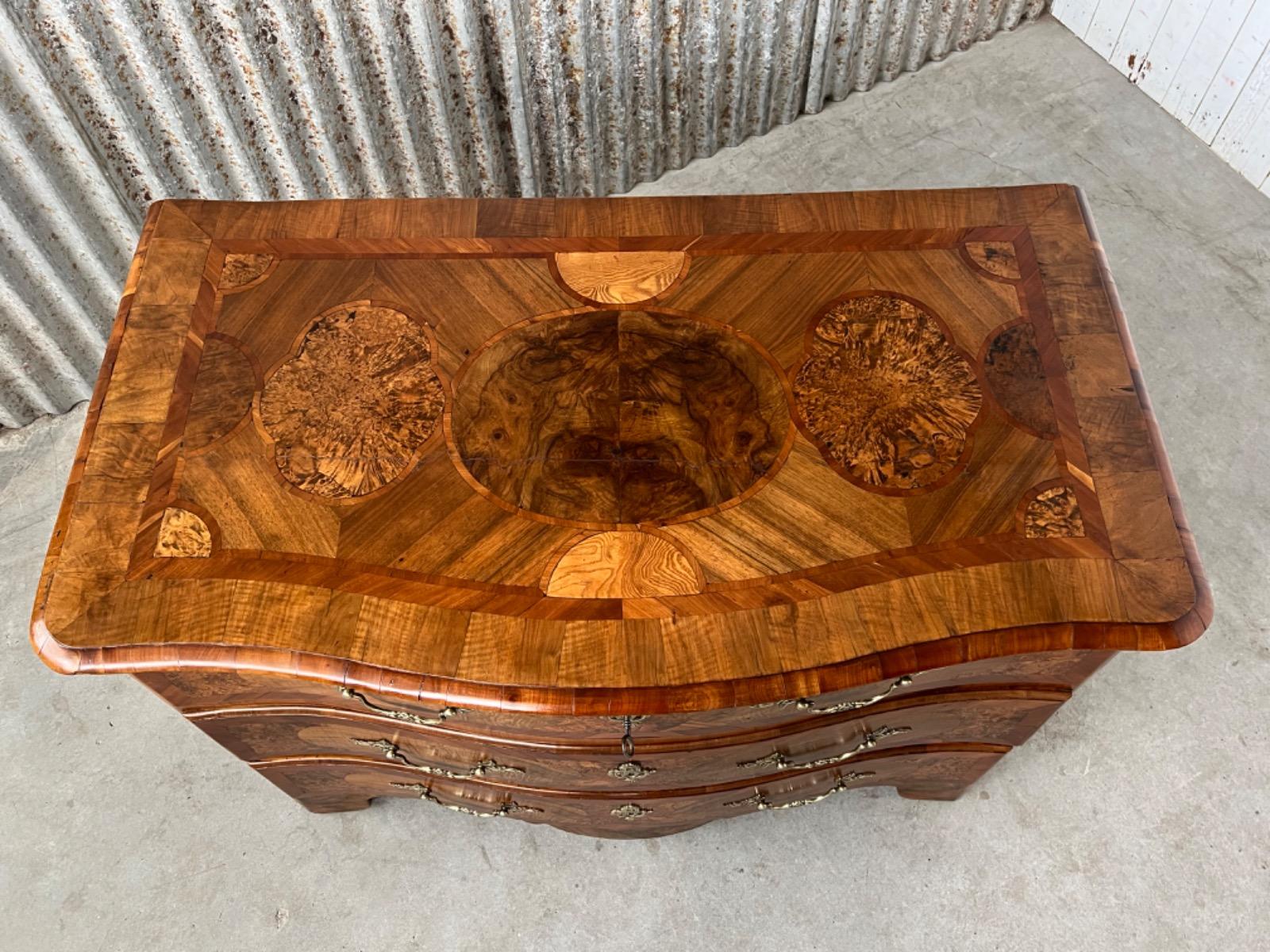 Noten Louis XIV ladekast ‘Du Dauphiné’ met gegoten messing beslag. Licht gebogen laden met, inlegwerk. Gecontouneerd blad en "breacket poten". Achterwand en laden (bodems) van spar/den. Vroeg 18e eeuws notenhouten meubel met inlegwerk van berkenwortel, taxus, kersen en essenhout. Dik ingelegd bovenblad met daaronder drie grote laden, eveneens ingelegd. Alle oorspronkelijke sloten aanwezig er werkend met oorspronkelijke sleutel. Frankrijk, mogelijk Zwitsers Goede kwaliteit, omstreeks 1740-1760. Afm: H= 83cm. B= 119 cm. D= 57-67 cm. (Min-max maten) Onlangs grondig nagelopen op losse delen van constructie en fineer. Houtworm controle : Geen levende houtworm aangetroffen op 9/1/2024 com-2738~