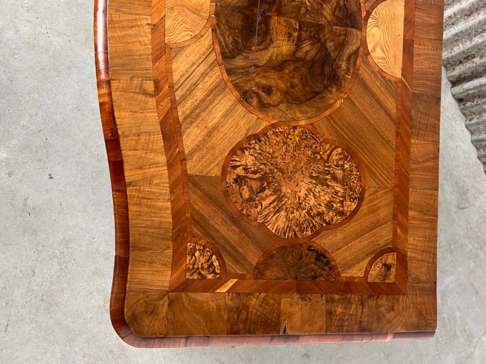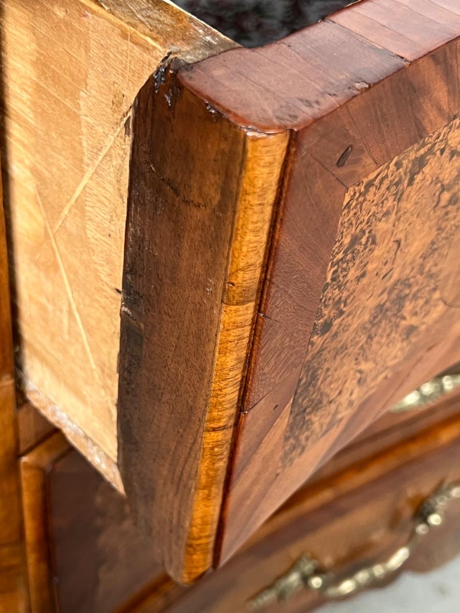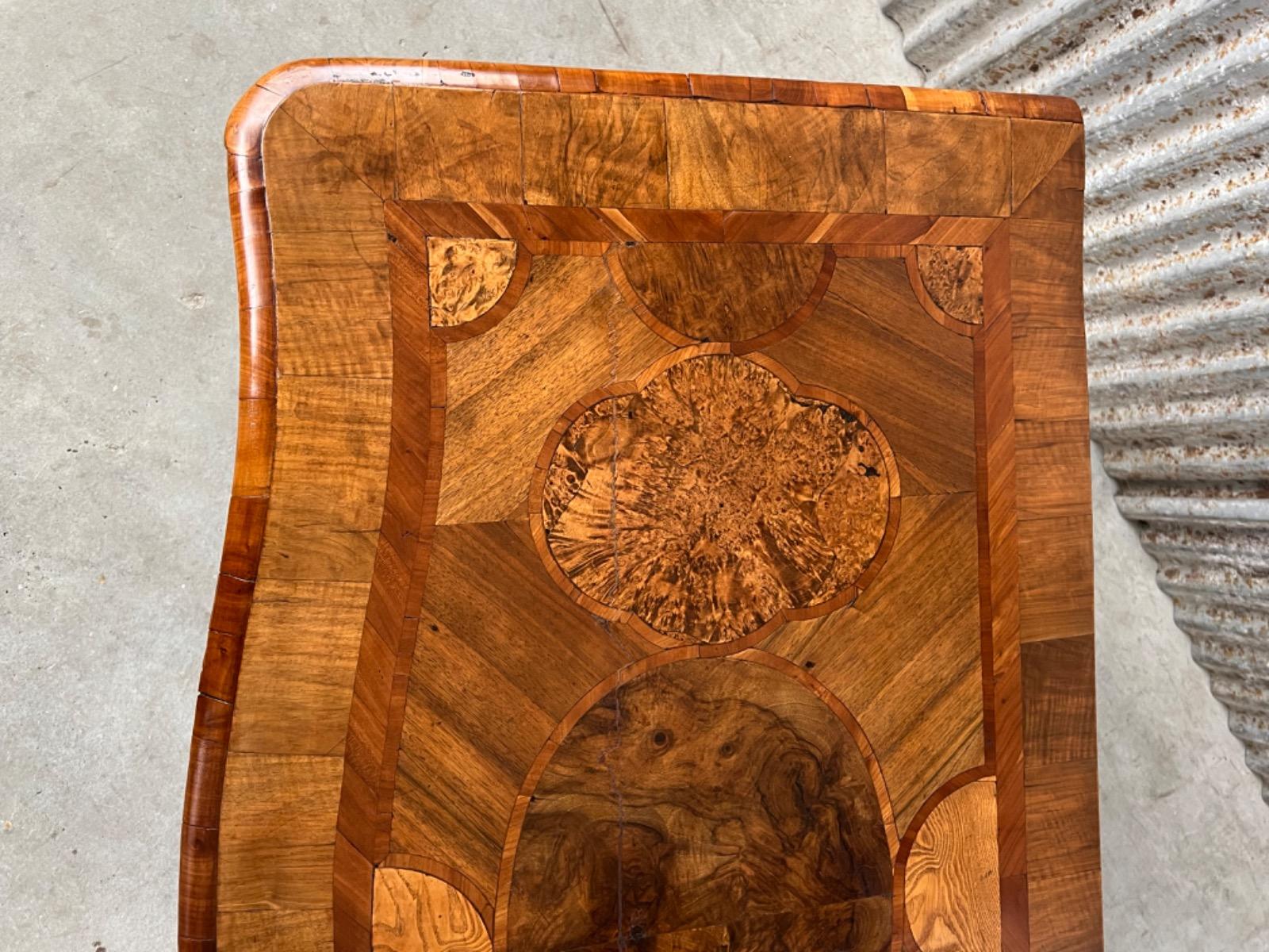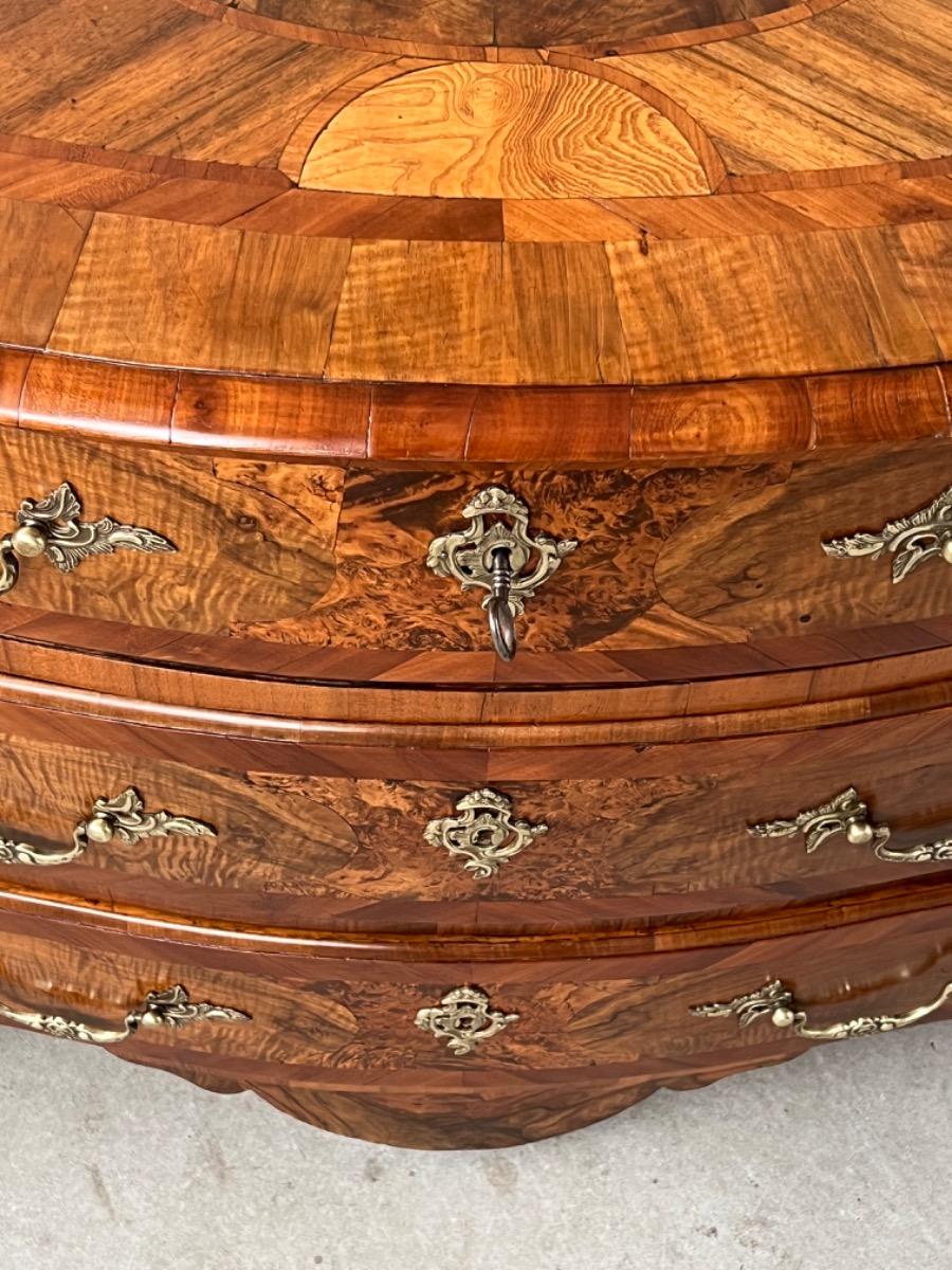 Noten Louis XIV ladekast ‘Du Dauphiné’ met gegoten messing beslag. Licht gebogen laden met, inlegwerk. Gecontouneerd blad en "breacket poten". Achterwand en laden (bodems) van spar/den. Vroeg 18e eeuws notenhouten meubel met inlegwerk van berkenwortel, taxus, kersen en essenhout. Dik ingelegd bovenblad met daaronder drie grote laden, eveneens ingelegd. Alle oorspronkelijke sloten aanwezig er werkend met oorspronkelijke sleutel. Frankrijk, mogelijk Zwitsers Goede kwaliteit, omstreeks 1740-1760. Afm: H= 83cm. B= 119 cm. D= 57-67 cm. (Min-max maten) Onlangs grondig nagelopen op losse delen van constructie en fineer. Houtworm controle : Geen levende houtworm aangetroffen op 9/1/2024 com-2738~